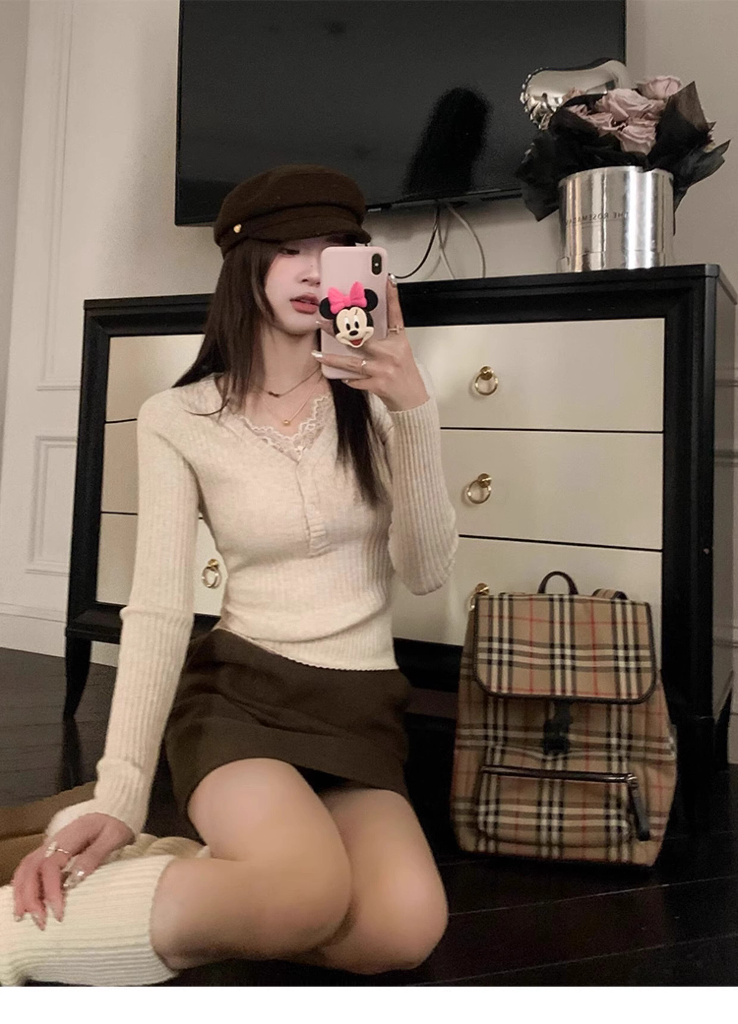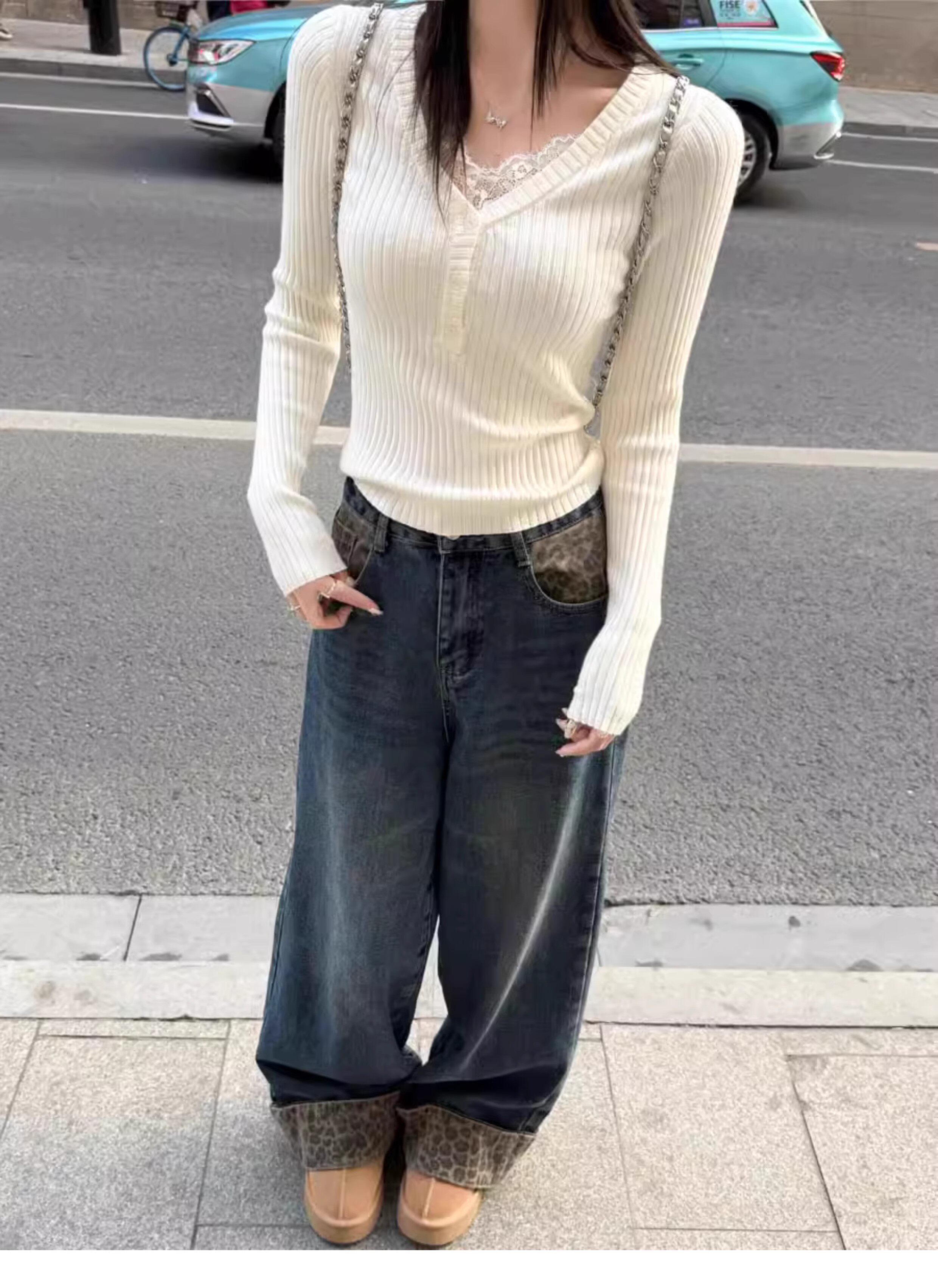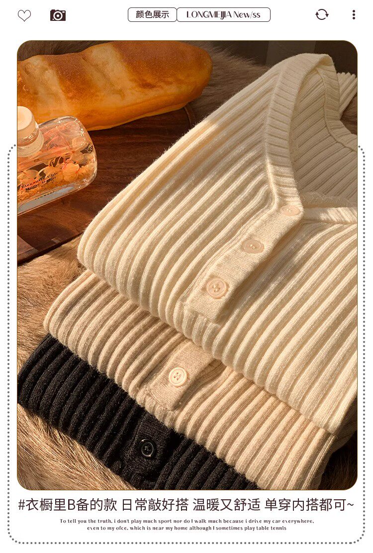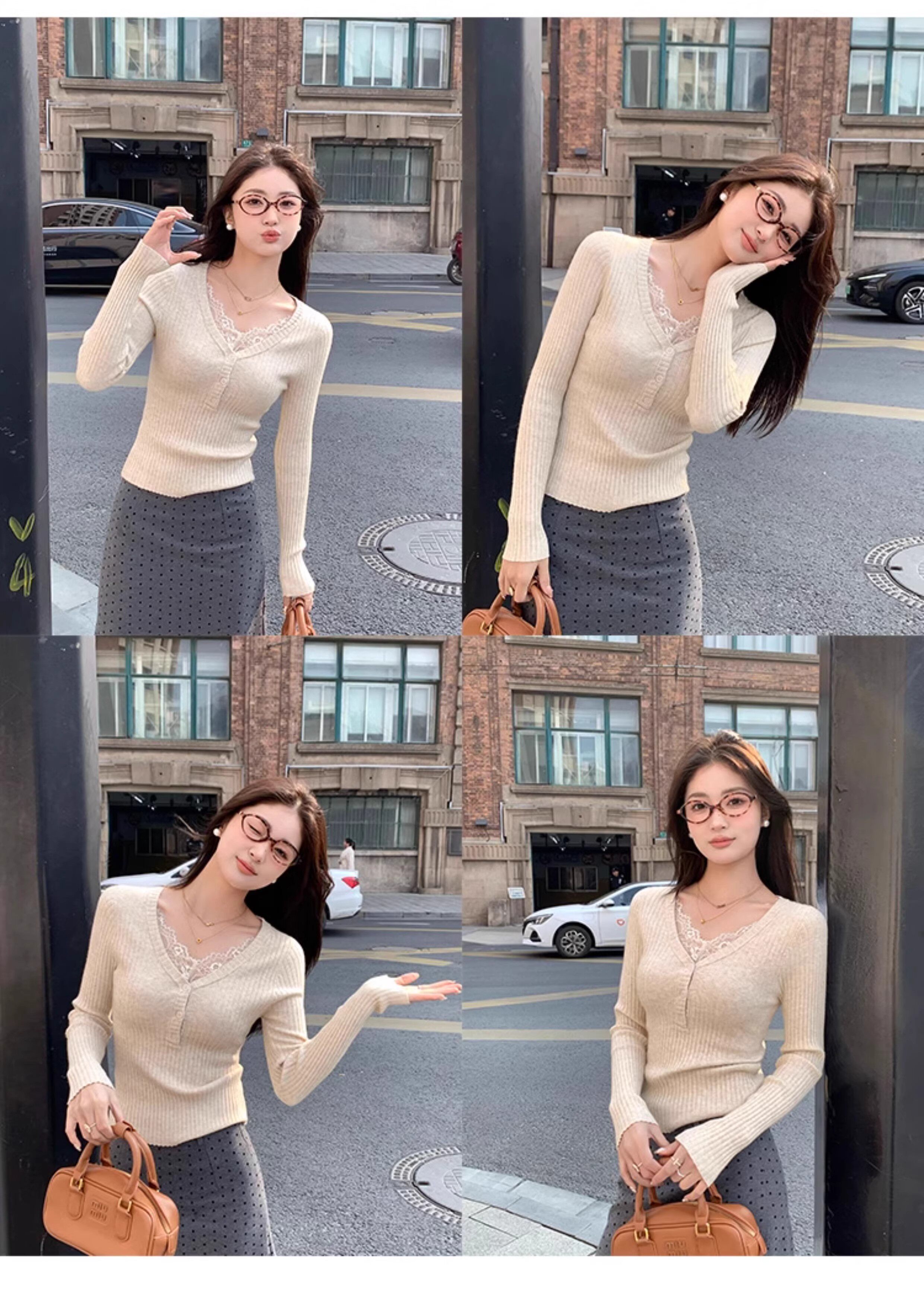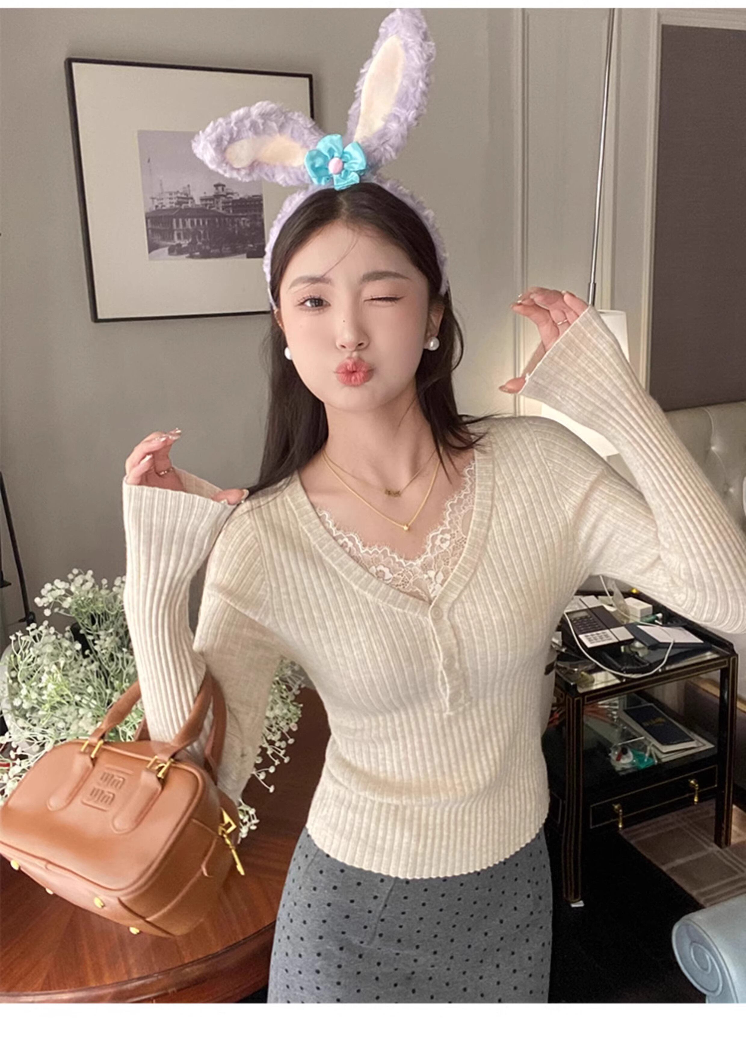 Fake Two-Piece Lace Trim Patchwork Knit Top for Women, Autumn and Winter Pure Desire Style, Spicy Girl V-Neck Long-Sleeve Inner Wear
