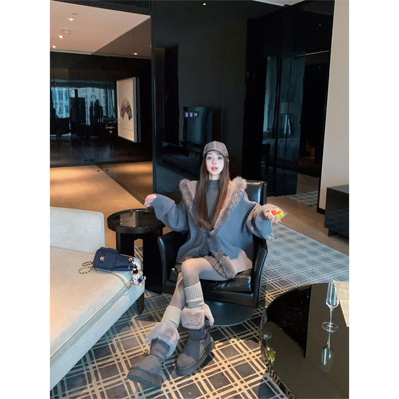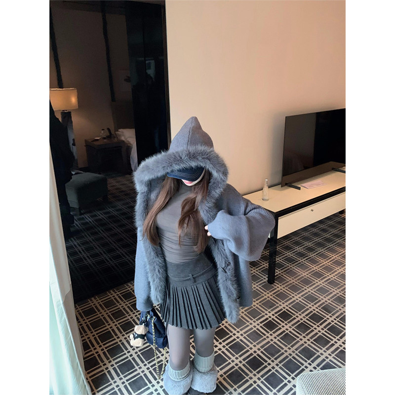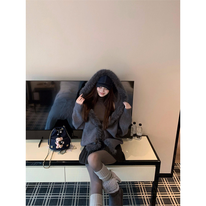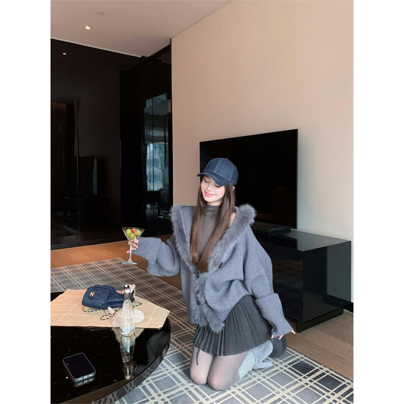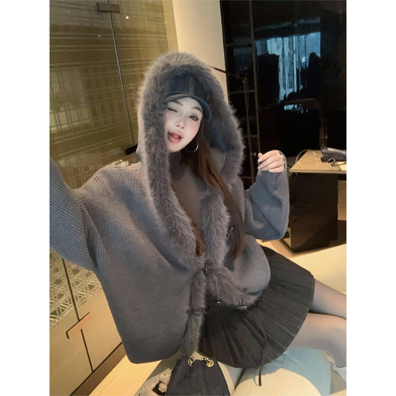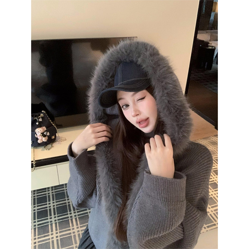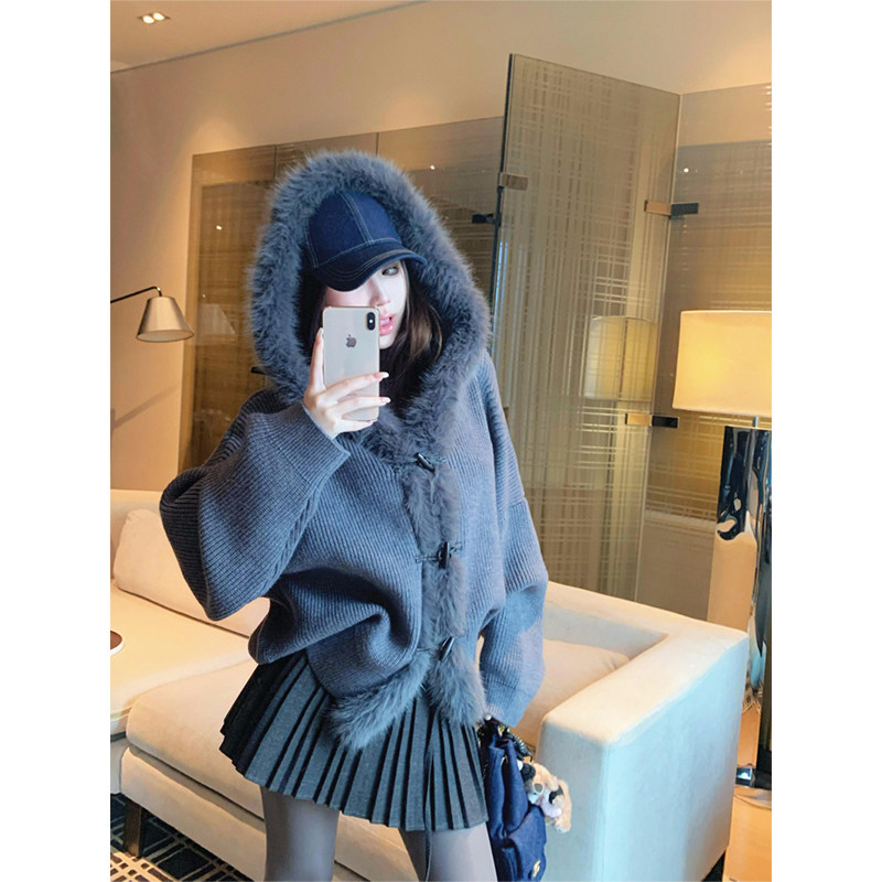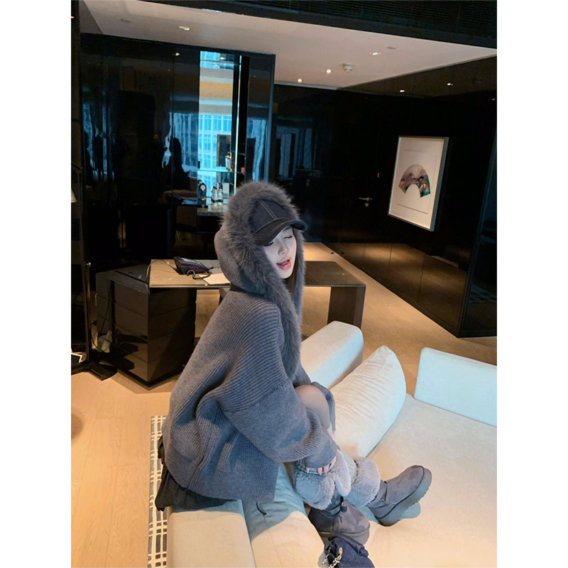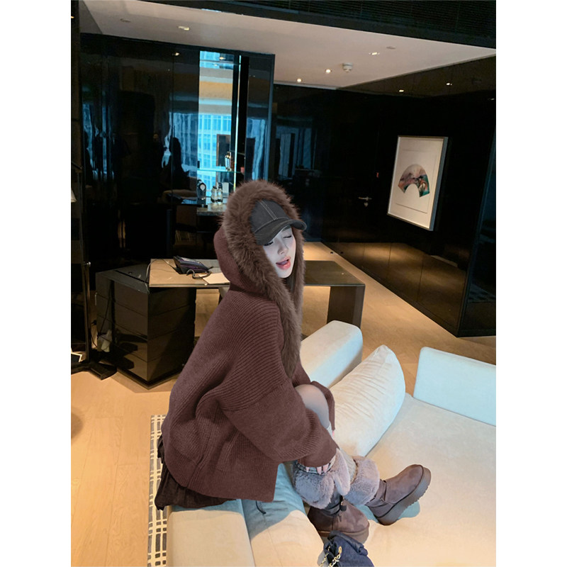 American Hot Girl Big Fur Collar Sweater Coat Women's Winter New Retro Design Lazy Loose Knitted Cardigan