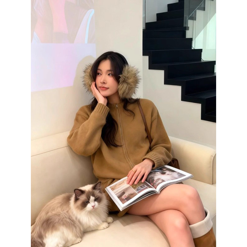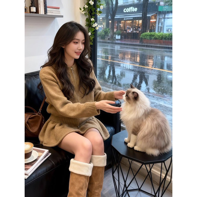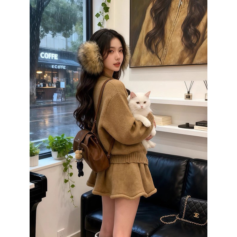 Autumn and winter ootd wear a complete Korean style relaxed feeling lazy soft waxy knitted cardigan sweater skirt suit