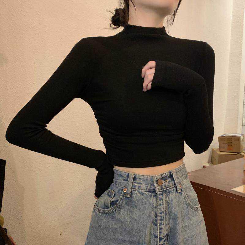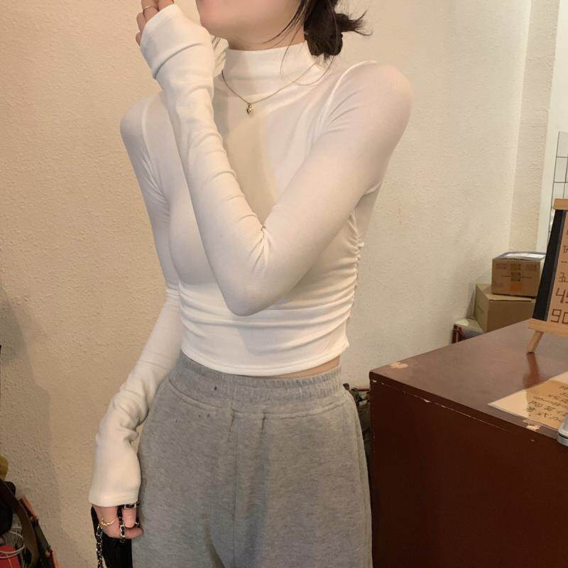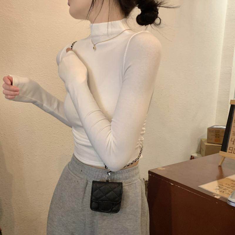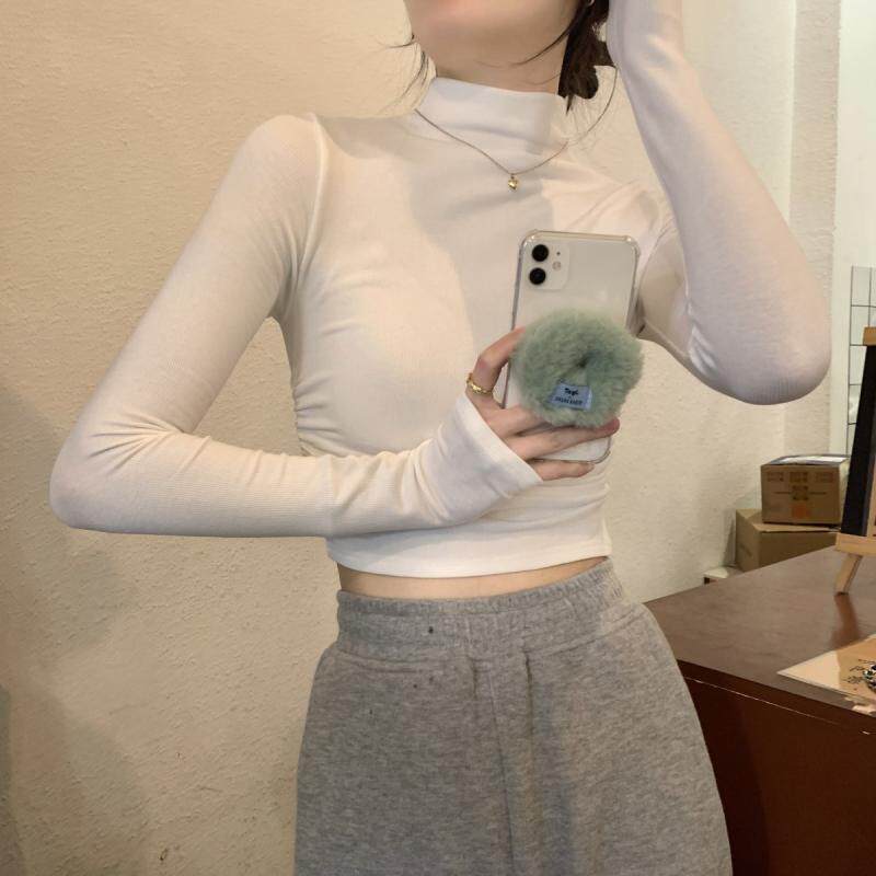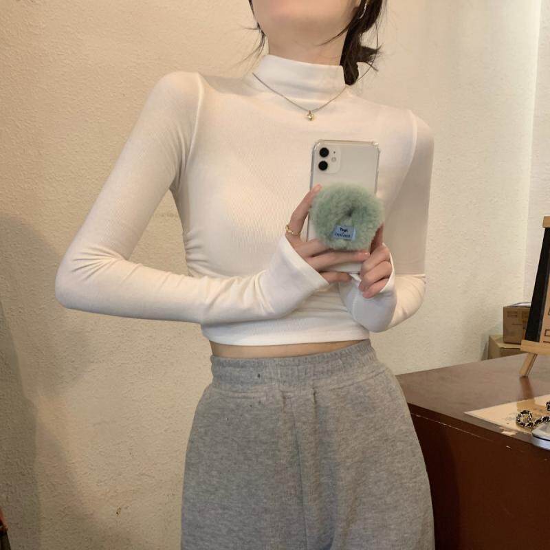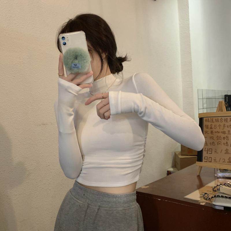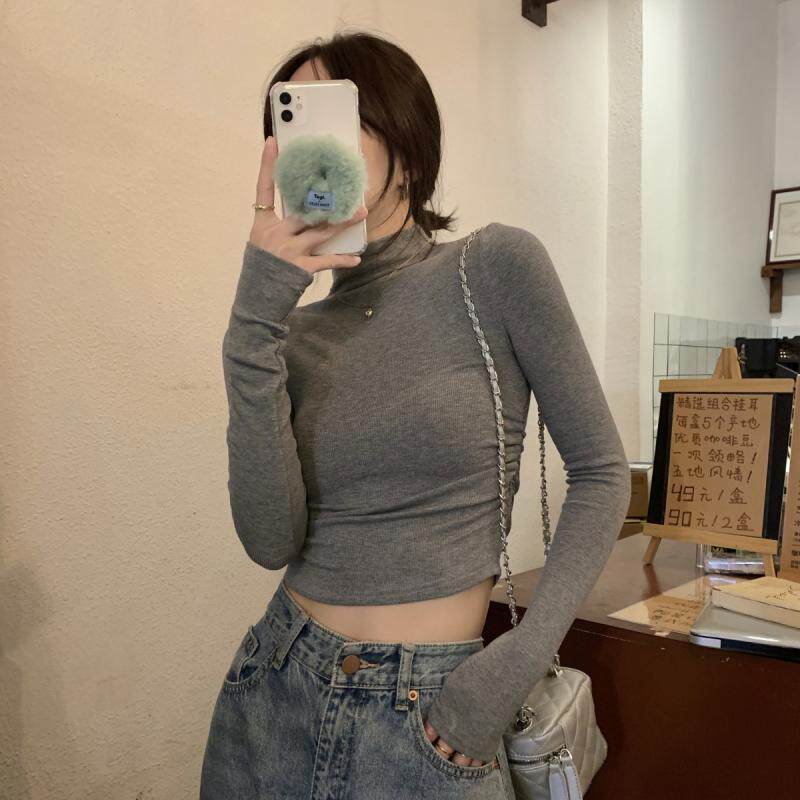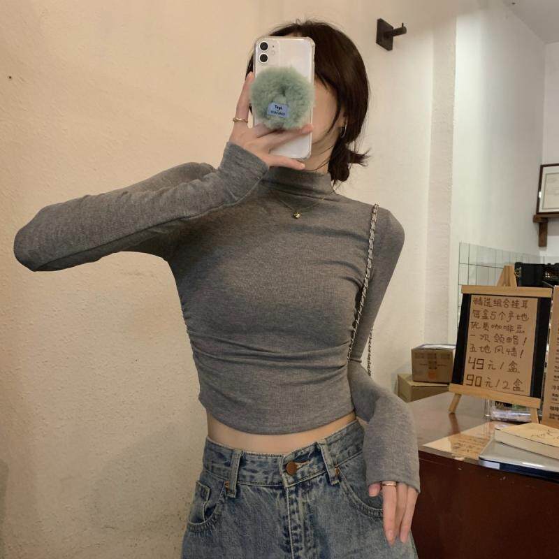 Gray Half-Turtleneck Long-Sleeve T-Shirt for Women, Autumn and Winter American Style, Slim-Fit Short Base Shirt with a High-End Feel, Inner Layer Top