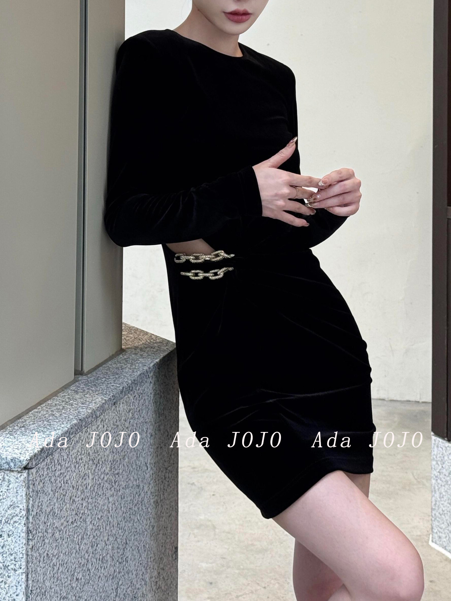 Black Round-Neck Slim-Fit Dress with a Waist-Revealing Design, Mature and High-End Feel, 2025 Winter New Long-Sleeve Dress for Women