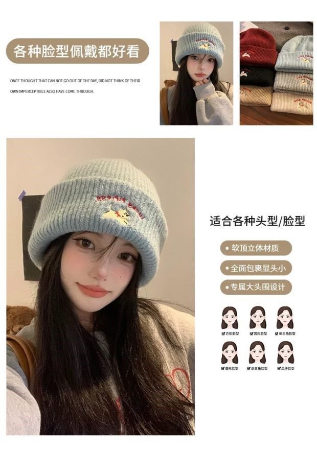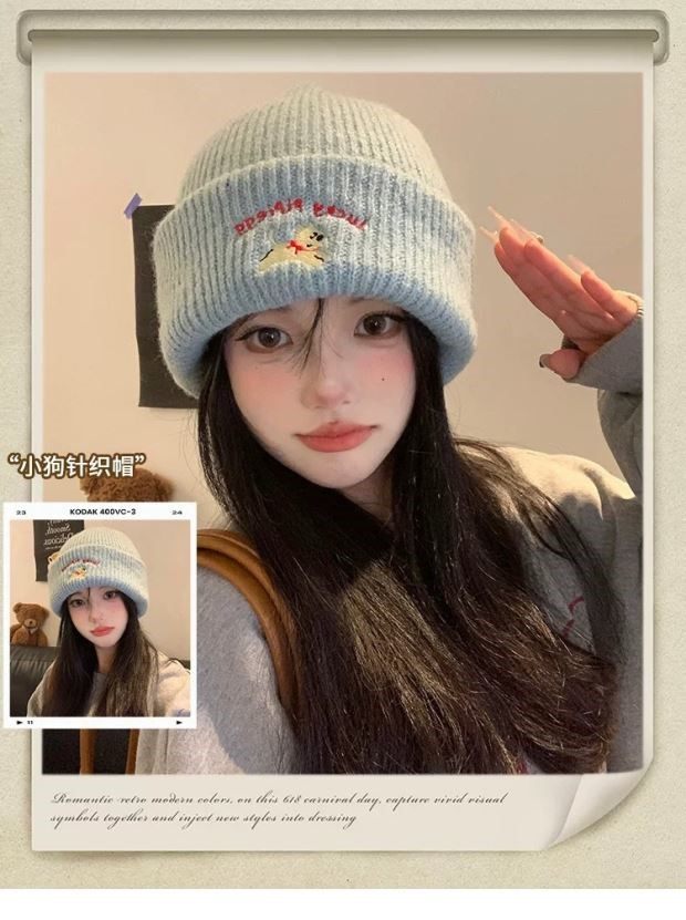 Blue Salt-Style Cute Puppy Embroidered Knitted Wool Hat, New Autumn and Winter Model for Women, Makes the Face Look Smaller, Versatile Beanie for Large Head Circumference