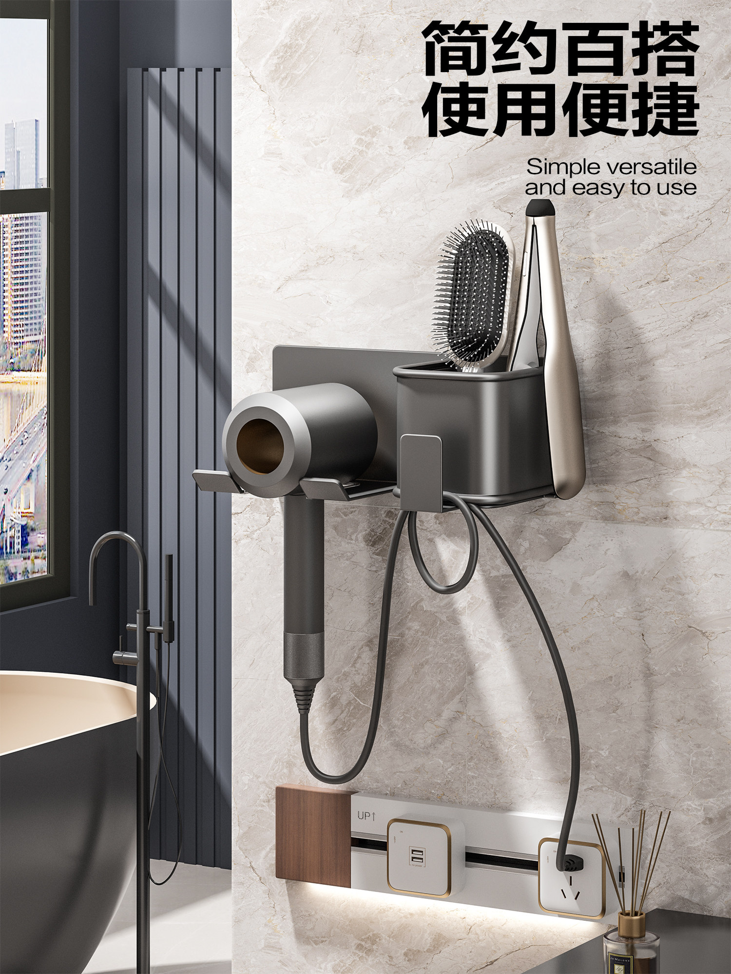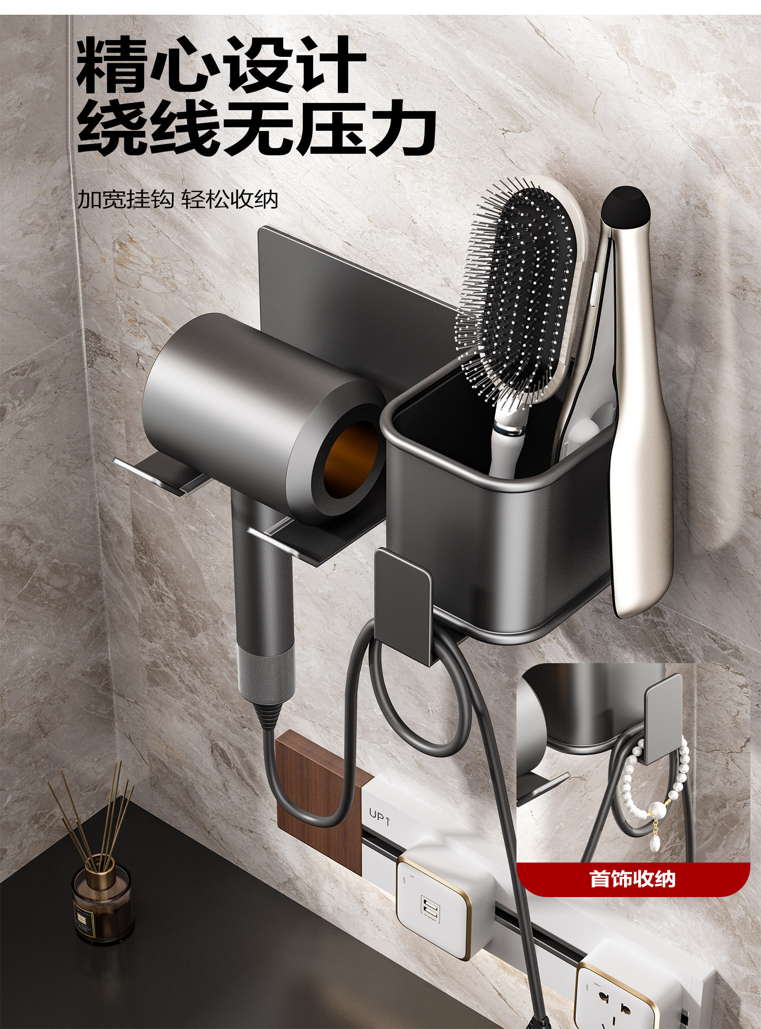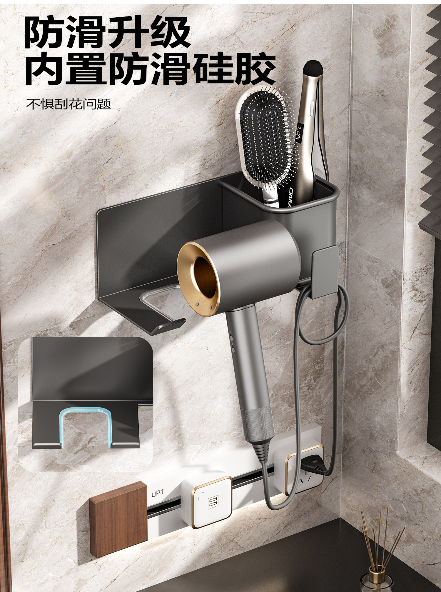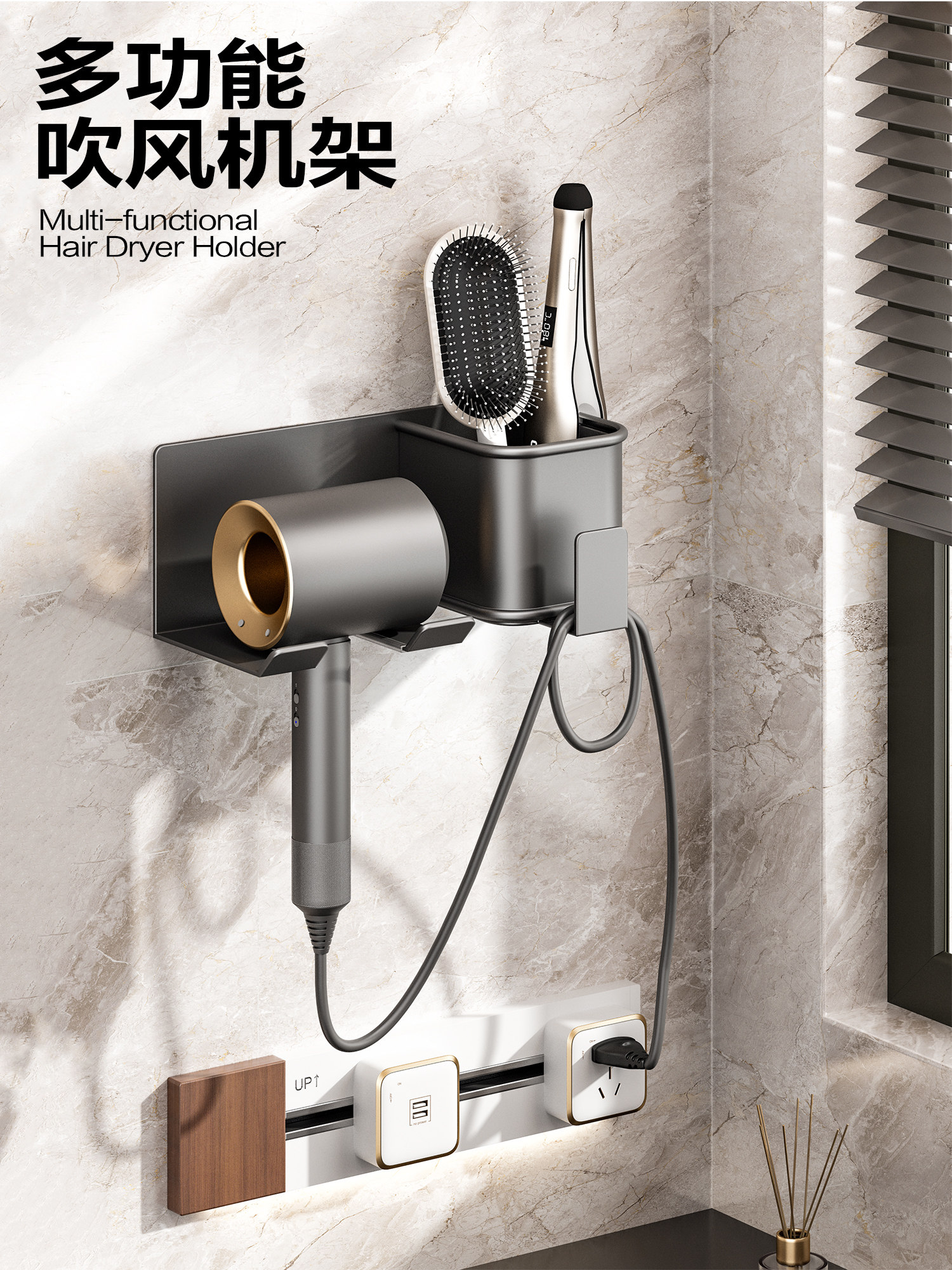 Hair Dryer Holder, No-Drill Bathroom Hair Dryer Stand, Wall-Mounted Bathroom Hair Dryer Storage Rack