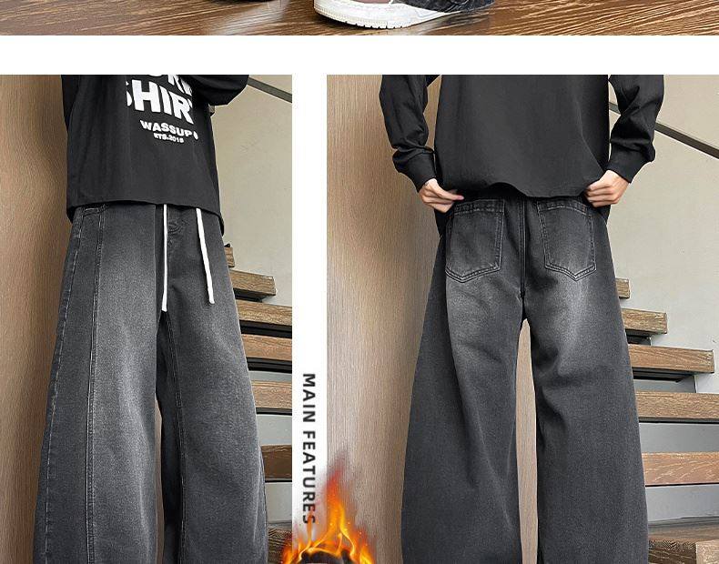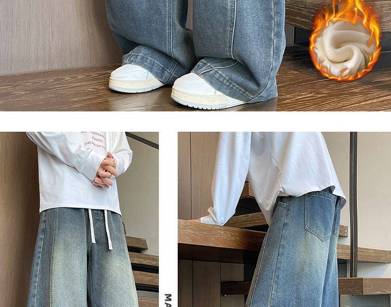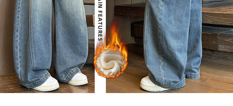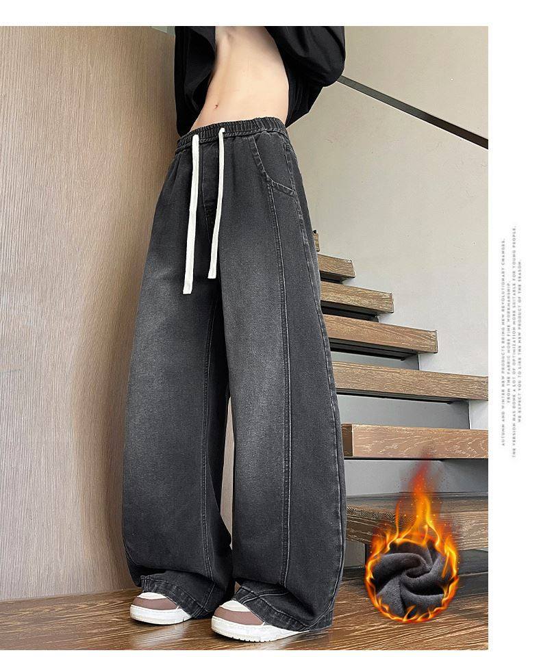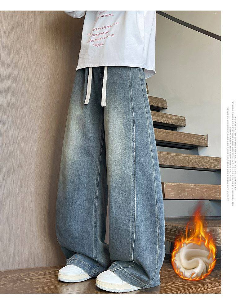 American Scimitar Jeans Men's Autumn and Winter Velvet Thickened Wide Leg Pants Men's Retro Washed Casual Straight Pants