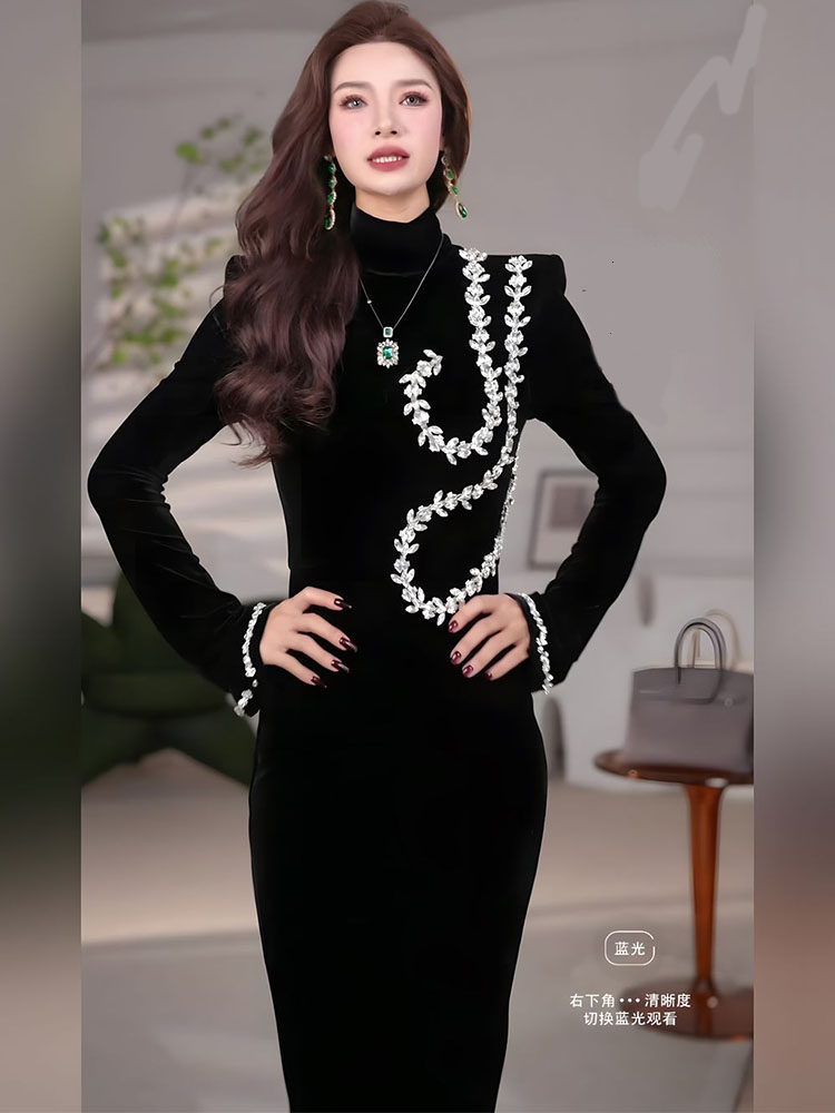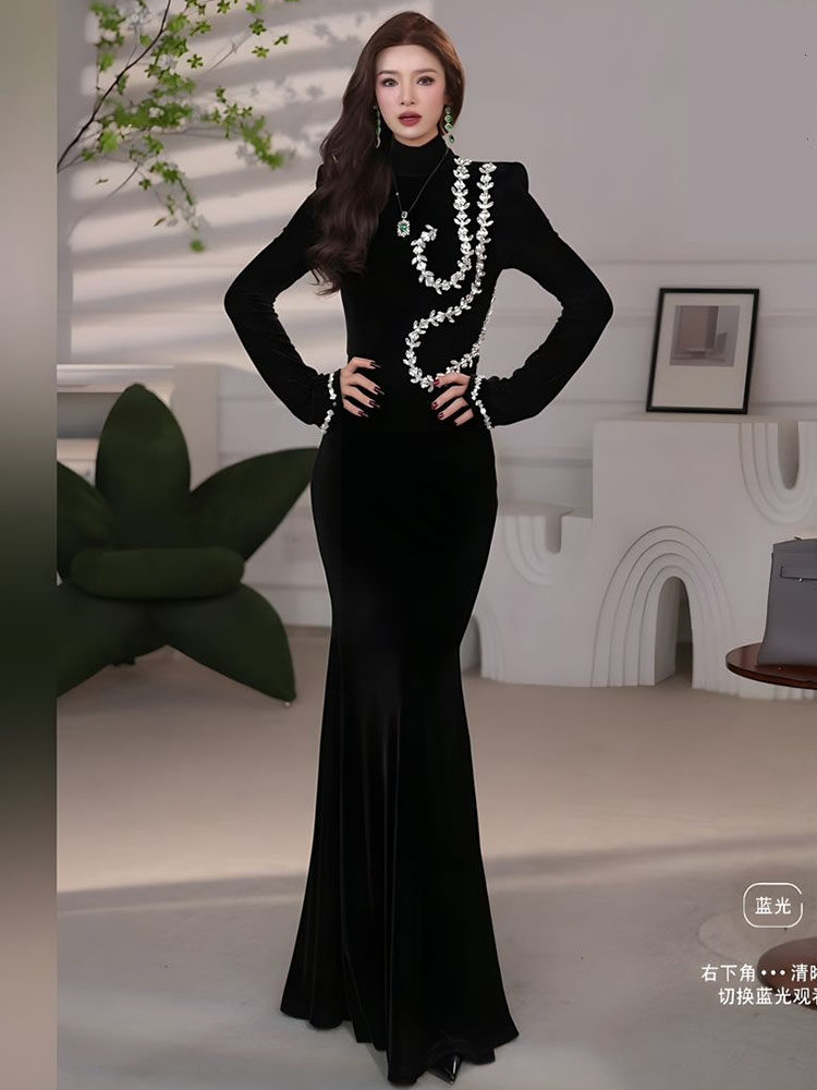 Mijie's New Autumn and Winter Fashion Ladylike Black Diamond Chain Bodycon Dress for Women, Long-Sleeved High-Neck Waist-Cinching Fishtail Long Dress