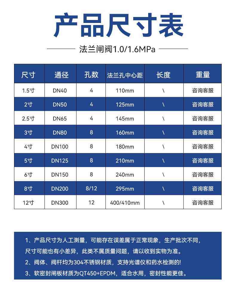 Color Classification Dn40 Stainless Steel Soft Seal Gate Valve,Dn50 National Standard Cost-Effective Model - 7.75kg -175Mm - Two-Year Warranty,Dn65 National Standard Cost-Effective Model - 9.75kg -185Mm - Two-Year Warranty,Dn80 National Standard Cost-Effective Model - 10.85kg -200Mm - Two-Year Warranty,Dn100 National Standard Cost-Effective Model - 12kg -225Mm - Two-Year Warranty,Dn150 National Standard Cost-Effective Model - 23kg -263Mm - Two-Year Warranty,Dn50 National Standard Roughly - 7.5kg -175Mm - Three-Year Warranty,Dn65 National Standard Roughly - 9kg -185Mm - Three-Year Warranty,Dn80 National Standard Roughly - 11.25kg -197Mm - Three-Year Warranty,Dn100 National Standard Pipe - 15.5kg - 222mm - 3-Year Warranty,Dn125 National Standard General - 21kg -254Mm - Three-Year Warranty,Dn150 National Standard General - 25kg -263Mm - Three-Year Warranty,Dn200 (12 Holes) National Standard Body - 42.5kg -291Mm - Three-Year Warranty,Dn200 (8 Holes) National Standard Body - 42.5kg -291Mm - Three-Year Warranty,Dn50 (4 Holes) National Standard Enlarged Body - 10.5kg - Five-Year Warranty,Dn65 (4 Holes) National Standard Enlarged Body - 13kg - Five-Year Warranty,Dn80 National Standard Oversized Body - 16kg - 5-Year Warranty,Dn100 National Standard Oversized Body - 19kg - 5-Year Warranty,Dn125 National Standard Oversized Body - 27kg - 5-Year Warranty,Dn150 National Standard Oversized Body - 37kg - 5-Year Warranty,Dn200 National Standard Oversized Body - 59kg - 5-Year Warranty,Dn250 National Standard Oversized Body - 92.5kg - 5-Year Warranty,Dn300 National Standard Oversized Body - 120kg - 5-Year Warranty,Please Consult Customer Service to Confirm the Diameter and Length before Placing an Order.