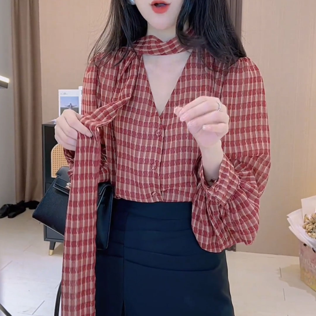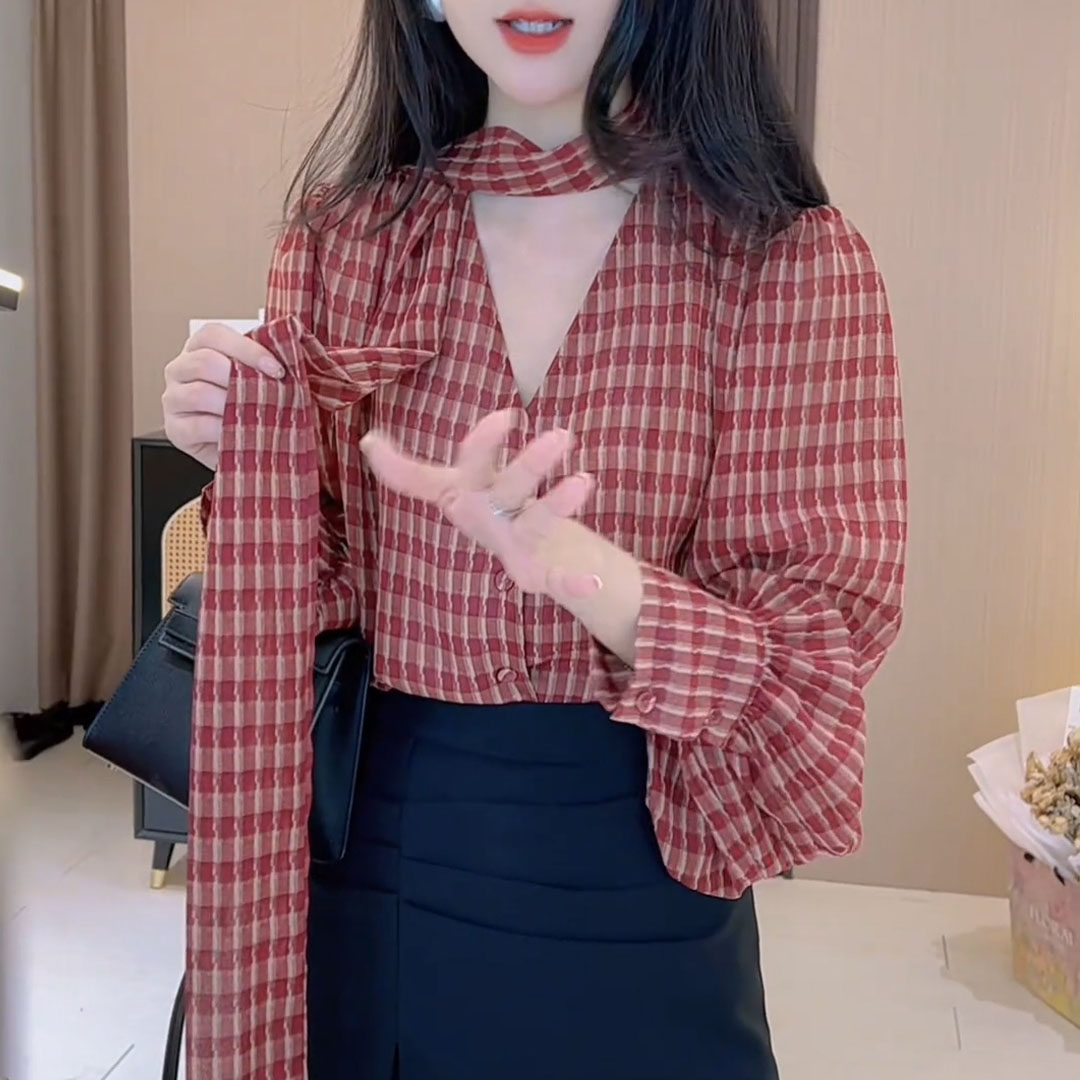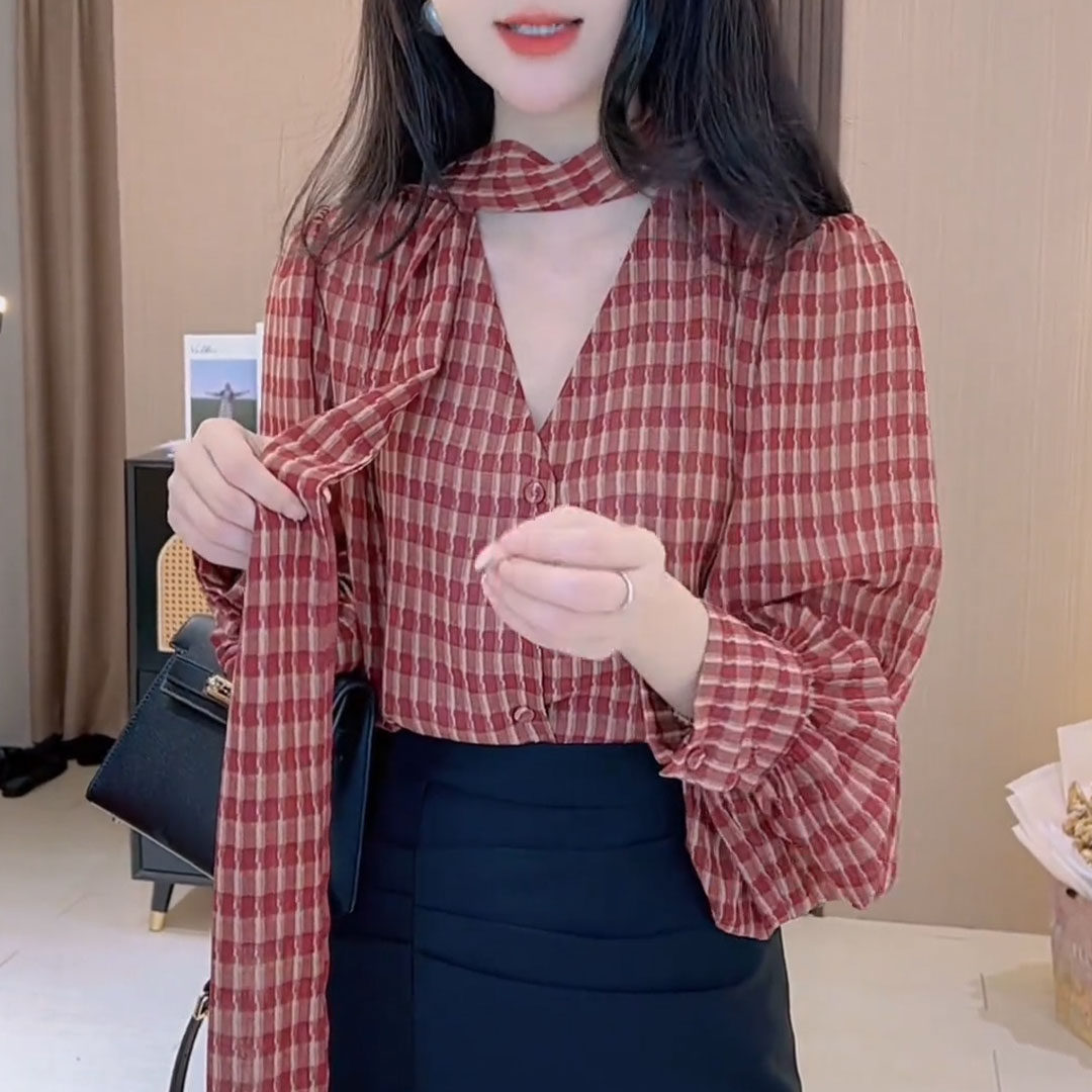 Retro-Style Plaid V-Neck Bow Tie Long-Sleeve Shirt for Women, Lantern Sleeves, Loose Fit, Slimming, High-End Feel Top