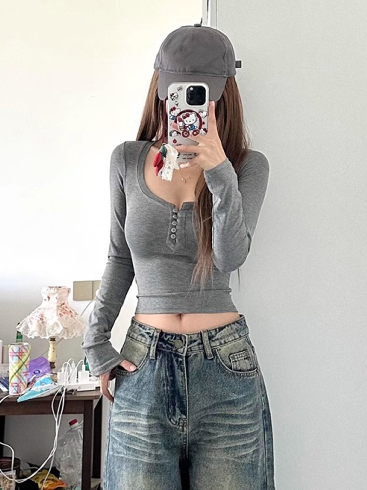 American-Style Spicy Girl U-Neck Long-Sleeve T-Shirt for Women, Autumn and Winter Slim-Fit Design, Short and Slimming Base Layer Top
