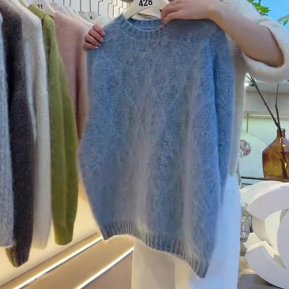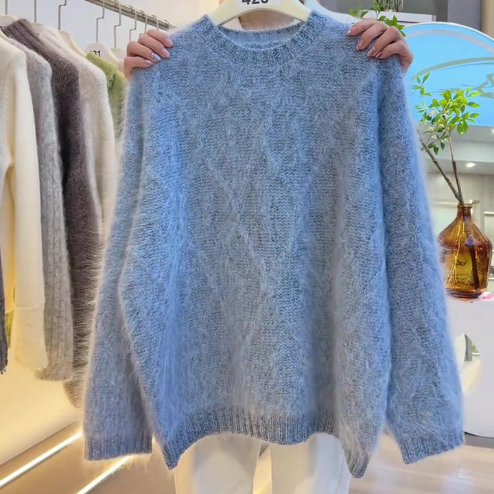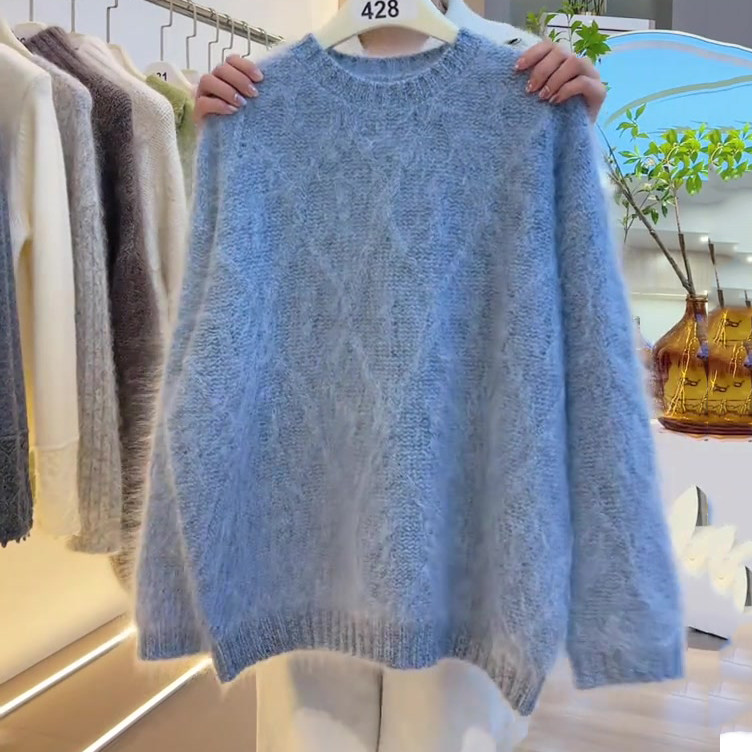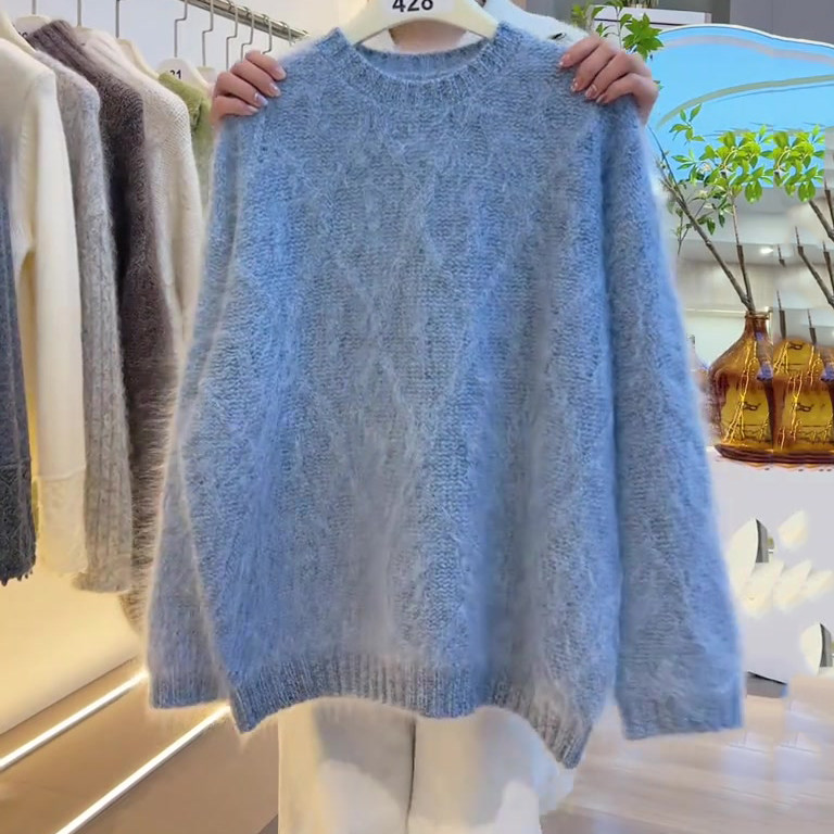High-end blue round-neck sweater for women in autumn and winter, Korean style, fashionable, stylish, great-looking, loose and lazy, inner knitted sweater