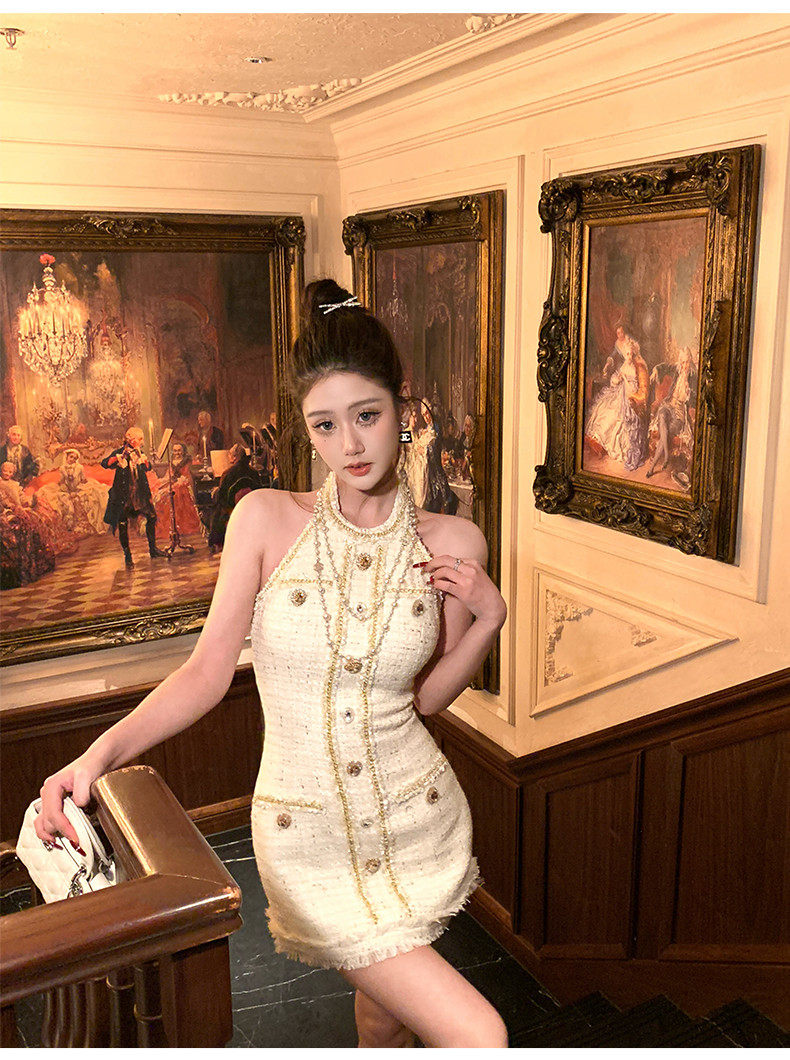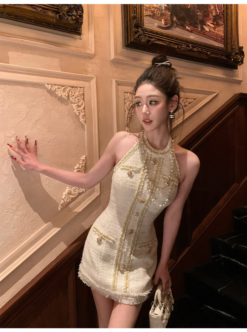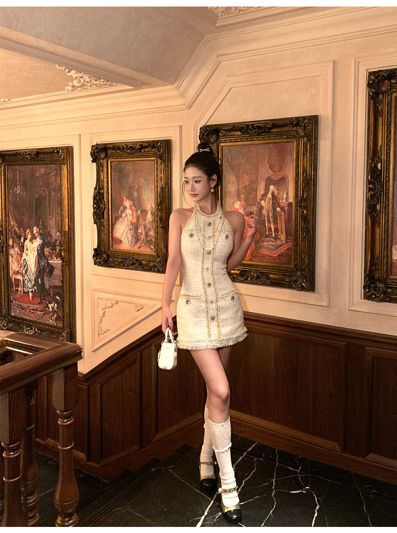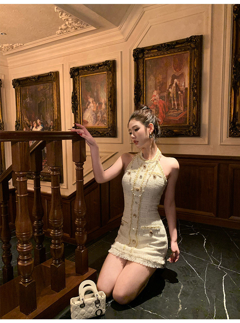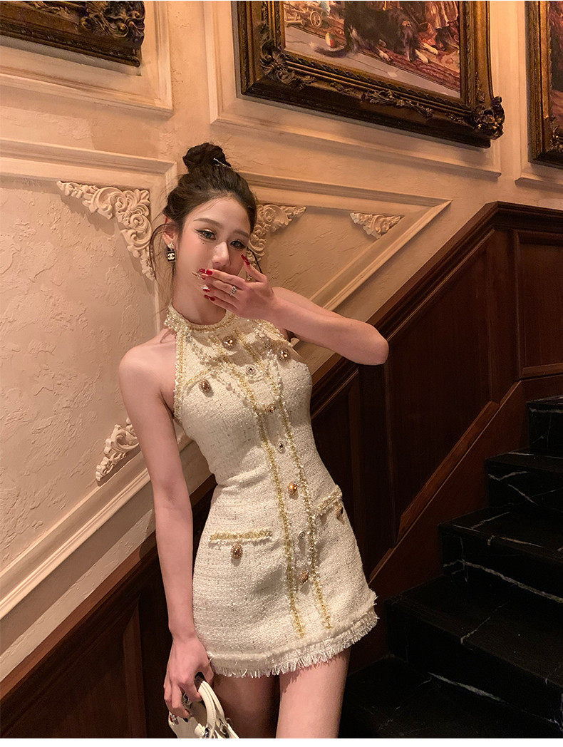 Hollinna halterneck leaky back wool small fragrant dress women's spring swing golden style design high-end skirt
