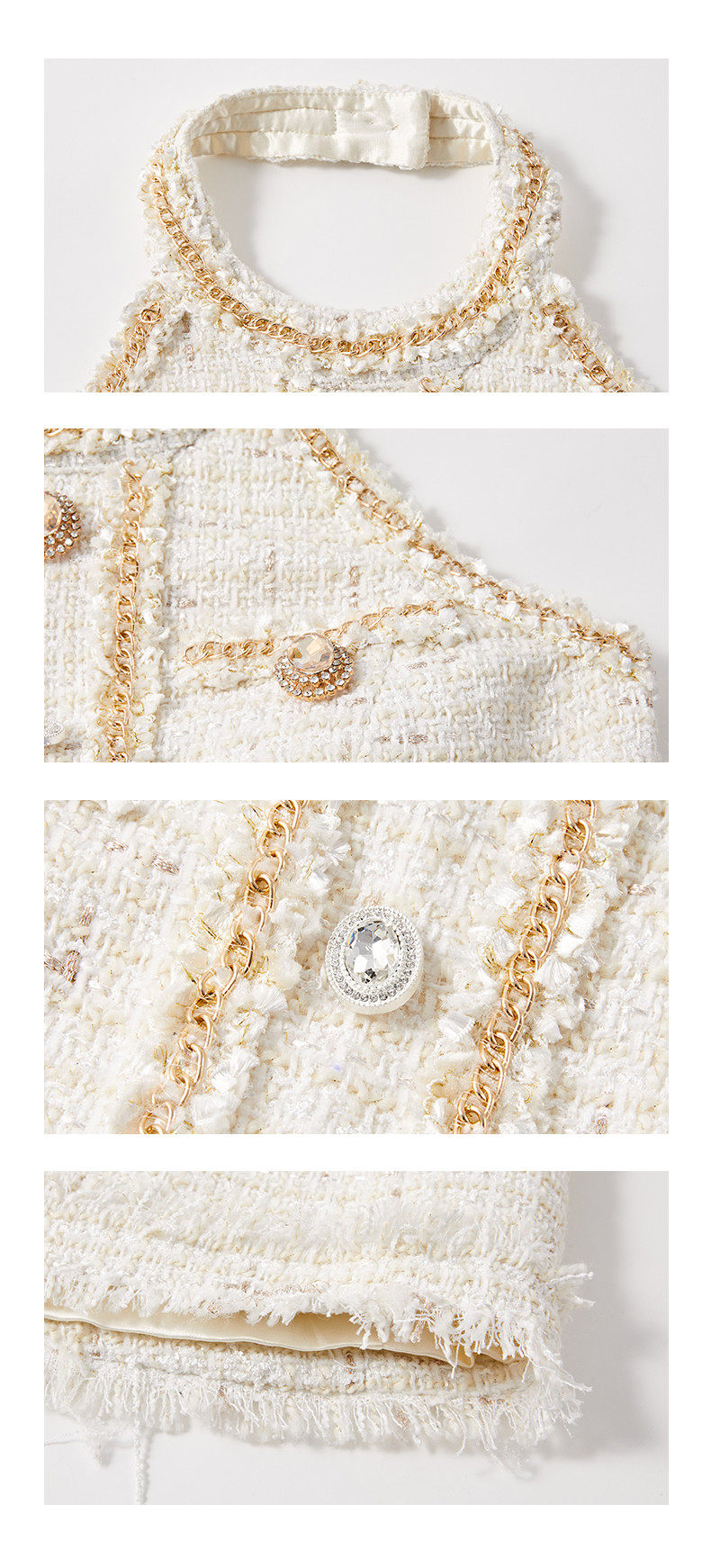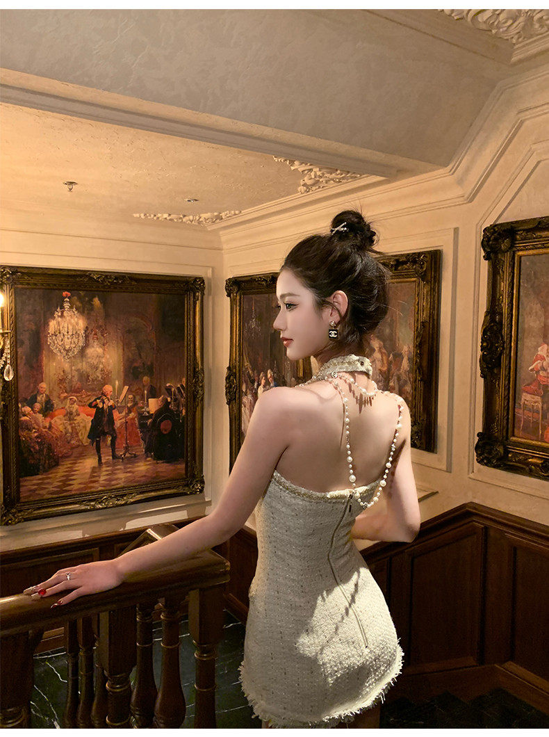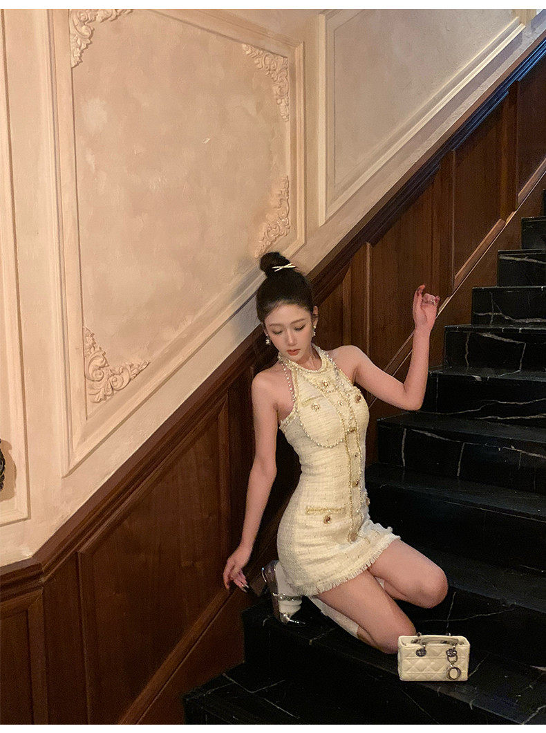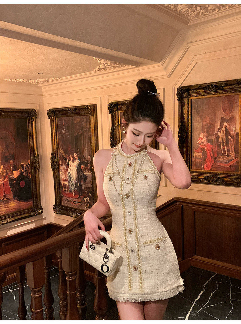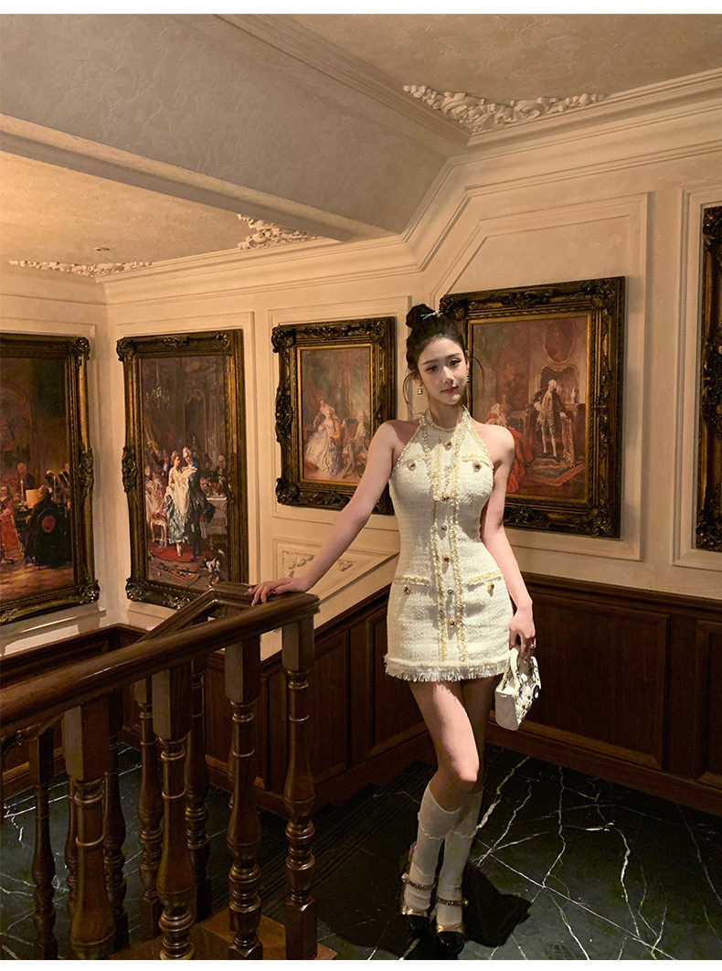 Hollinna halterneck leaky back wool small fragrant dress women's spring swing golden style design high-end skirt