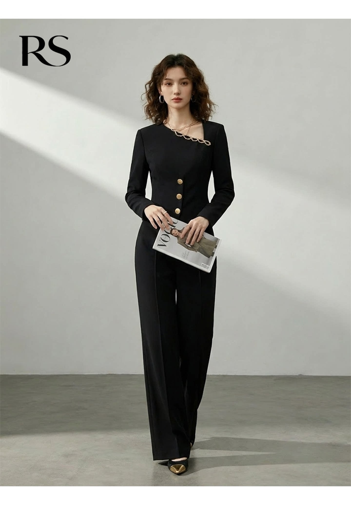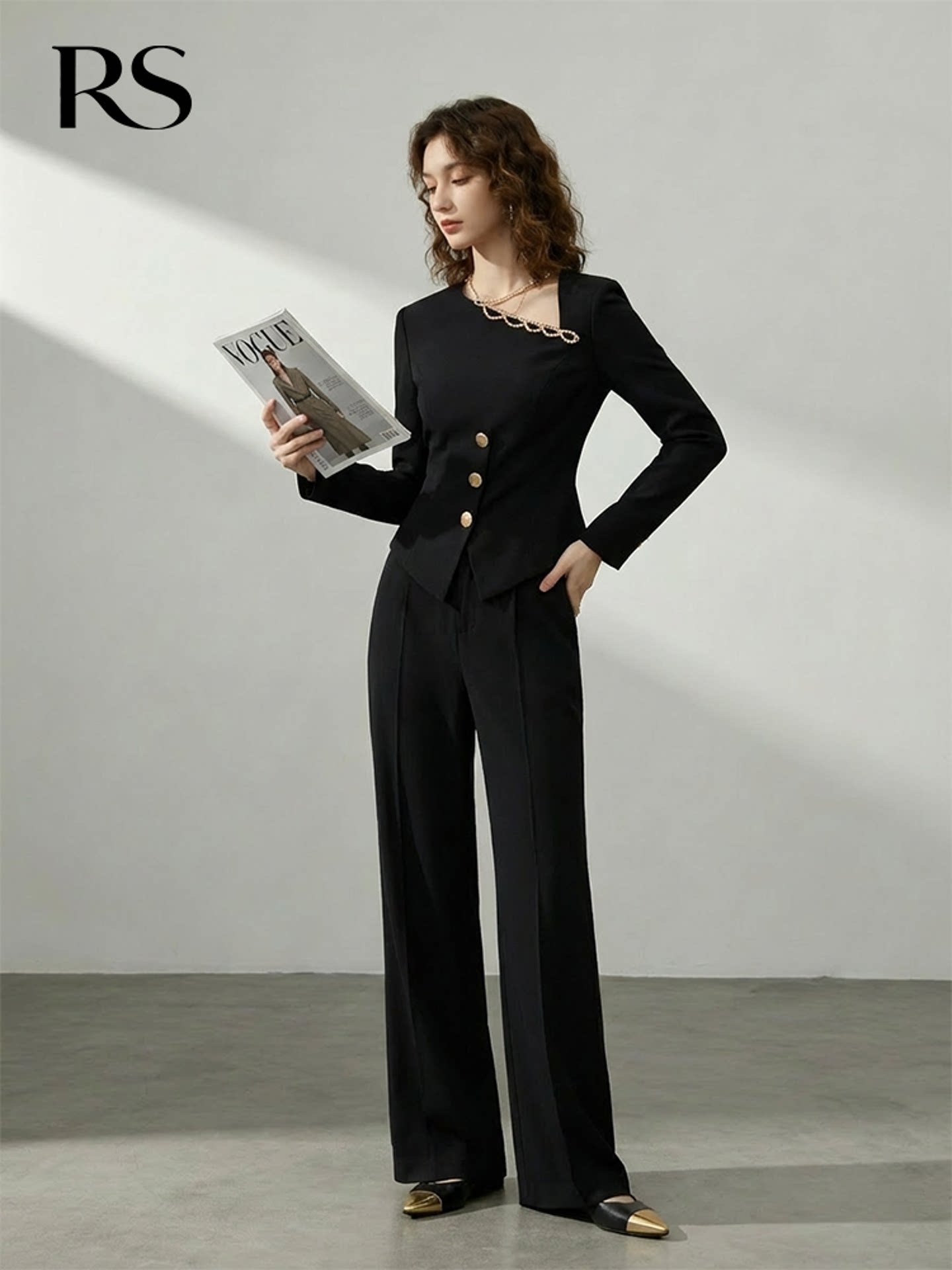 RUSUI Rusui is a stylish and stylish two-piece suit with a slant-collar black jacket and trousers that are capable, light, luxurious and fragrant.