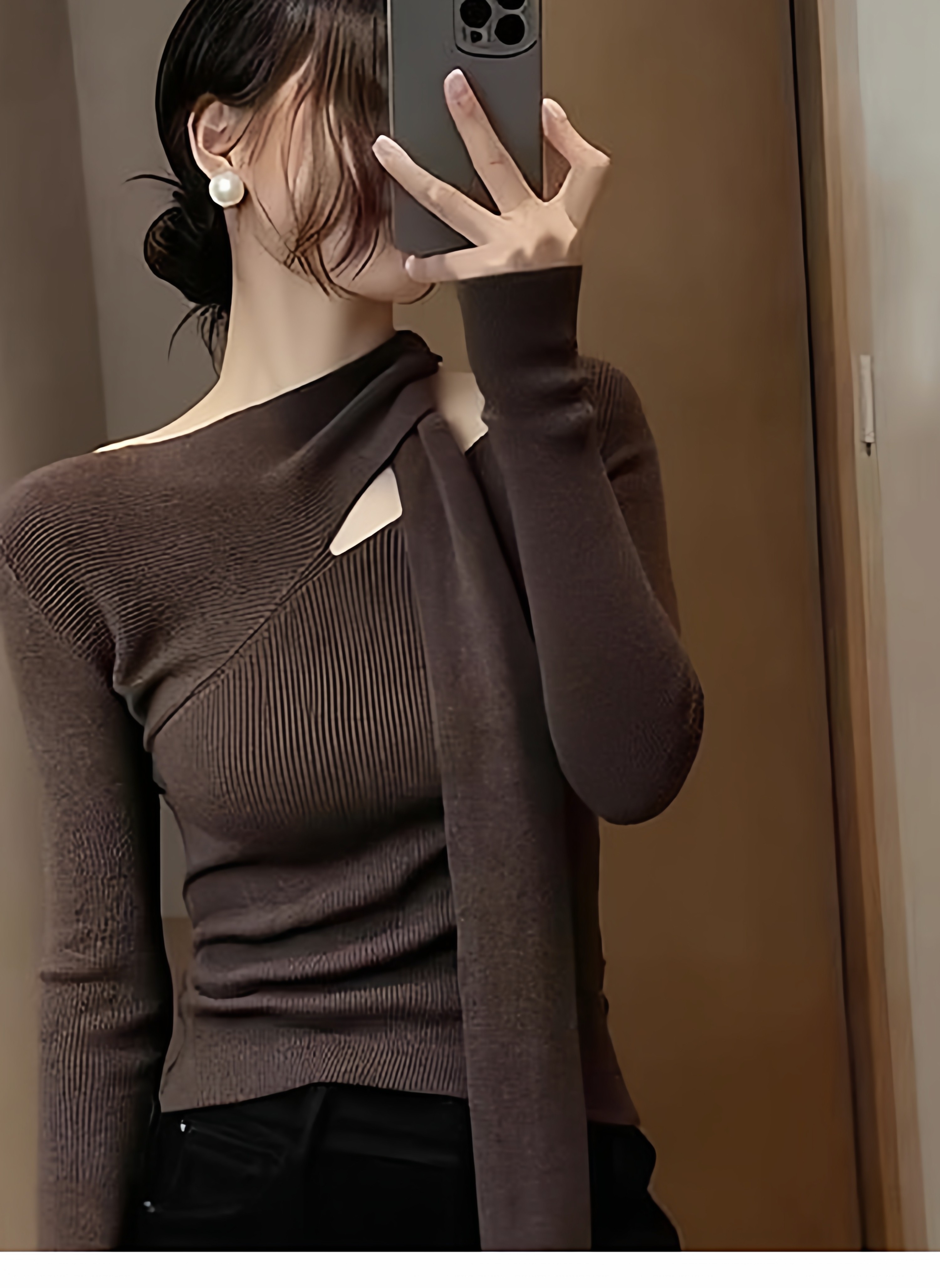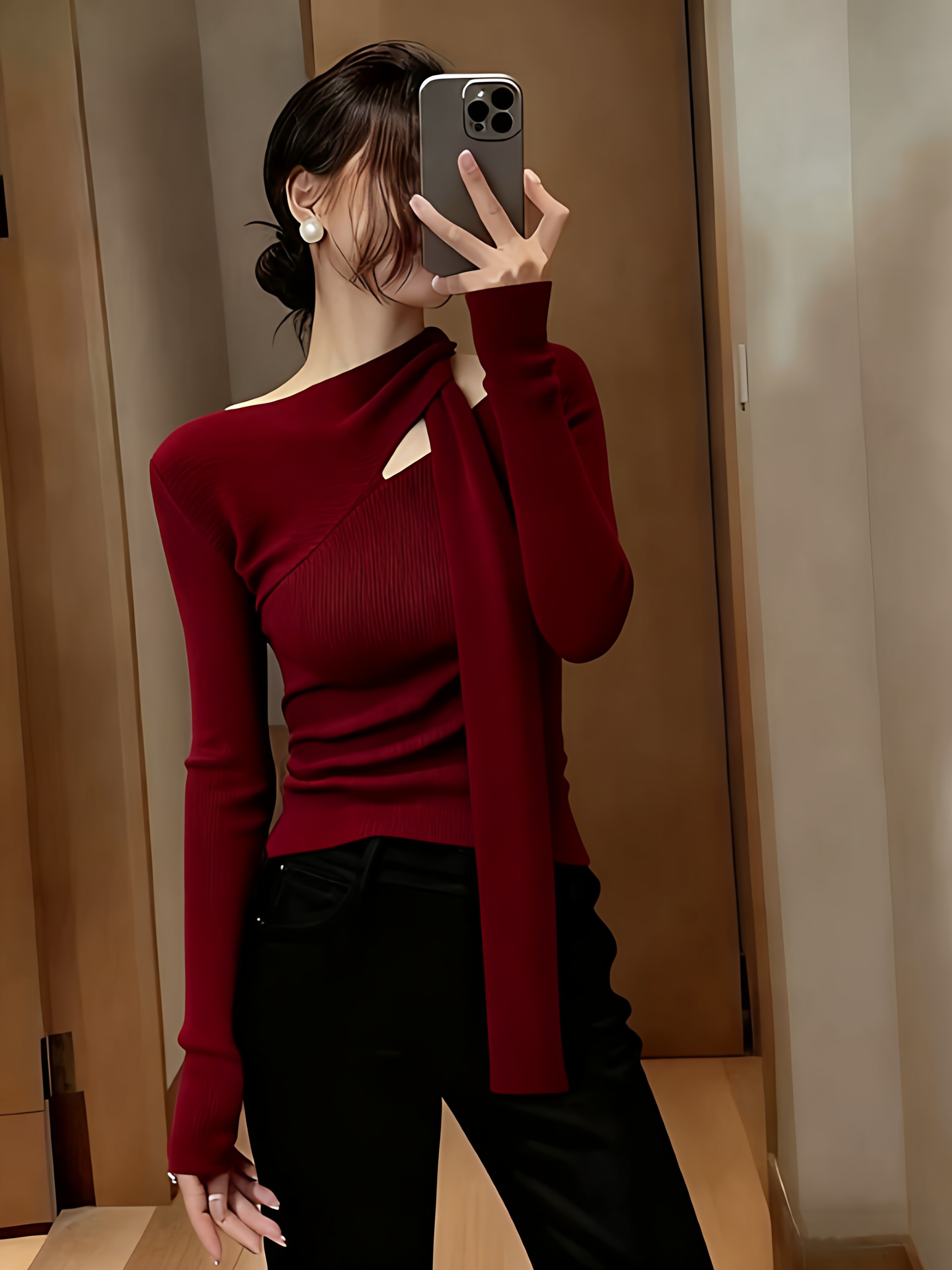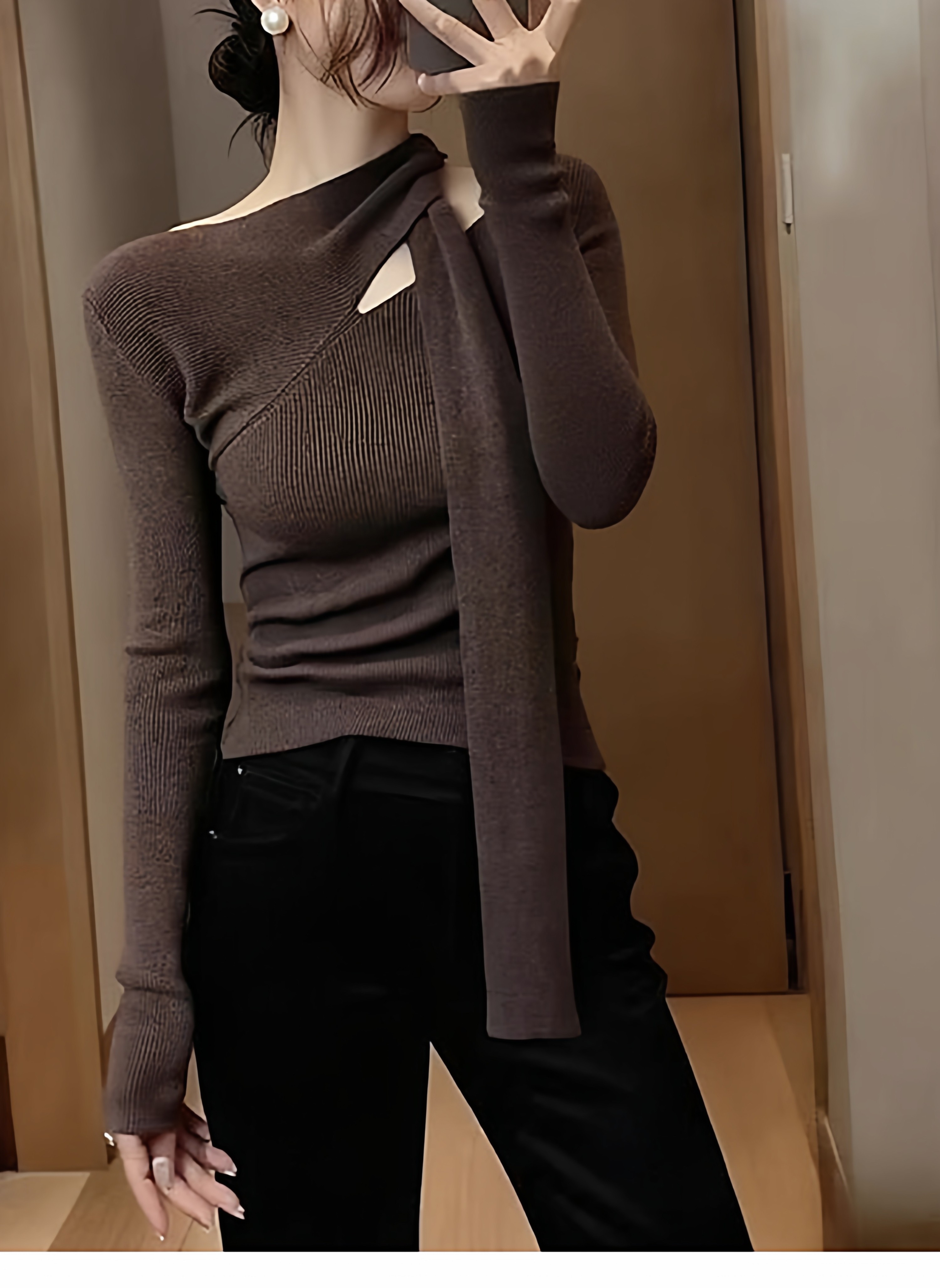 Design sense hollow red halterneck streamer knitted bottoming shirt for women in autumn and winter pure desire slim fit inner sweater top