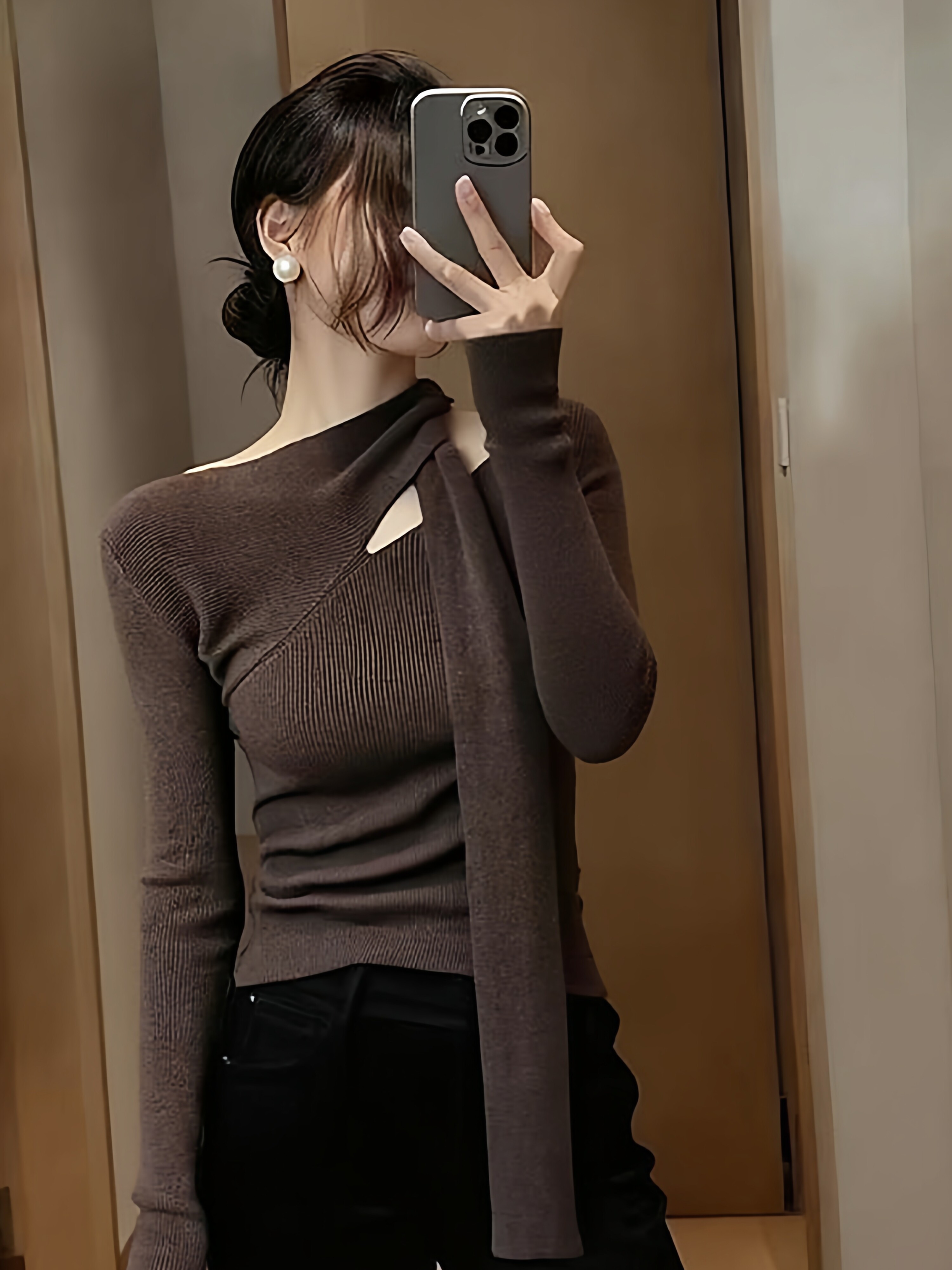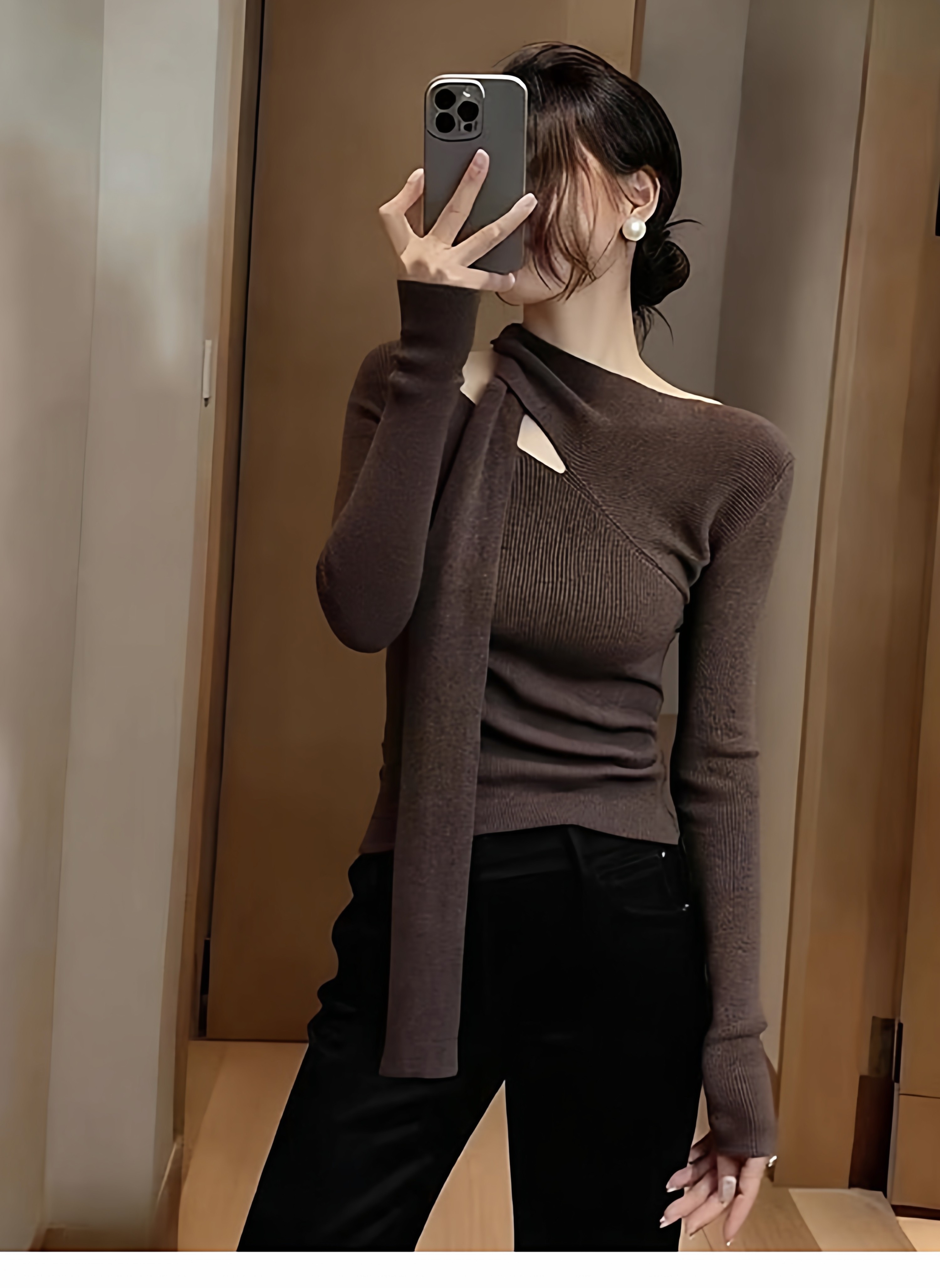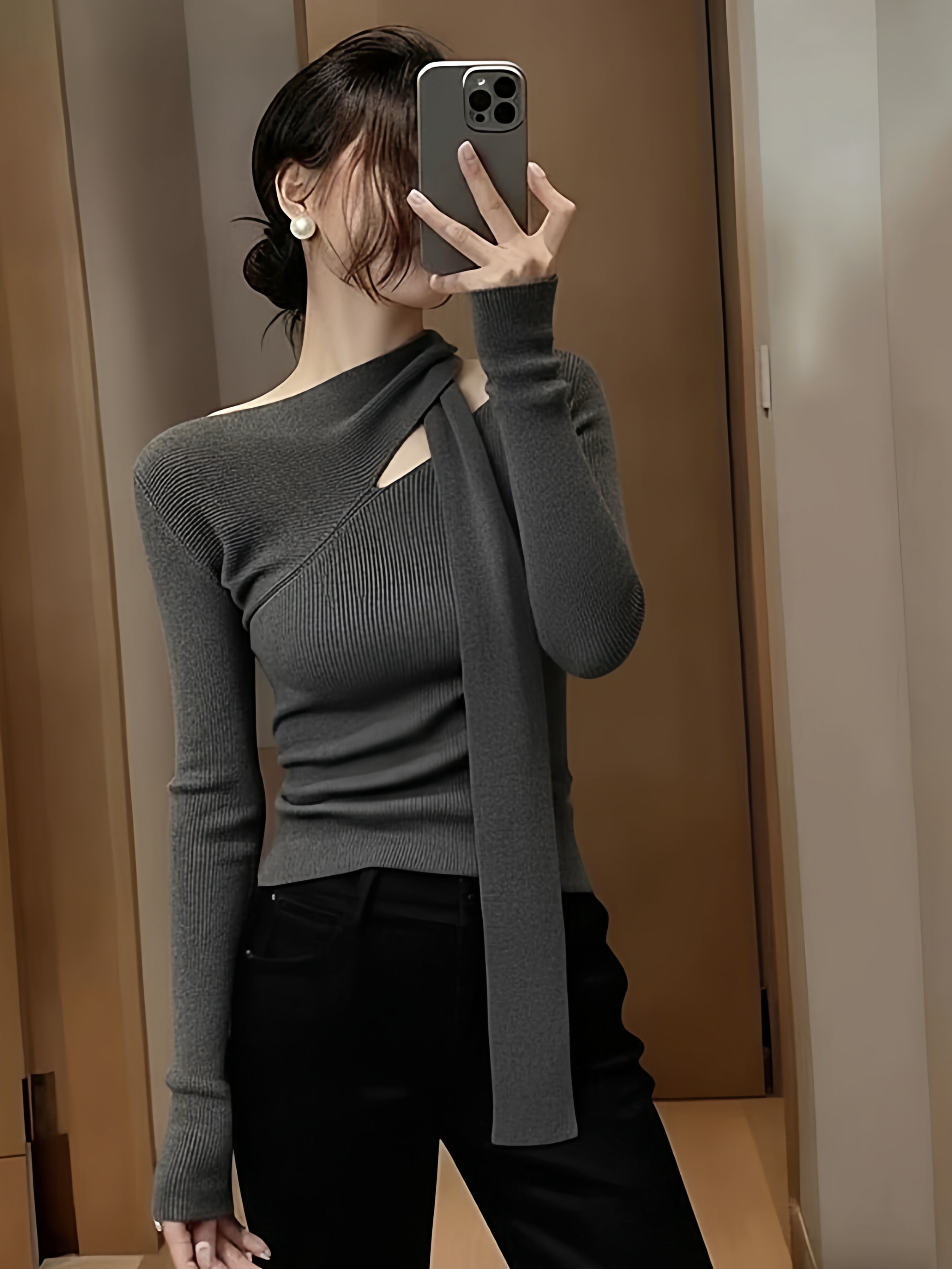 Design sense hollow red halterneck streamer knitted bottoming shirt for women in autumn and winter pure desire slim fit inner sweater top