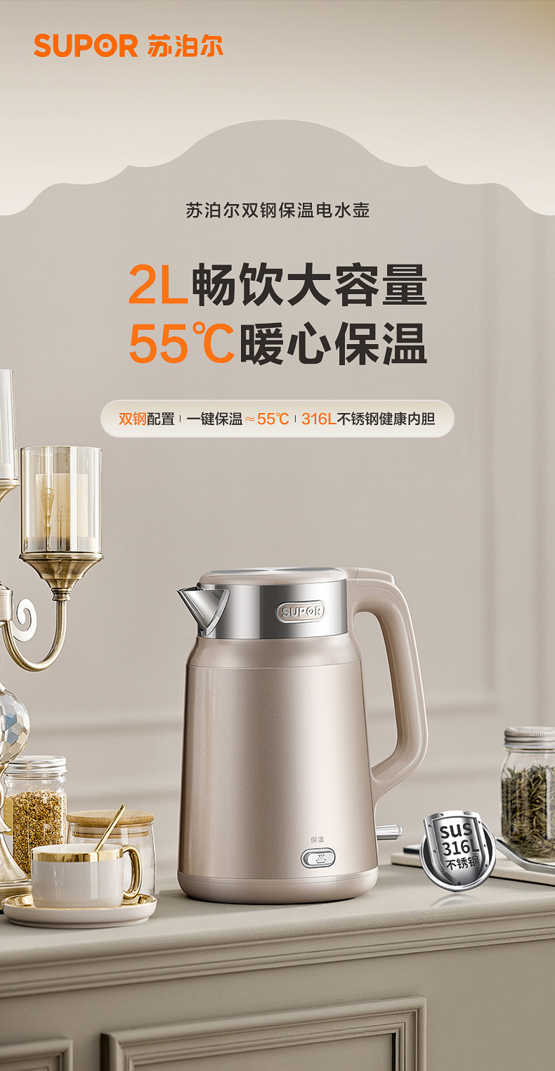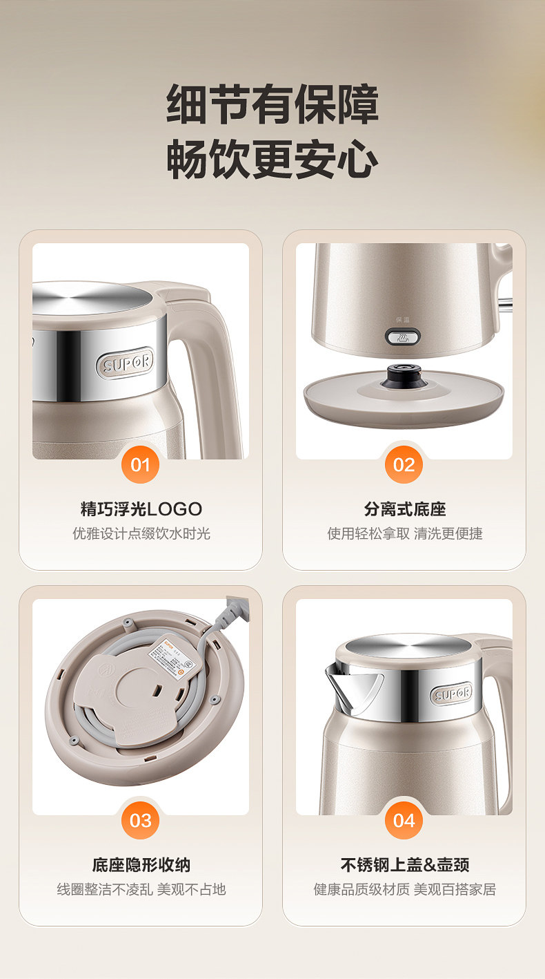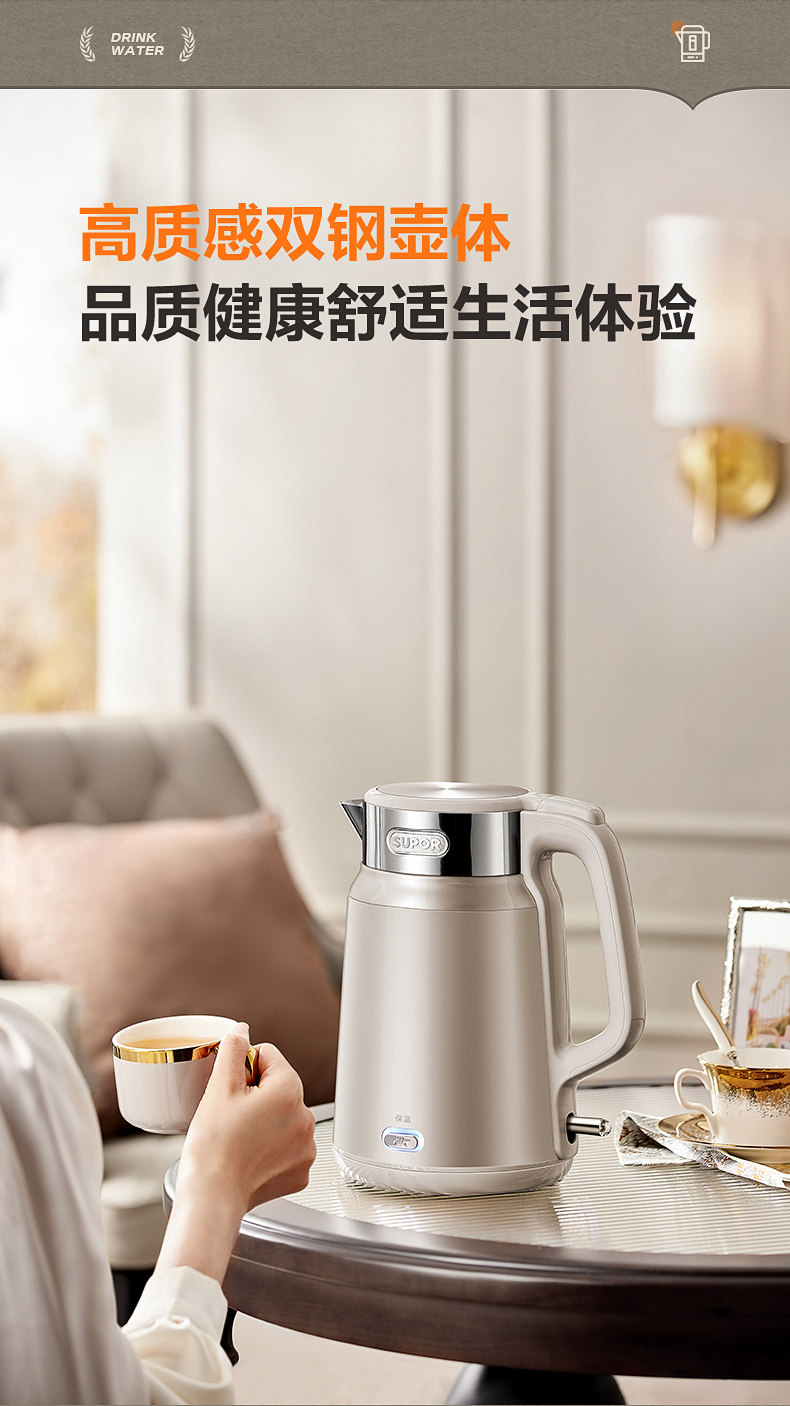 Supor Electric Kettle for Home Use, Large Capacity, 2025 New Model, Integrated Insulation, Fully Automatic, Constant Temperature, 316L