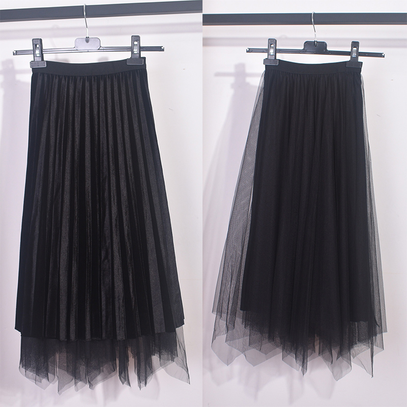 2025 new korean autumn and winter mesh skirt women's reversible velvet pleated a-line skirt mid-length irregular style