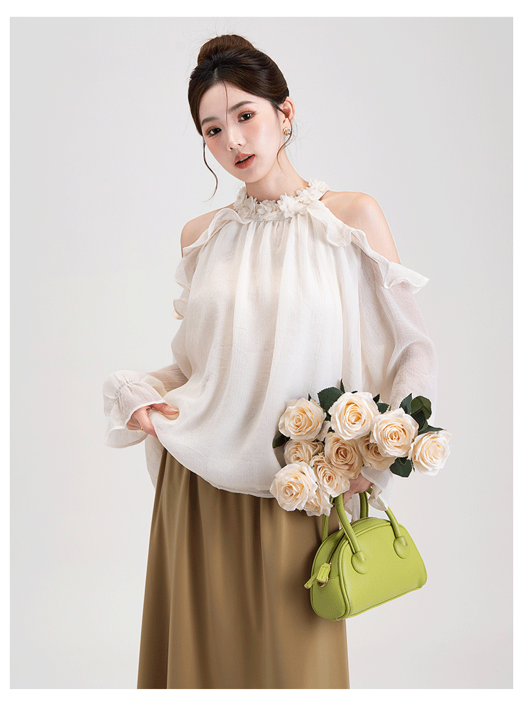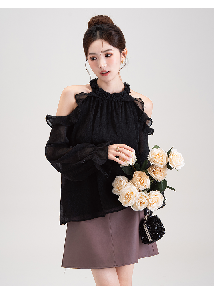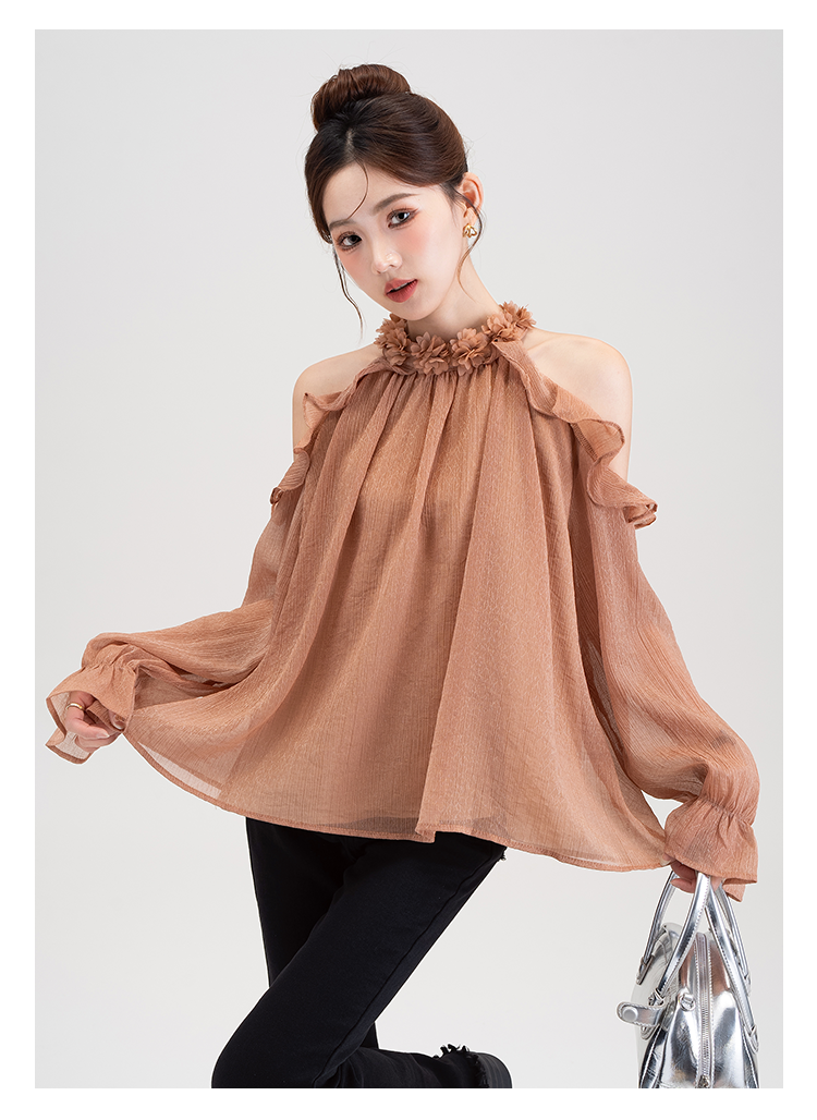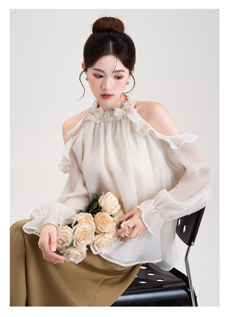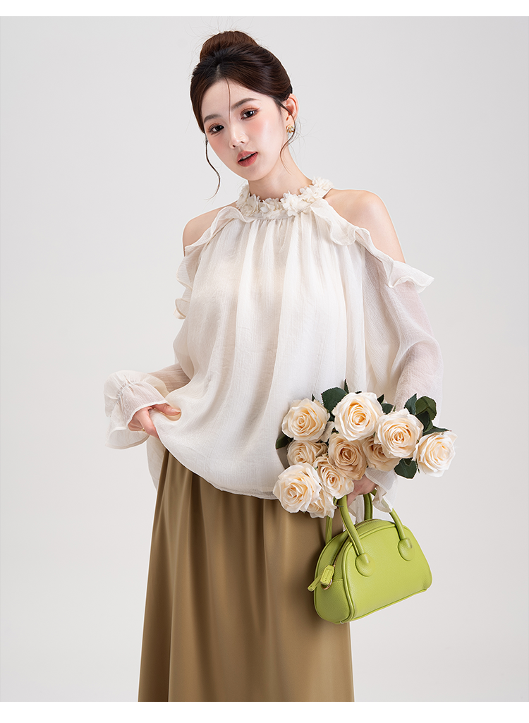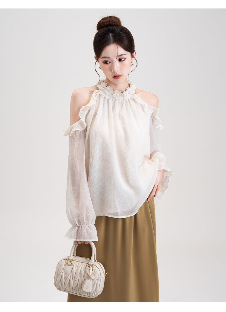 French-Style Three-Dimensional Floral Halter Neck Off-Shoulder Chiffon Blouse for Women, 2025 Autumn New Ruffled Long-Sleeve Thin Shirt