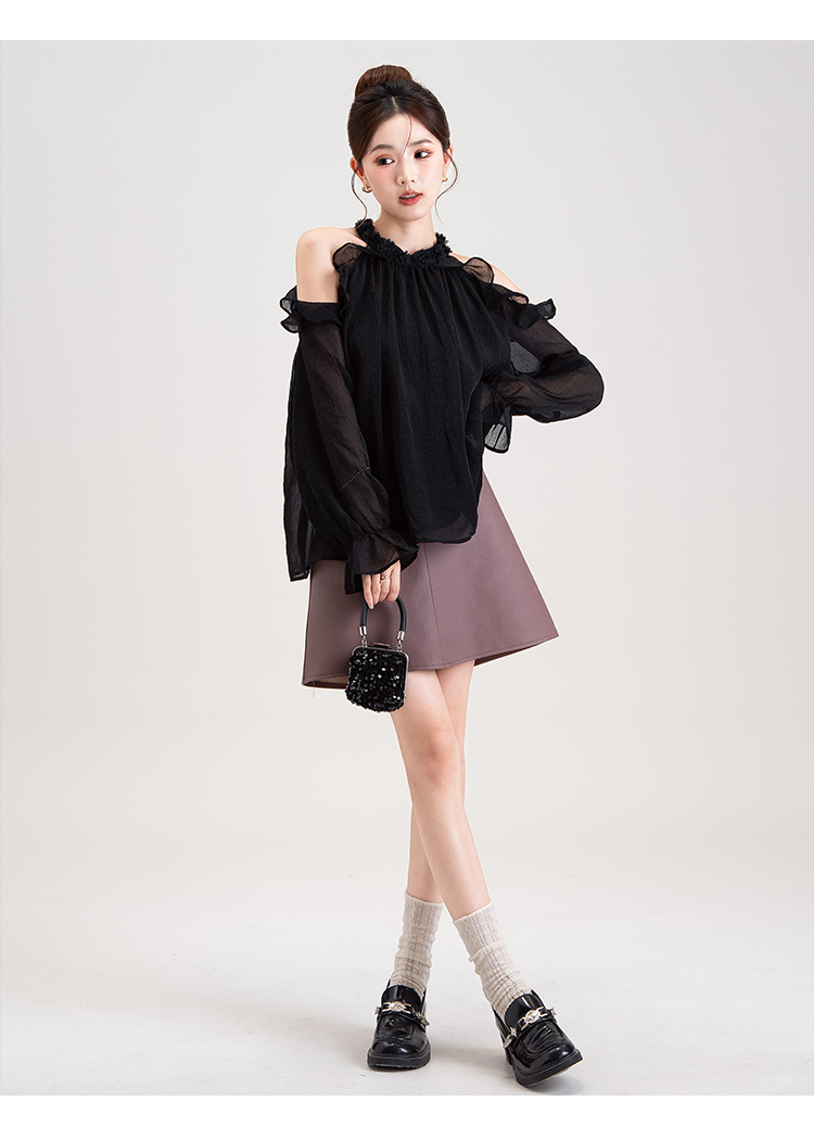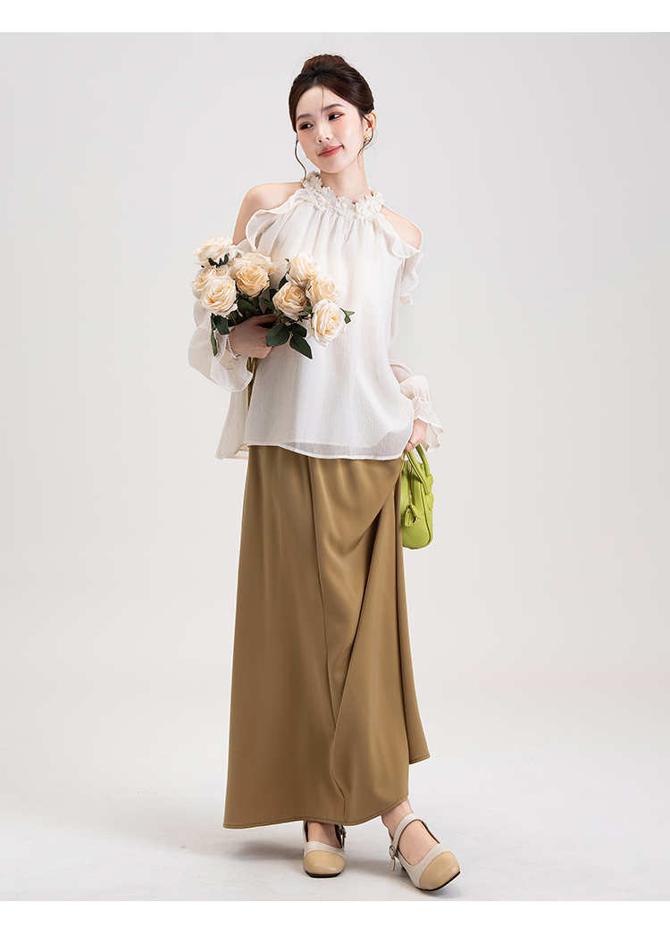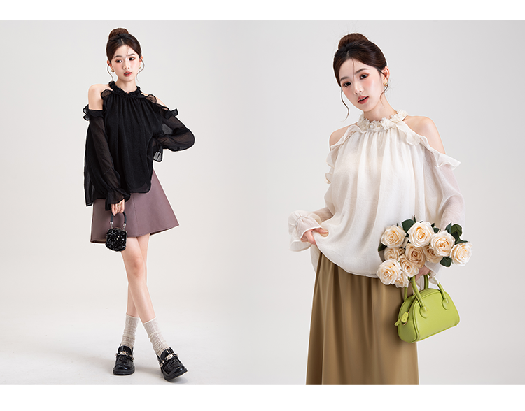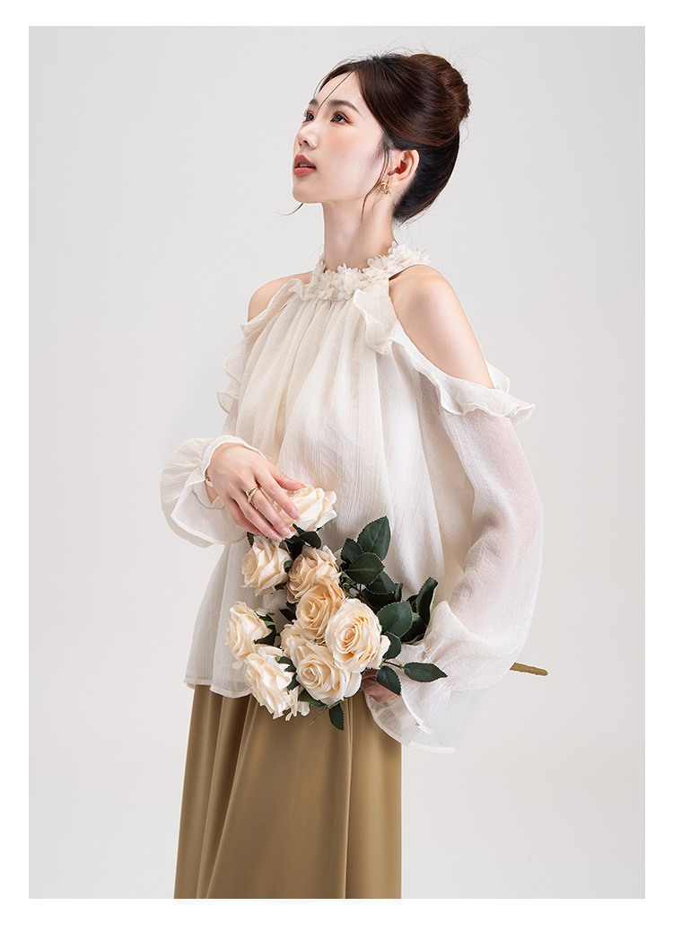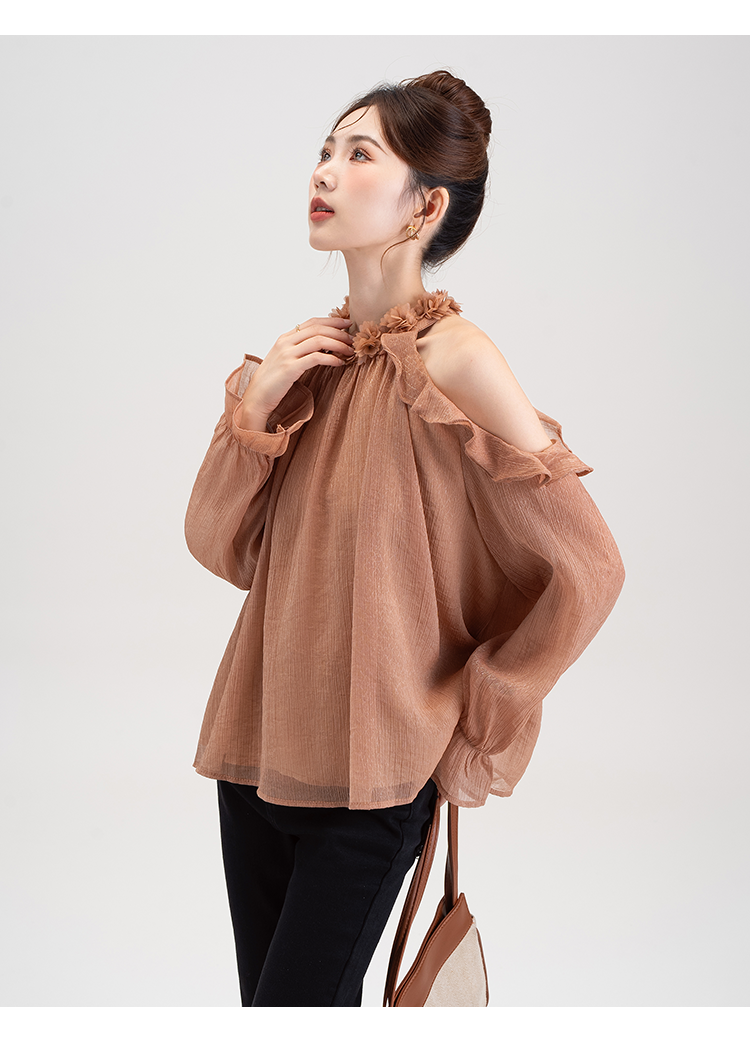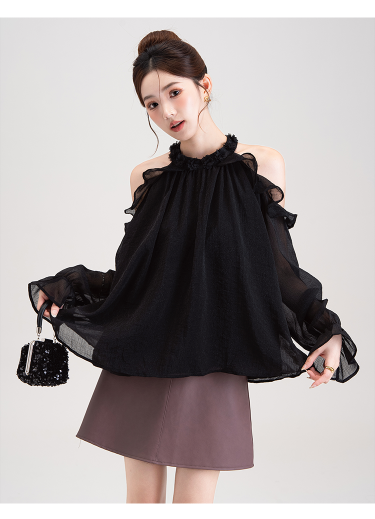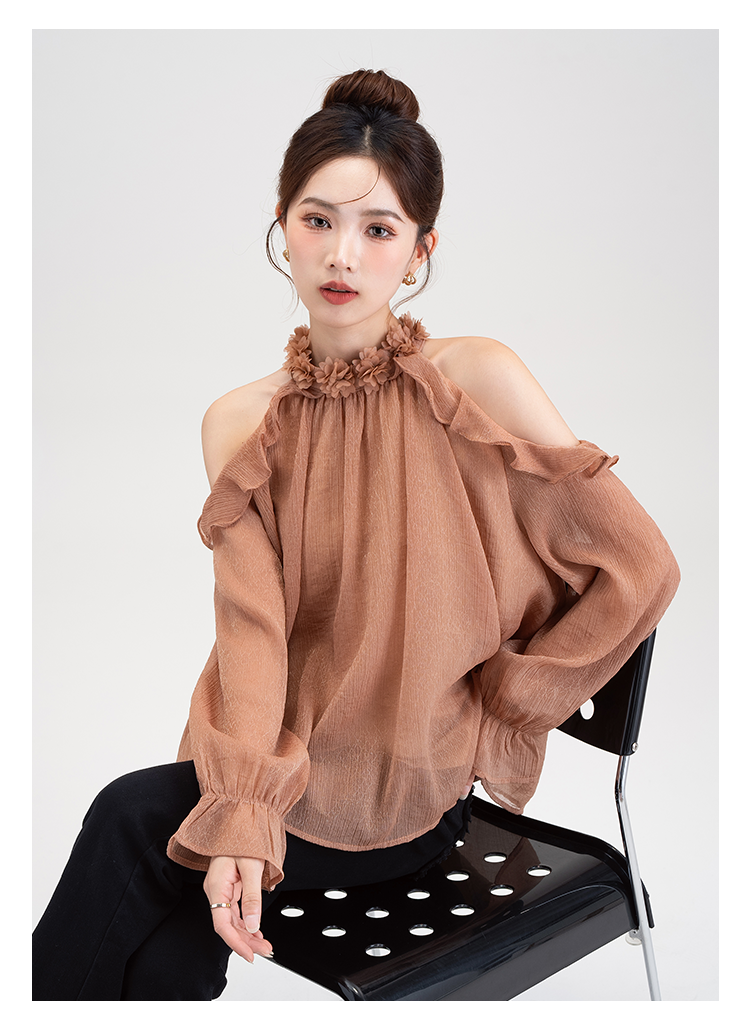 French-Style Three-Dimensional Floral Halter Neck Off-Shoulder Chiffon Blouse for Women, 2025 Autumn New Ruffled Long-Sleeve Thin Shirt