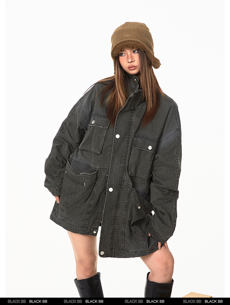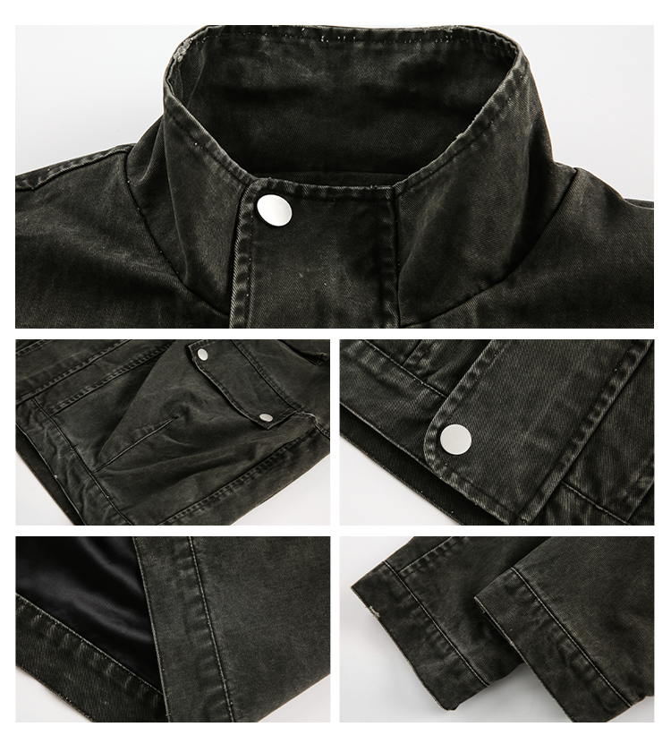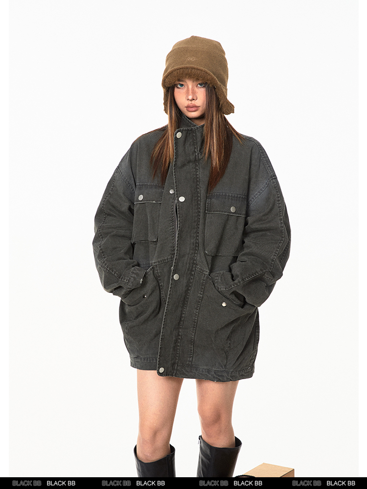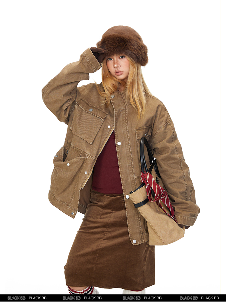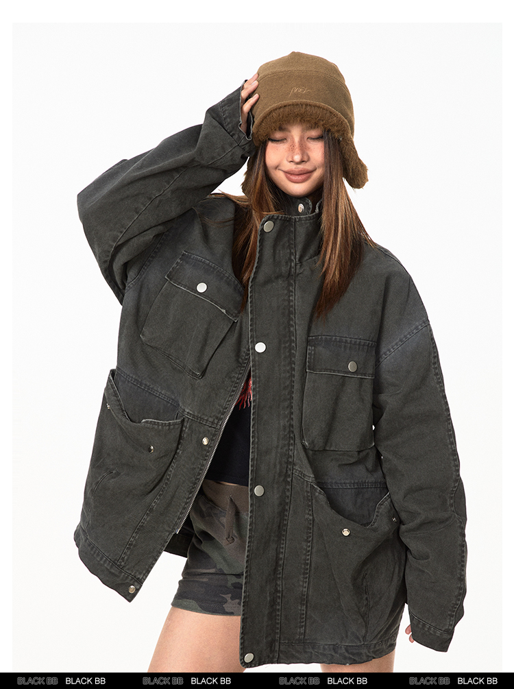 Retro washed distressed off-shoulder workwear denim jacket multi-pocket design loose jacket top
