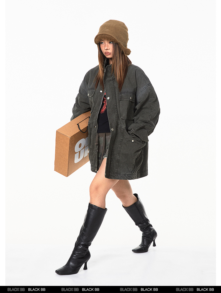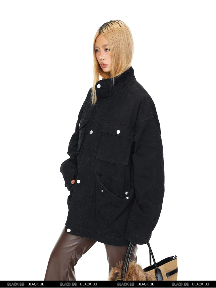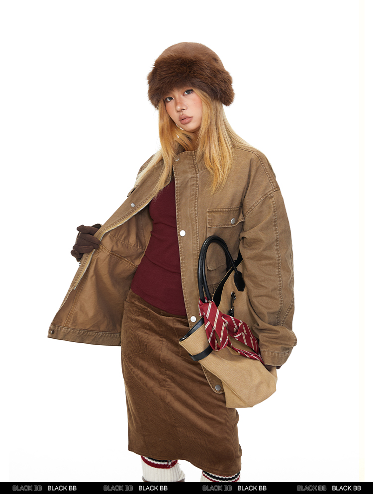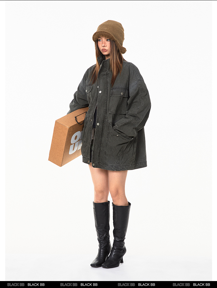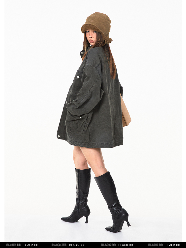Retro washed distressed off-shoulder workwear denim jacket multi-pocket design loose jacket top