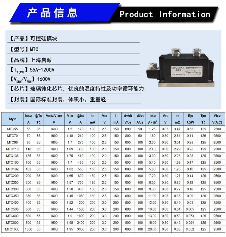 Mtc110A Thyristor Module 160A High Power 200A-16 300A1600V Soft Start Electric Furnace Heating