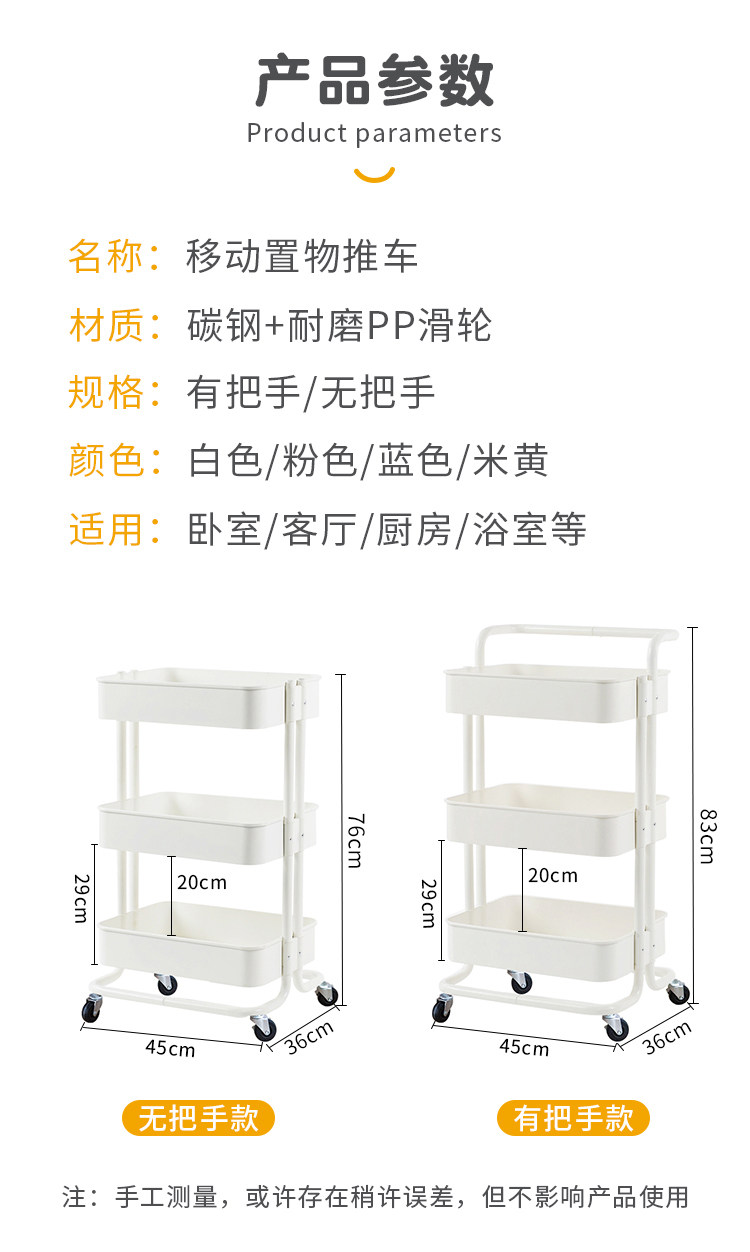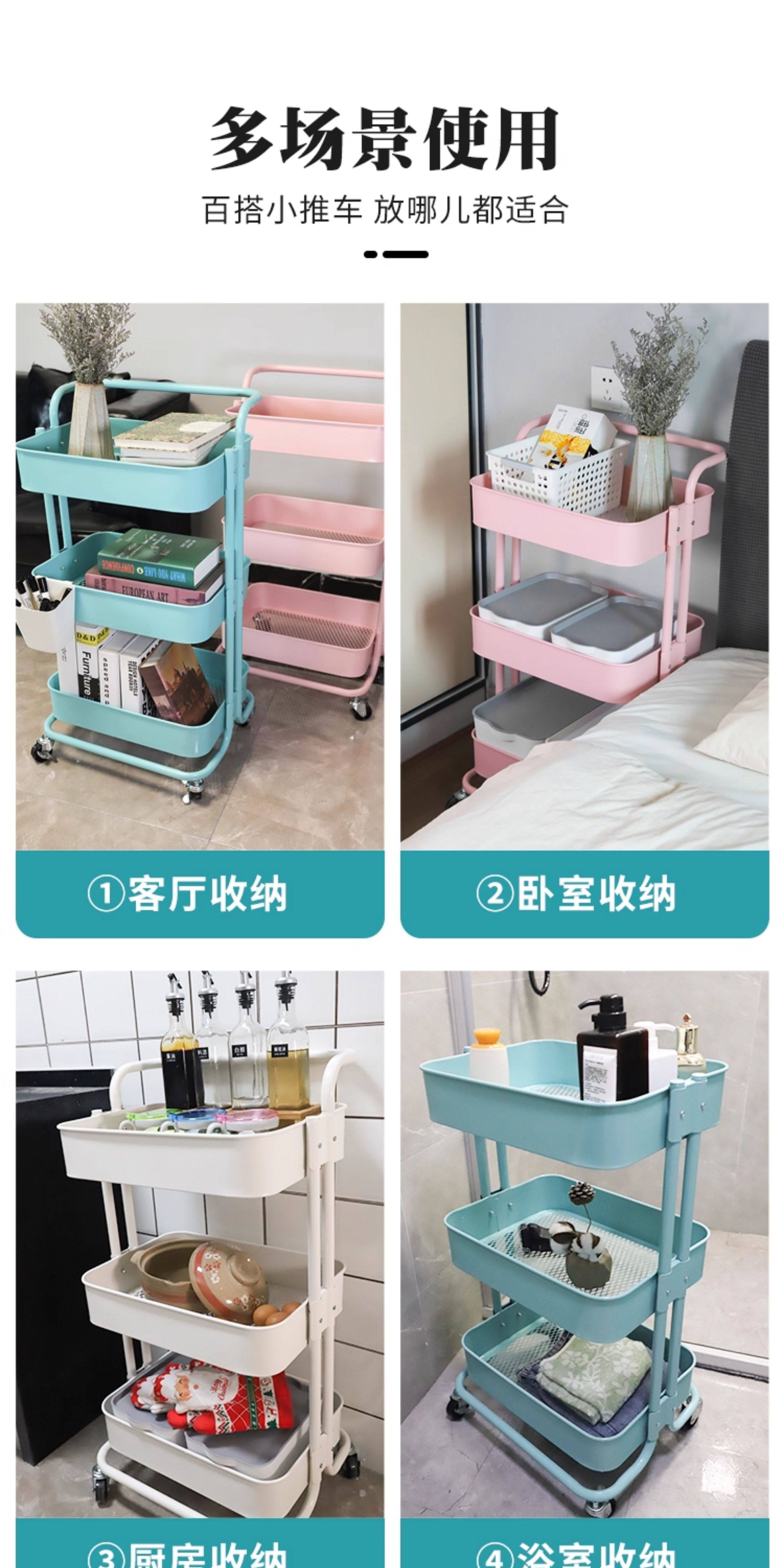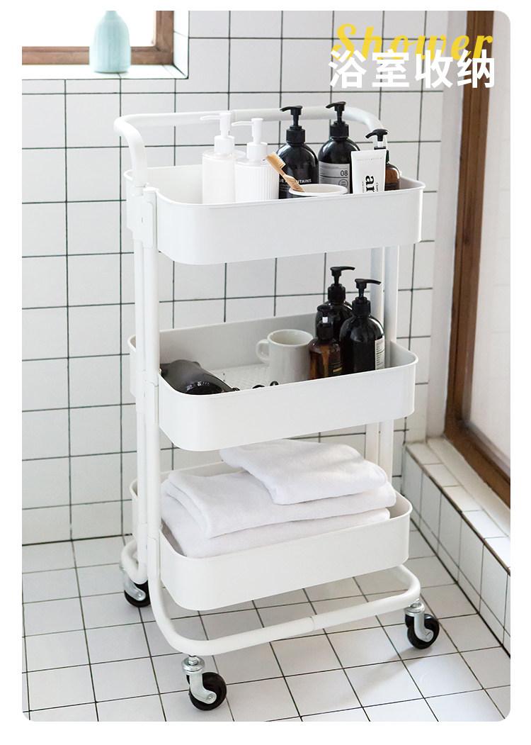 Sort by color ABS white trolley with handle,ABS white trolley with handle + 2 hanging buckets + 1 sticker.,White with handle, full carbon steel thickened,Blue handle, full carbon steel thickened,Pink handle, all carbon steel thickened,Beige handle, thickened full carbon steel,Gray green handle, thickened carbon steel, new style,White handleless, full carbon steel thickened,Beige handleless, full carbon steel thickened,Blue handleless full carbon steel thickened,White with handle, thickened carbon steel + 5 storage baskets + stickers,White with handle, thickened carbon steel + 5 storage baskets + 2 hanging buckets + stickers,White with handle, thickened carbon steel + 7 storage baskets + stickers,White with handle, thickened carbon steel + 7 storage baskets + 2 hanging buckets + stickers.,Pink handle, thickened carbon steel + 5 storage baskets + 2 hanging buckets + 1 sticker,Pink handle, thickened carbon steel + 7 storage baskets + 2 hanging buckets + 1 sticker,Blue handle, thickened carbon steel + 5 storage baskets + 2 hanging buckets + 1 sticker,Blue handle, thickened carbon steel + 7 storage baskets + 2 hanging buckets + 1 sticker,White 4-layer handle, all carbon steel thickened,Beige handle 4 layers thickened full carbon steel,Gray green handle with 4 layers, all carbon steel thickened,Black 4-layer handle, all carbon steel thickened,Pink handle 4 layers thickened full carbon steel,Blue handle 4 layers thickened full carbon steel