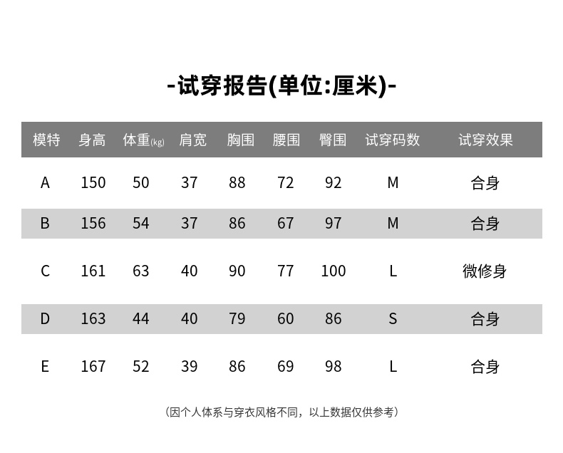 China (cm) 160-165/84-86 165-170 / 88-90 167-172 / 92-96 168-173 / 98-102 170-176 / 106-110