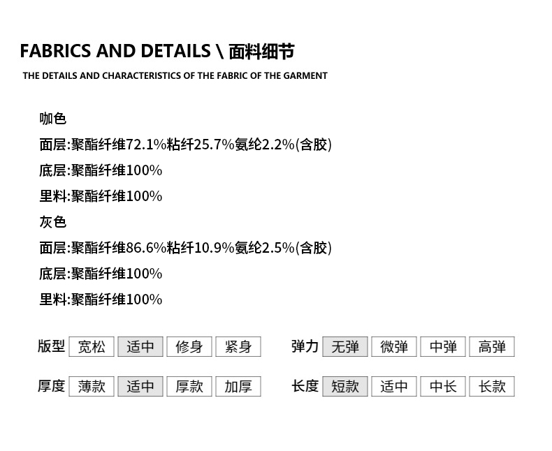 Material Composition Polyester Fiber 87.0% Cotton10.0% Polyurethane Elastic Fiber (Spandex) 3.0%
