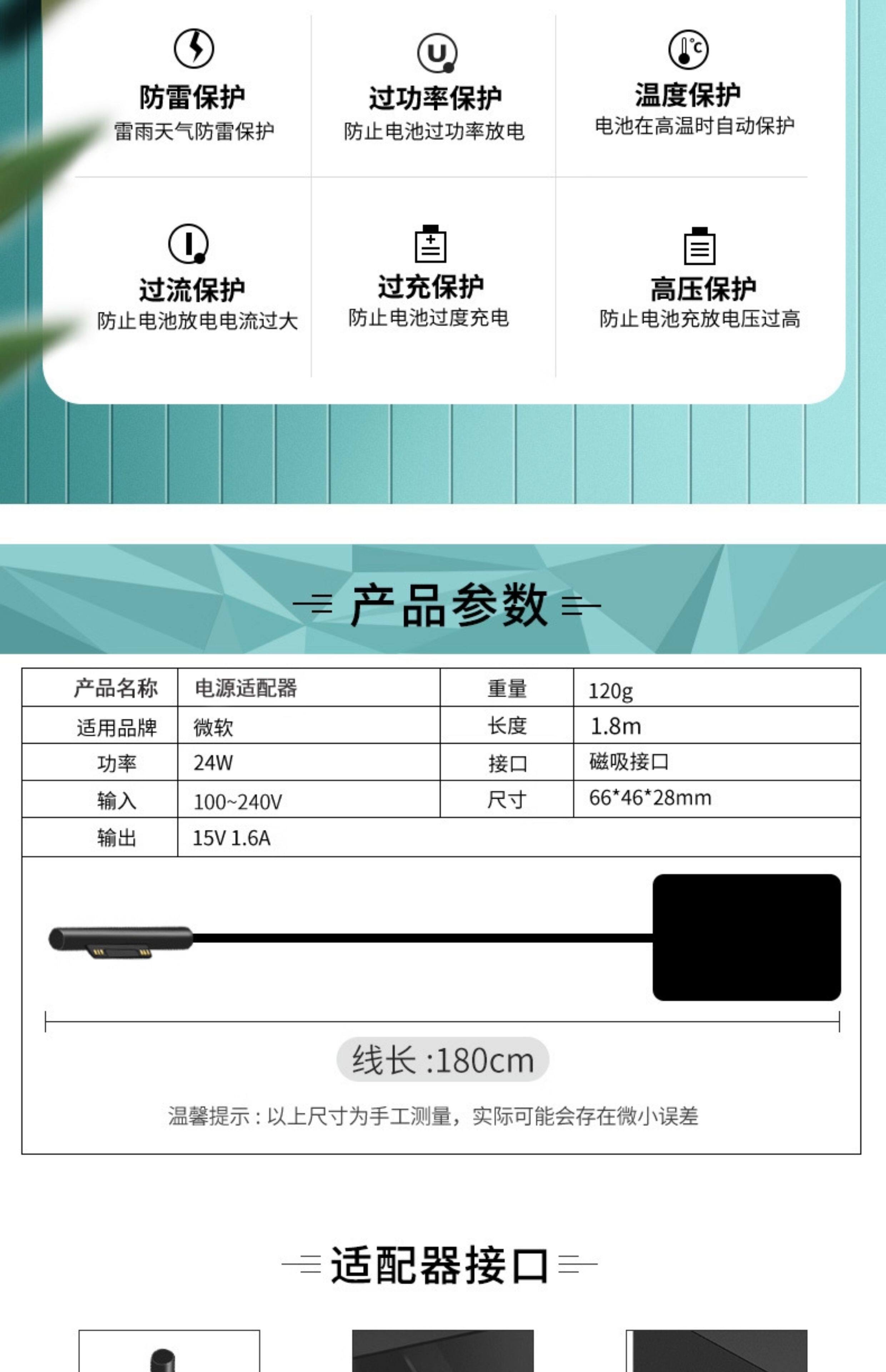 Suitable for Microsoft Surface Charger Pro4 Charger Pro6Pro5Pro3Pro2 Power Adapter Laptop Charging Cable 24W High-Power Fast Charging Tablet Computer Pro7 Universal
