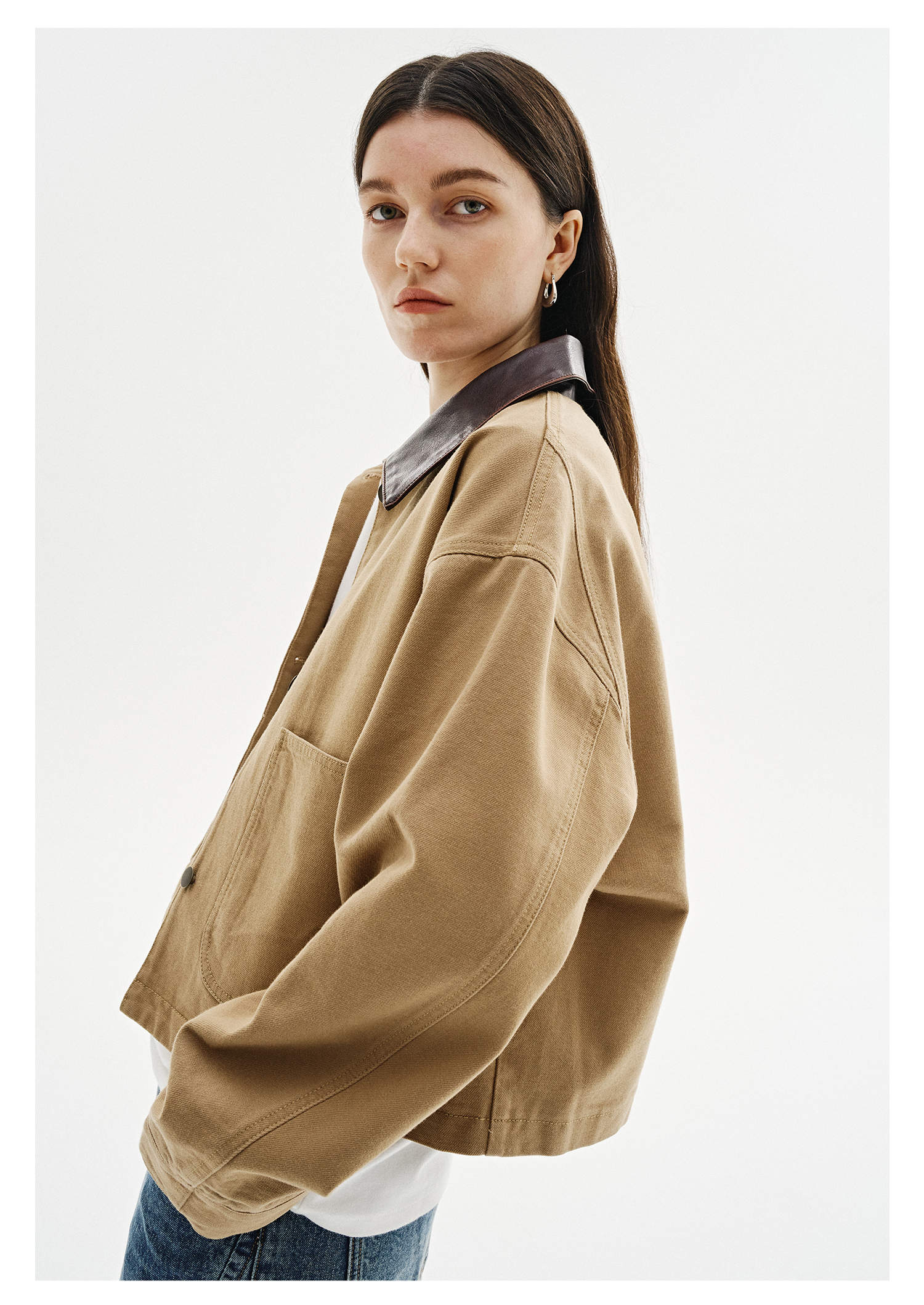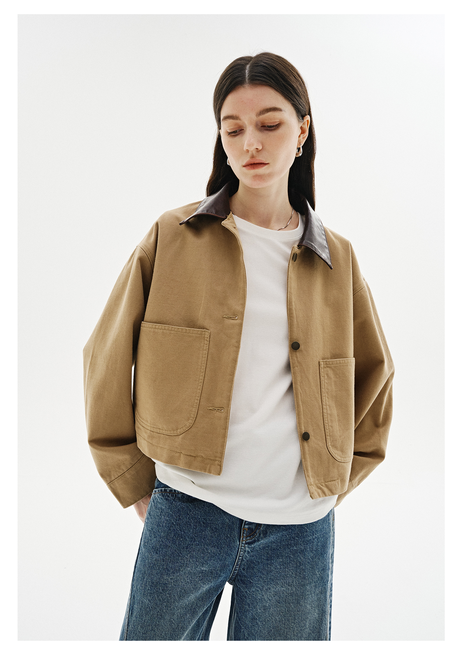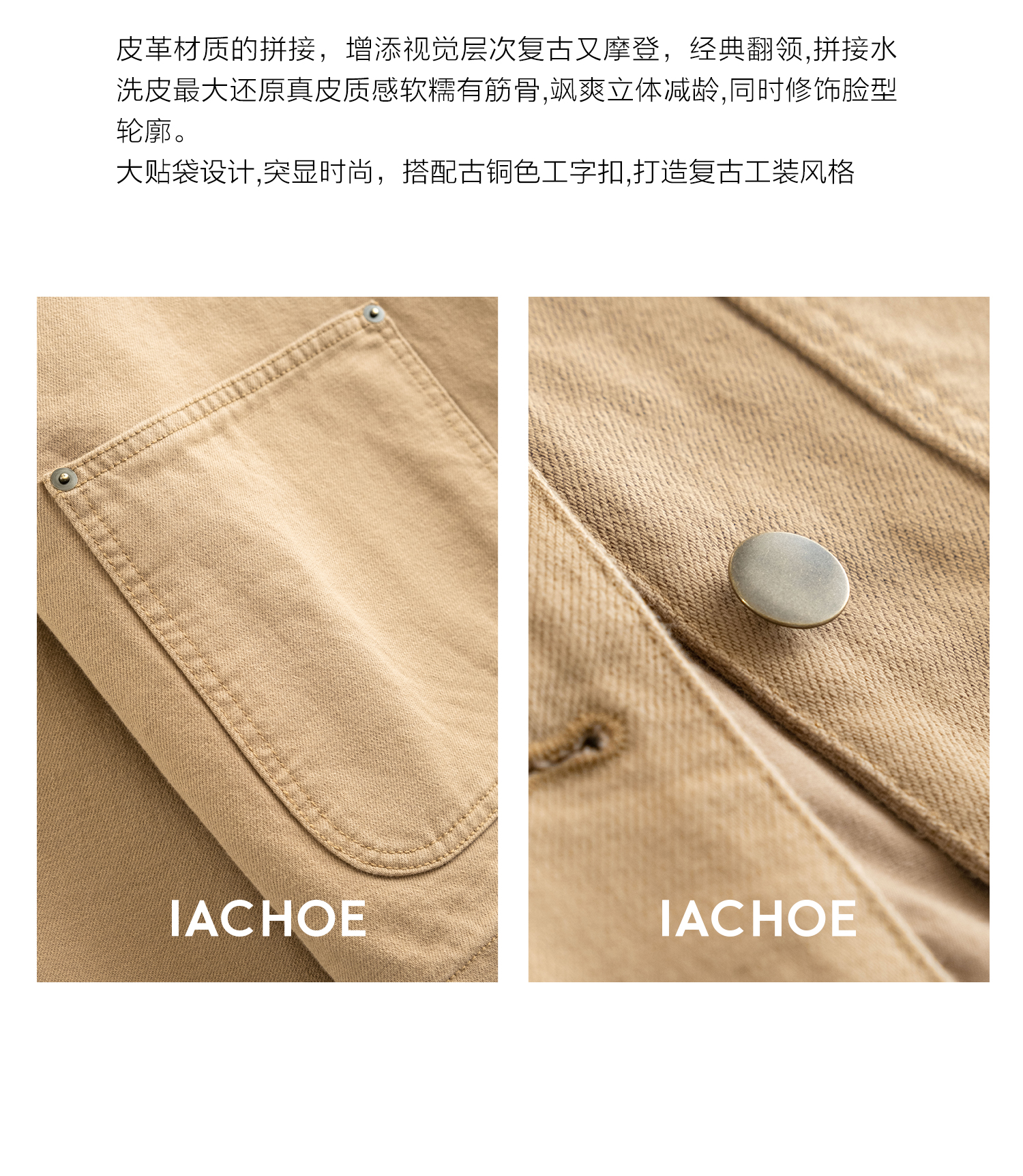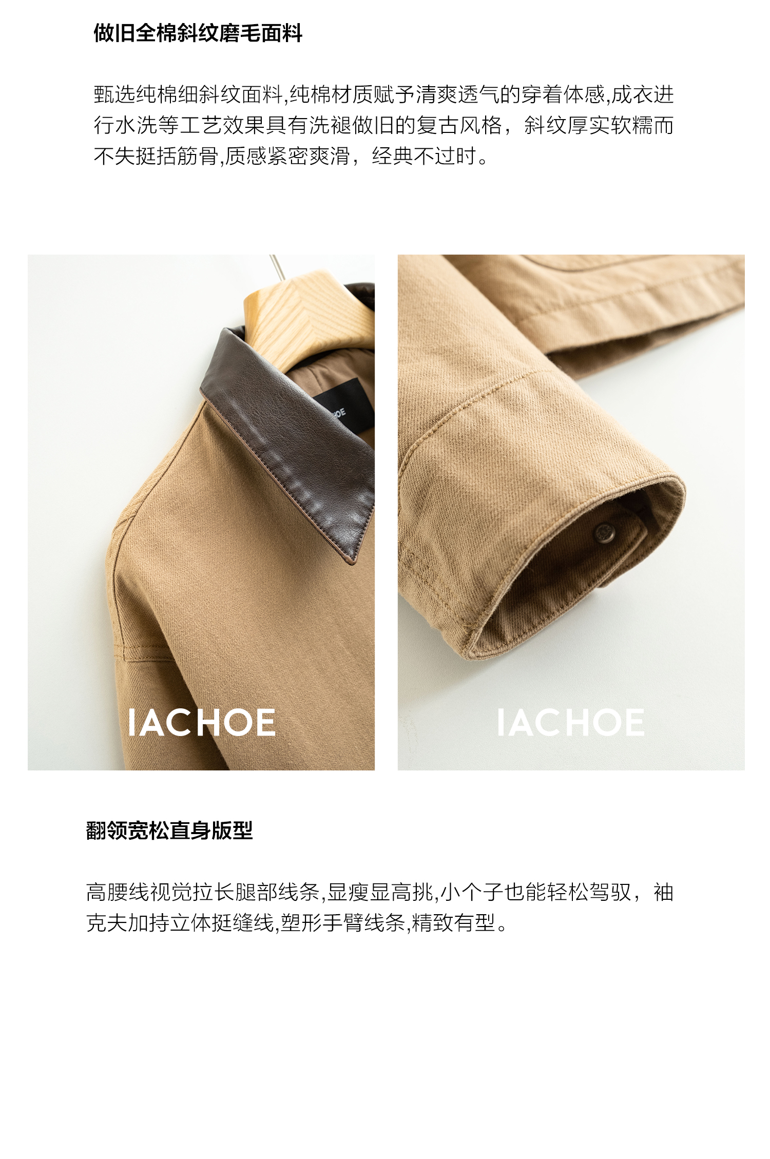 Iachoe bath style 25 autumn lapel leather short loose straight khaki short coat distressed cotton jacket