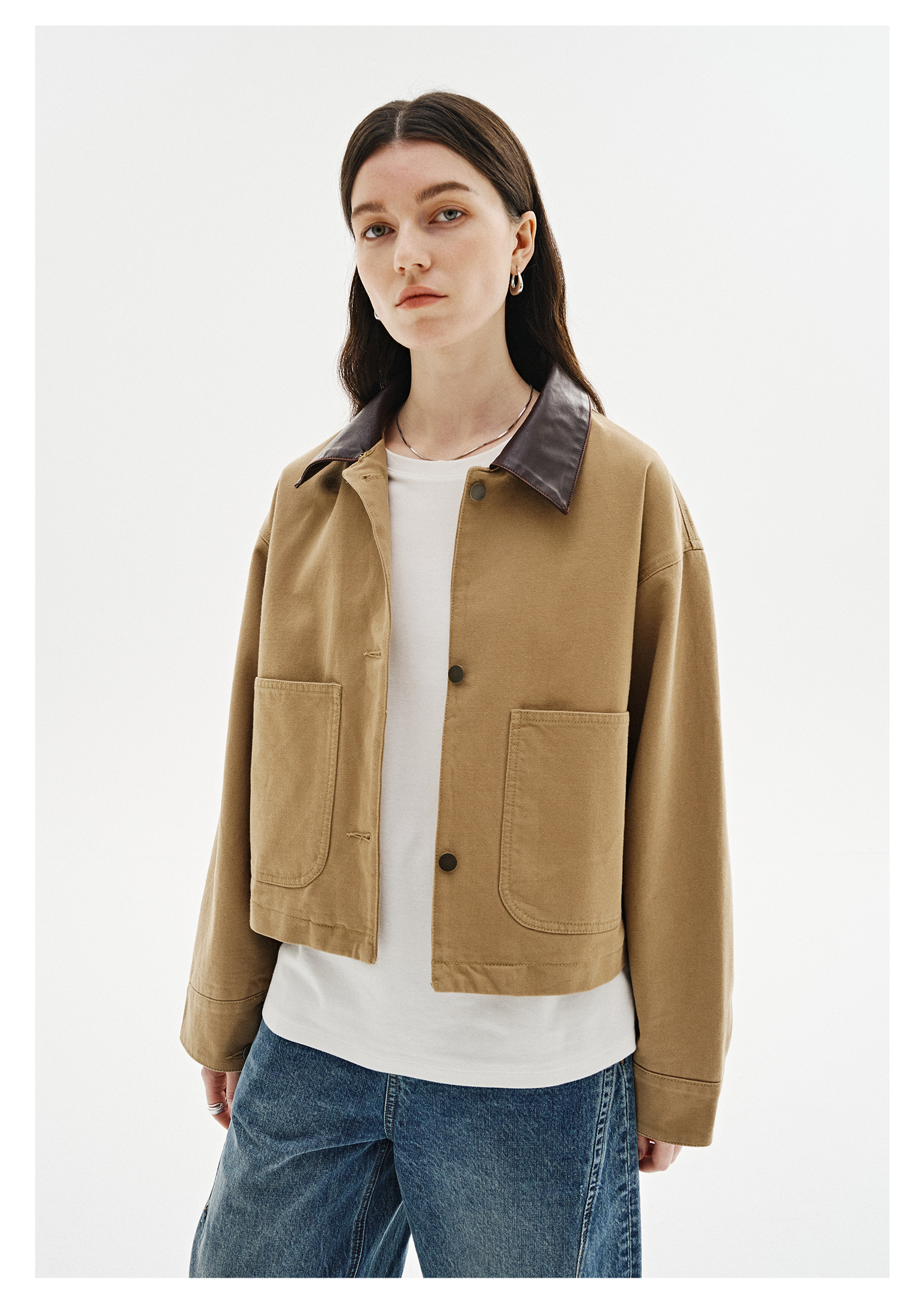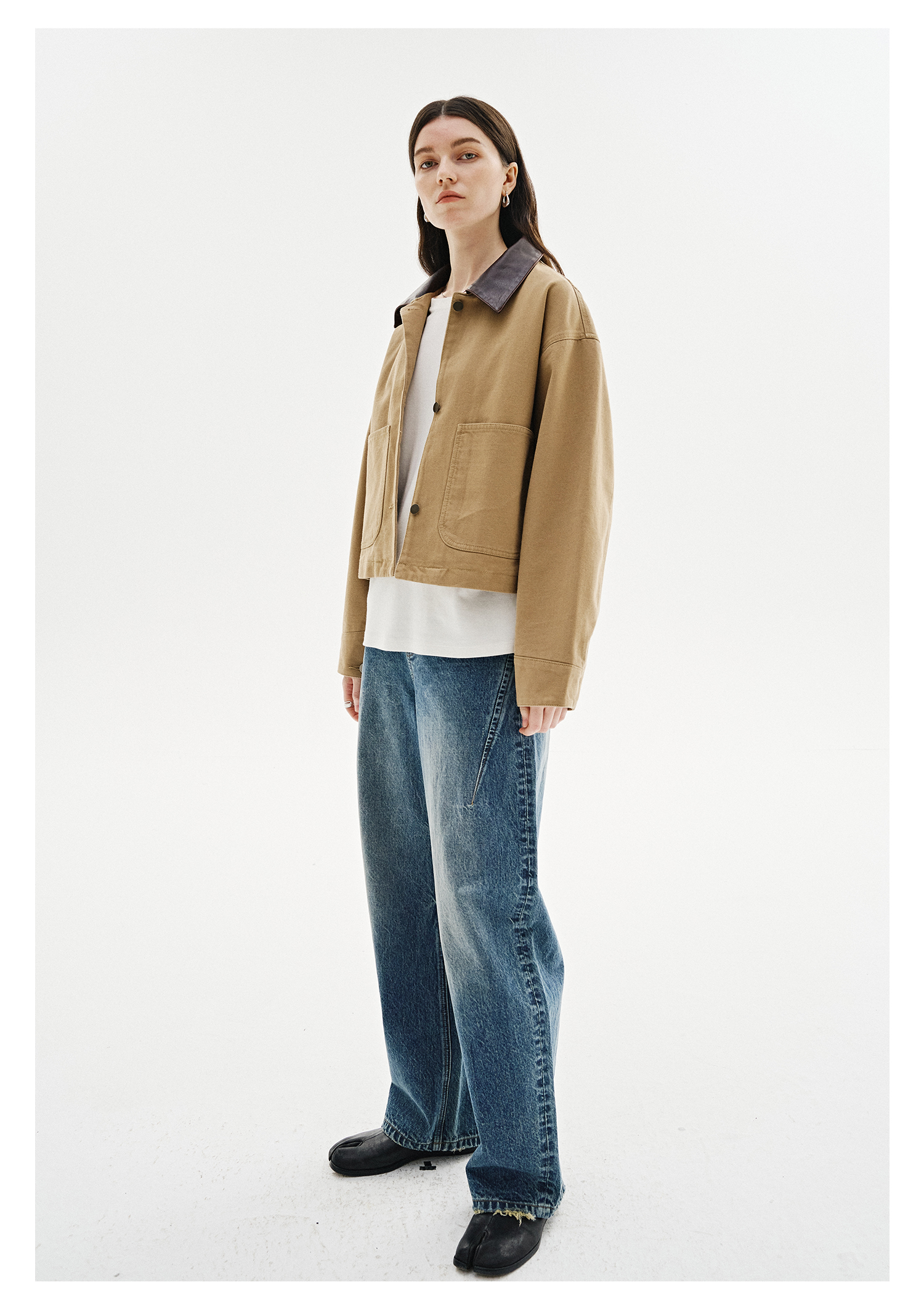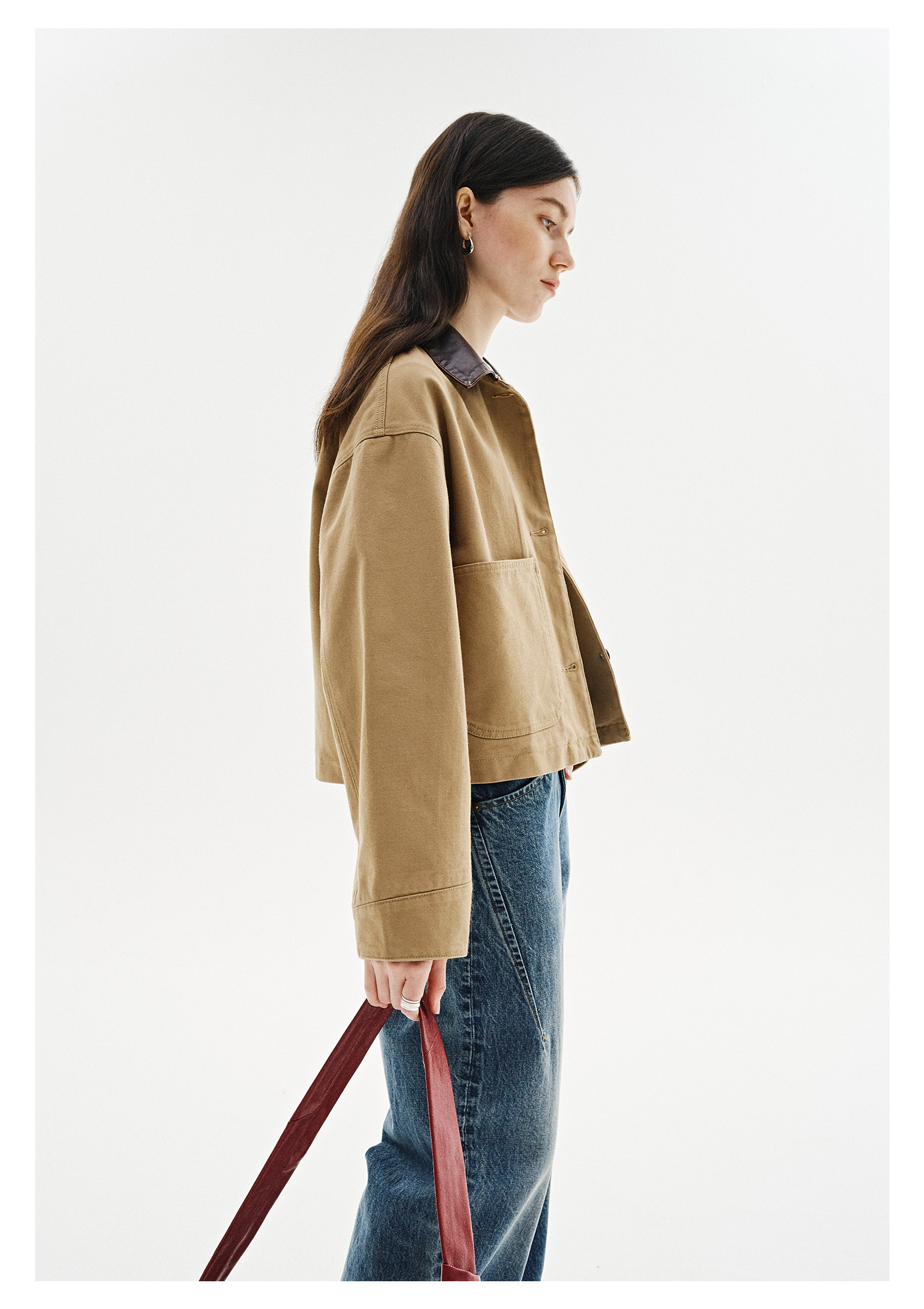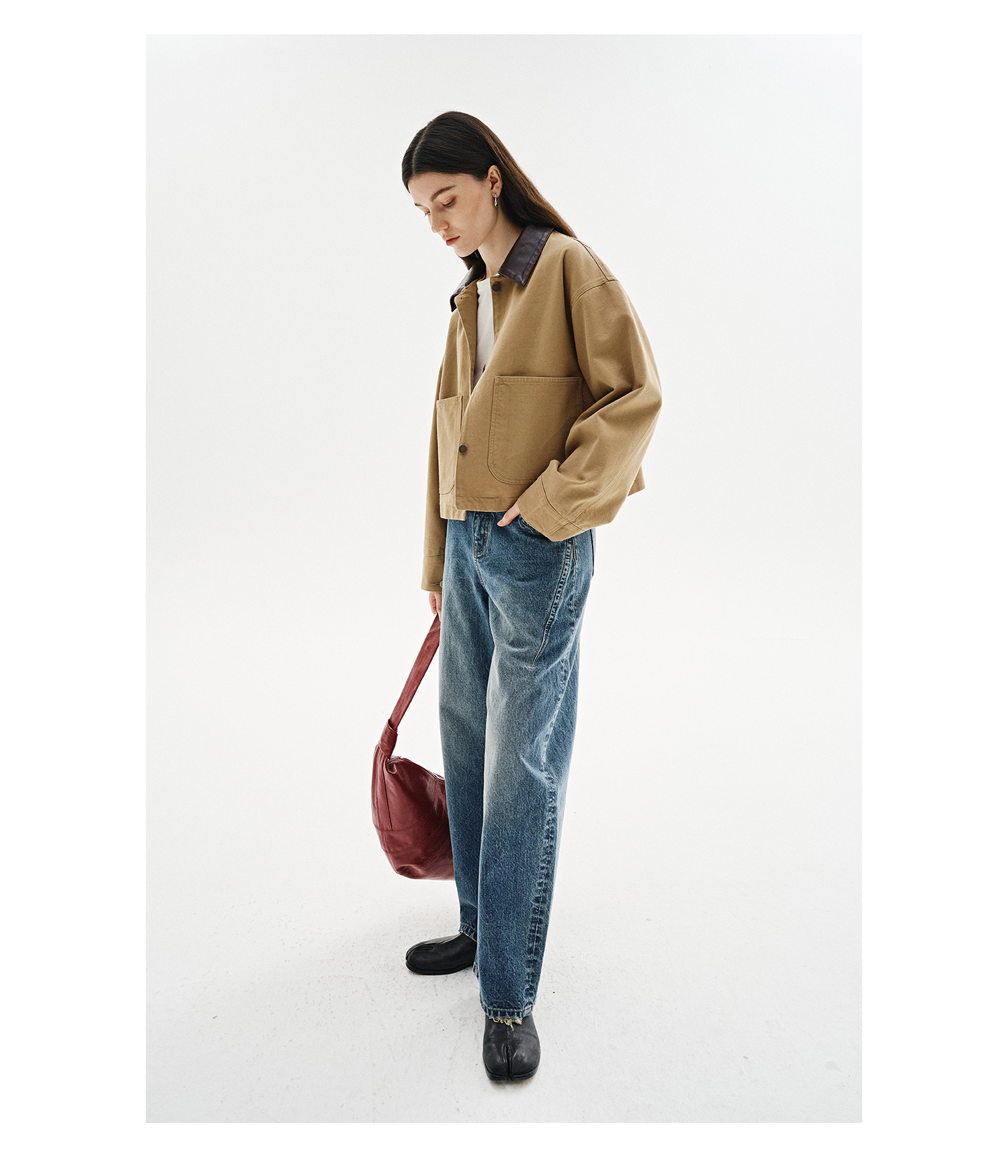 Iachoe bath style 25 autumn lapel leather short loose straight khaki short coat distressed cotton jacket