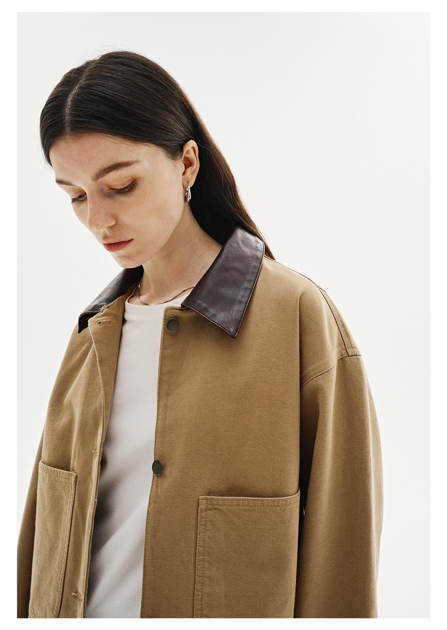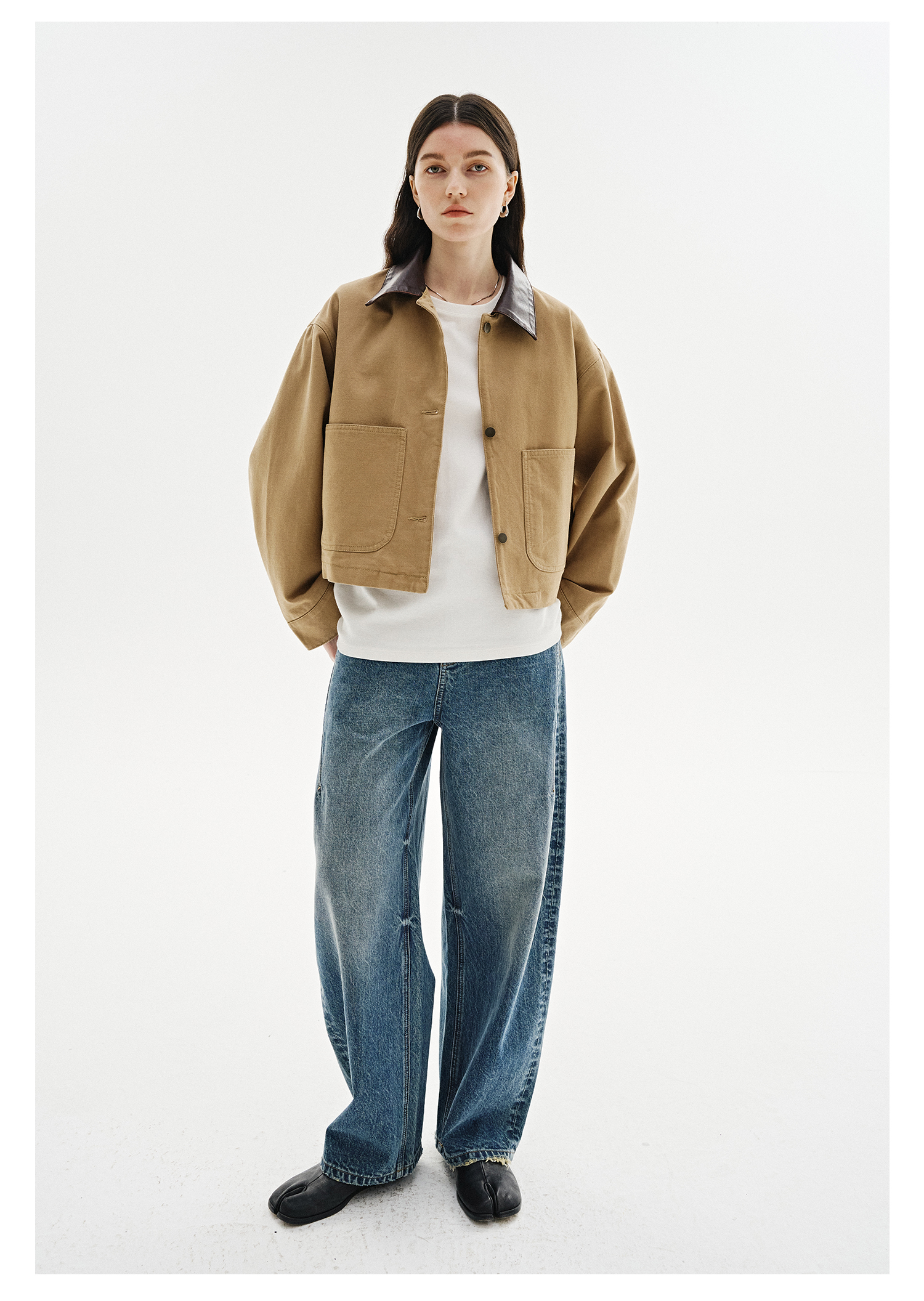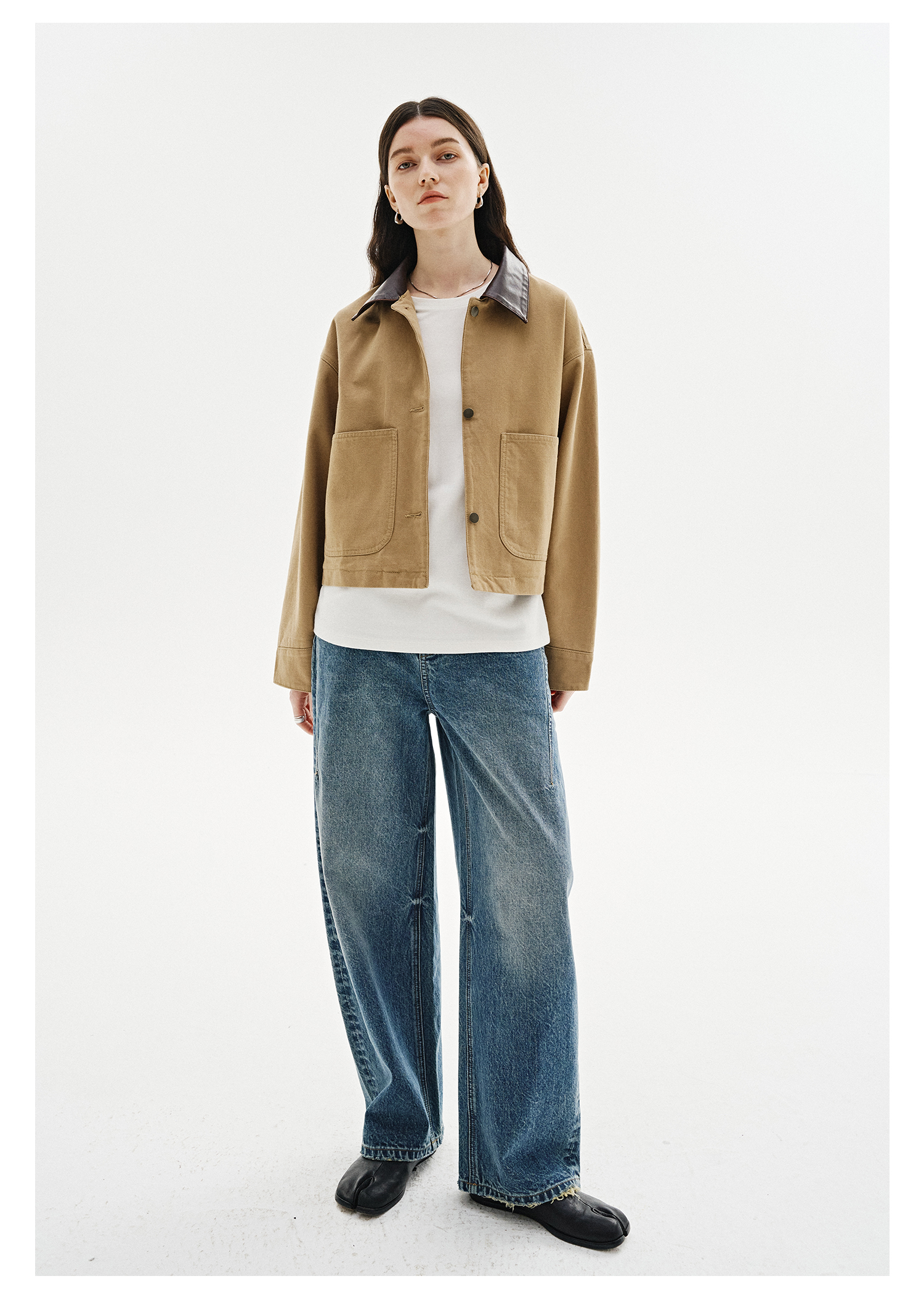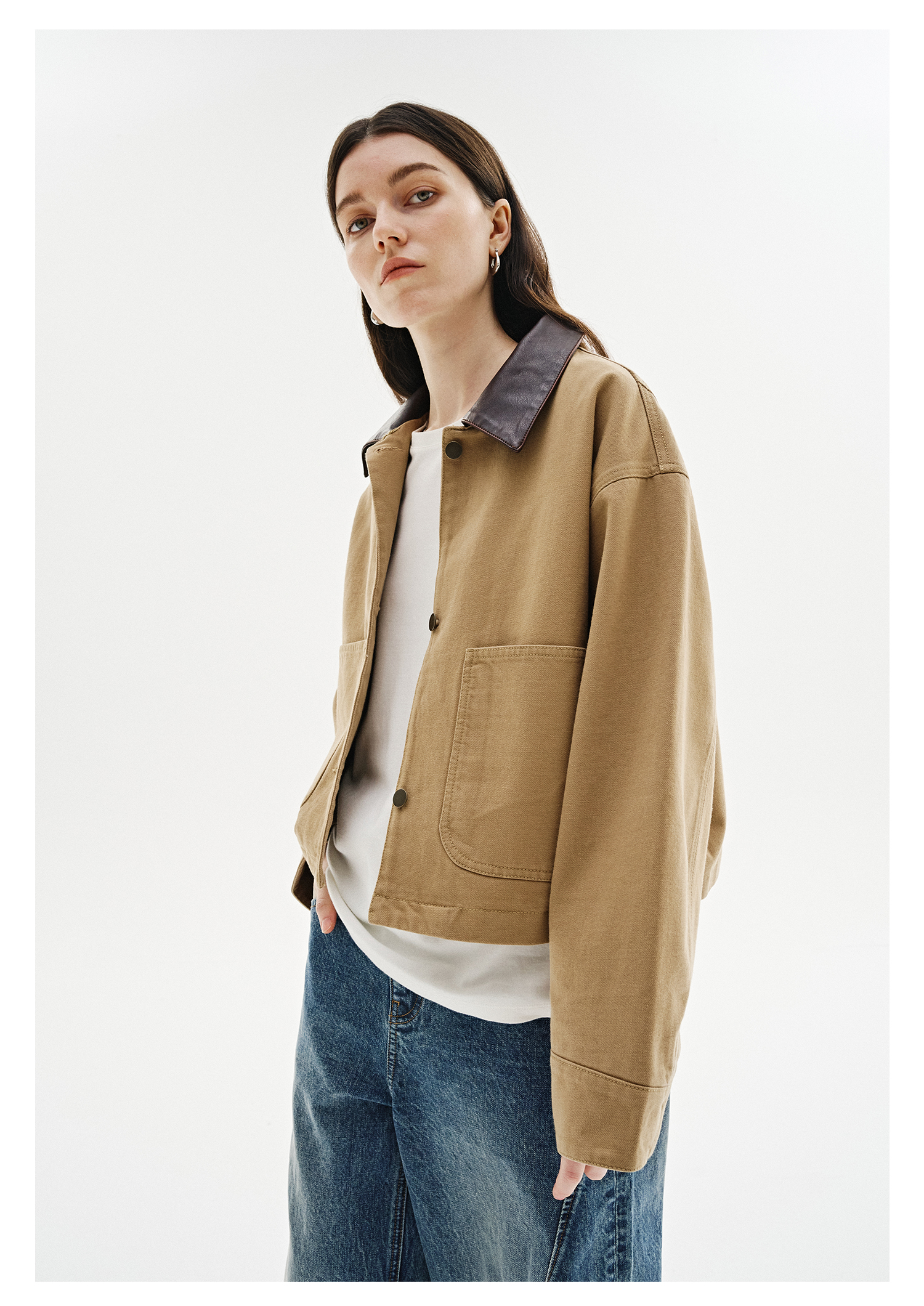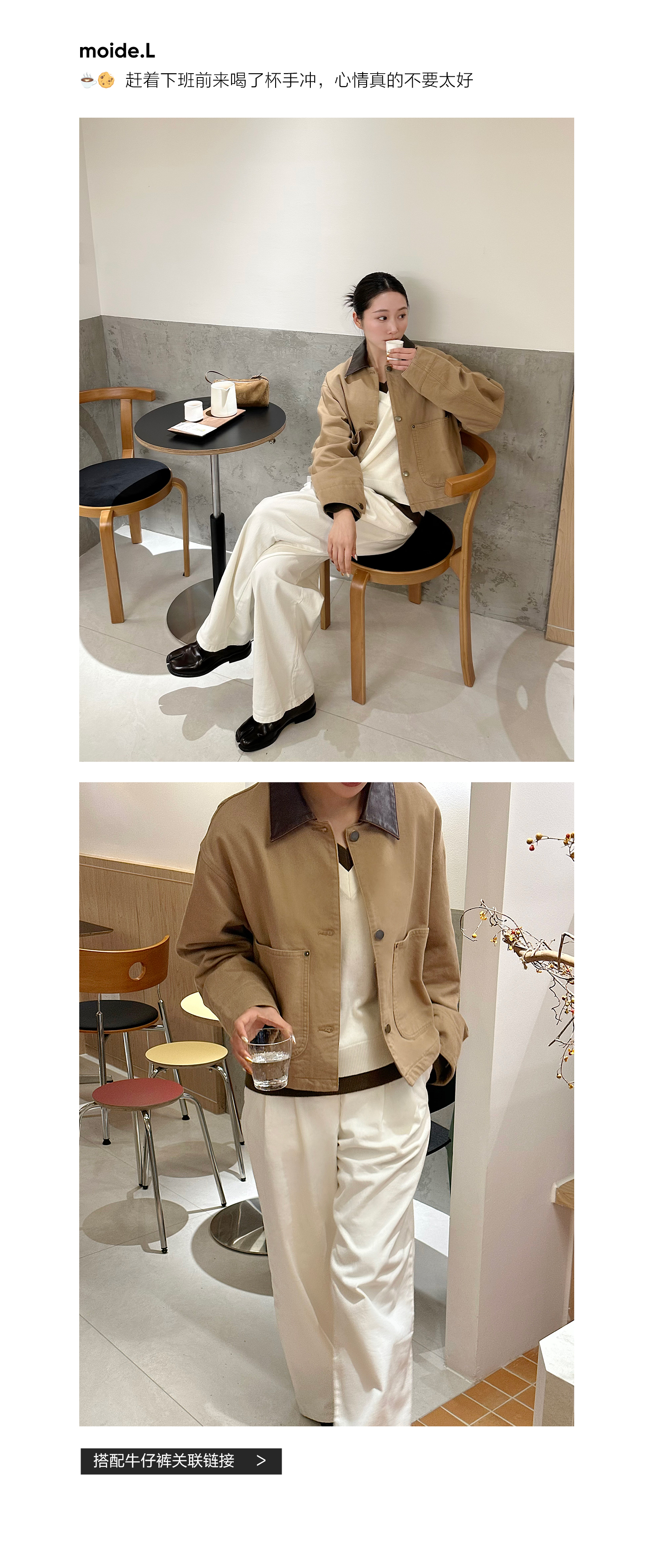 Iachoe bath style 25 autumn lapel leather short loose straight khaki short coat distressed cotton jacket