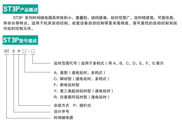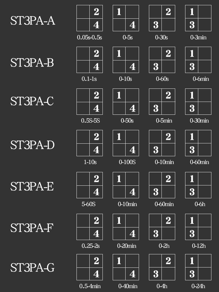 Sort by color ST3PA-A (0.5 seconds/5 seconds/30 seconds/3 minutes),ST3PA-B (1 second/10 seconds/60 seconds/6 minutes),ST3PA-C (1 second/50 seconds/5 minutes/30 minutes),ST3PA-D(10 seconds/100 seconds/10 minutes/60 minutes),ST3PA-E(60 seconds/10 minutes/60 minutes/6 hours),ST3PA-F (2 minutes/20 minutes/2 hours/12 hours)