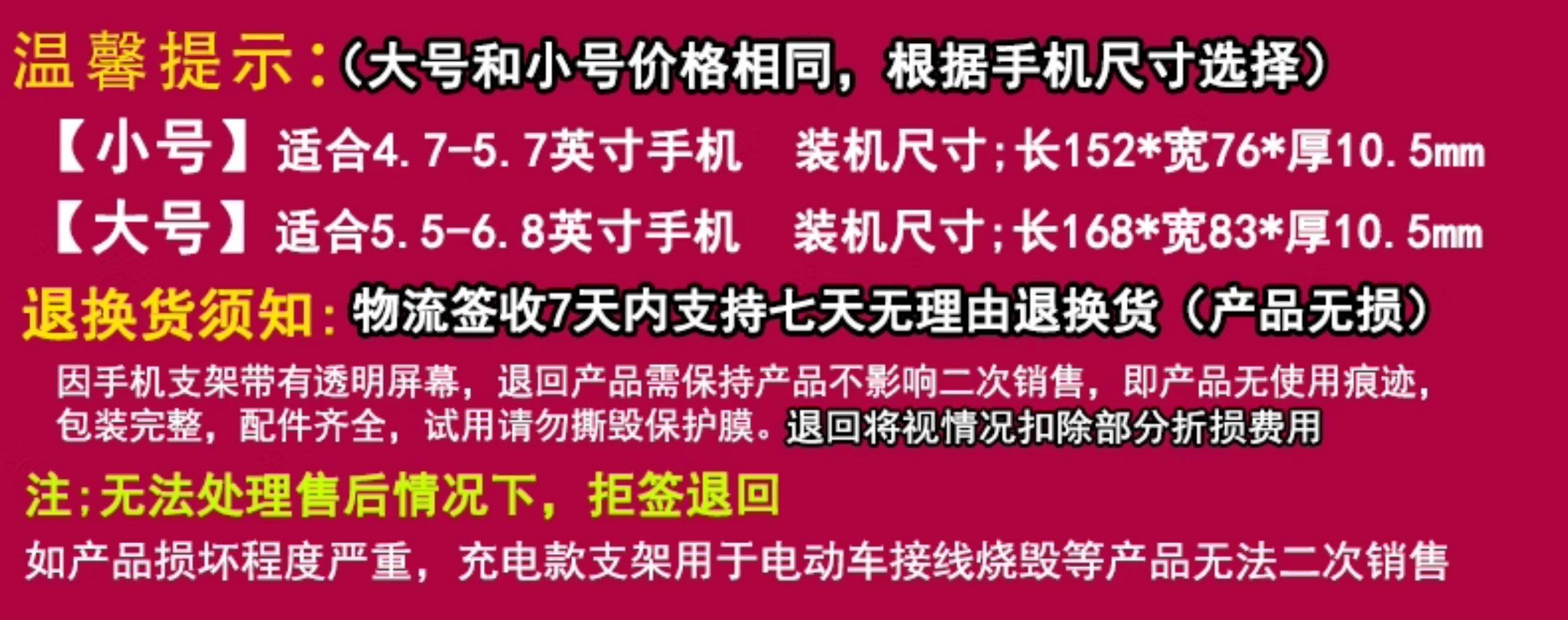 Sort by color Large size suitable for 5.7-6.8 inch mobile phones,Large size - handlebar style,Large size - Rearview mirror type,Large size - upgraded handlebar model (king of sales),Large size -upgraded rearview mirror model,Anti-theft bar large size upgraded handlebar style (recommended by the store manager),Anti-theft bar large size upgraded rear view mirror,Small size suitable for 4.7-5.8 inch mobile phones,Small size - handlebar model,Small size - rear view mirror type,Small size - upgraded handlebar model,Small size - upgraded rearview mirror model,Rechargeable version prohibits electric vehicle wiring (supports USB port power supply),Large wireless + wired charging handlebar style (motorcycle wiring version),Large wireless + wired charging rearview mirror model (motorcycle wiring version),Large wireless + wired charging, upgraded handlebar model (motorcycle wiring version) highly recommended,Large wireless + wired charging upgraded rearview mirror (motorcycle wiring version),Large wireless + wired charging, upgraded handlebar model, anti-theft bar (motorcycle wiring version) recommended,Large wireless + wired charging, upgraded rearview mirror, anti-theft bar (motorcycle wiring version),Small wireless + wired charging handlebar model (motorcycle wiring version),Small wireless + wired charging rearview mirror model (motorcycle wiring version),Small size wireless + wired charging upgraded handlebar model (motorcycle wiring version),Small size wireless + wired charging upgraded rearview mirror (motorcycle wiring version)