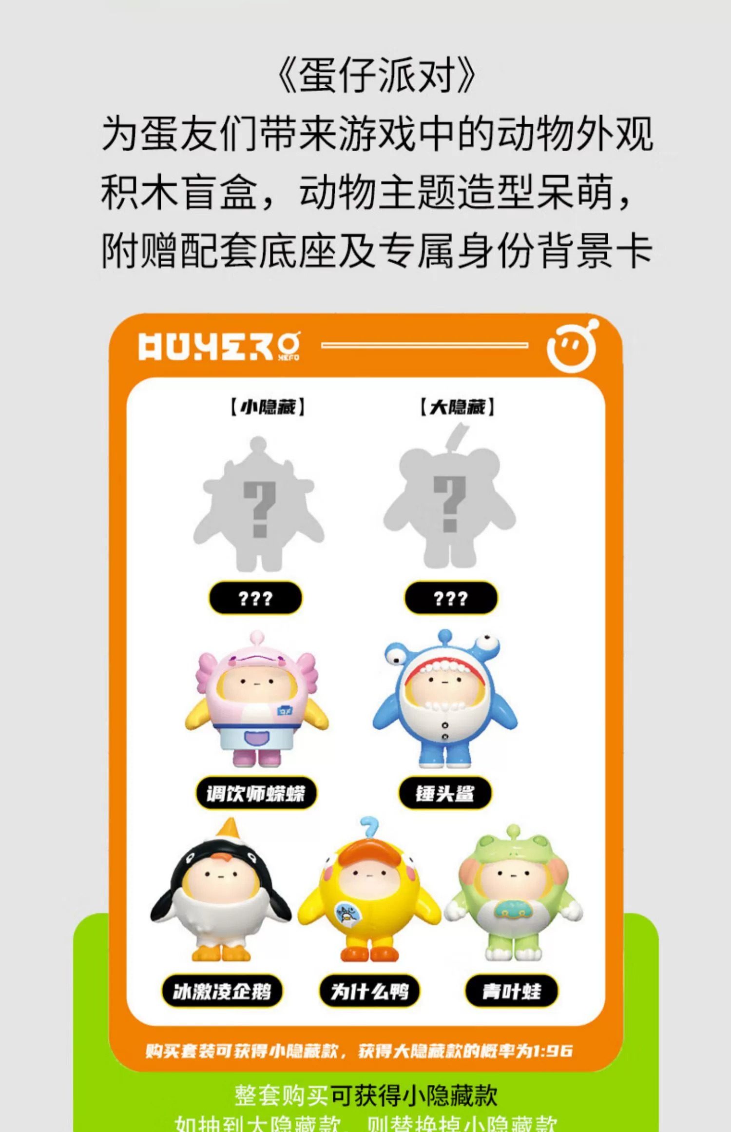 Style description 1 random dress-up of Danzi building blocks,Egg boy building block dress-up random 2 styles,Egg boy building block dress-up 3 random styles,Egg boy building block dressing-up box of 6 styles (not repeated),Egg boy building block dress-up designated model Moo Moo,Egg boy building block dress-up designated model Hammerhead Shark,Egg boy building block dress-up designated model Bartender Salamander,Egg boy building block dress-up designated model Ice Cream Penguin,Egg boy building block dress-up designated model Green Leaf Frog,1 random type of Eggman building blocks and Jenga (delivered within 24 hours),2 random types of Eggman building blocks and Jenga (delivered within 24 hours),3 random types of Eggman building blocks and Jenga (delivered within 24 hours),Eggman building blocks and Jenga in a box of 6 pieces (shipped within 24 hours),Eggman Jenga designated model Ari and Buddy,Eggman Jenga designated model Overload Bear (24 hours delivery),Eggman Jenga designated model Ferretti (24 hours delivery),Eggman Jenga designated version Sleepy Sheep (24 hours delivery),Eggman Jenga Designated Steam Chicken (24 hours delivery),Random 1 type of Danzai party blind box (delivered within 24 hours),Random 2 styles of Danzai party blind boxes (24 hours delivery),Danzai Party Blind Box 3 random styles (shipped within 24 hours),Danzai Party Blind Box Random 4 Styles (Delivery in 24 Hours),Danzai Party Blind Box 8 pieces (24 hours delivery),Red Egg Cubs Party Blind Box Complete Box of 9 Must-Hide Secrets Jingjing,Danzai Party Hidden Model Jingjing (24 hours delivery),Egg Cub Party designated model Jellyfish Lailai (24 hours delivery),Danzai party designated model Tushan Qianqian (24 hours delivery),Egg Cub Party designated model Tyrannosaurus Cub (24 hours delivery),Egg party designated model poached egg (24 hours delivery),Danzai party designated naughty meatballs (shipped within 24 hours),Egg Cub Party designated model Elf Liesl (24 hours delivery),Egg Cub Party designated model Bee Dondong (24 hours delivery)