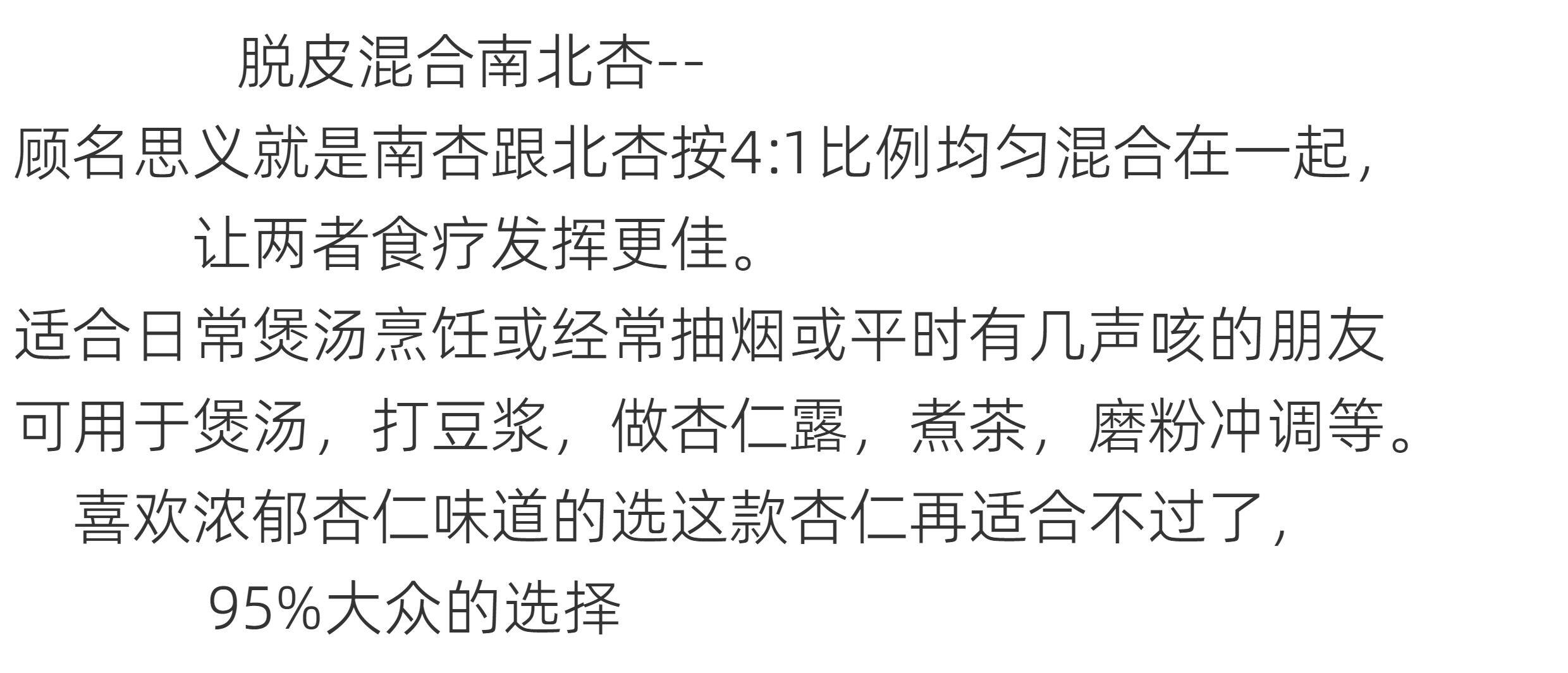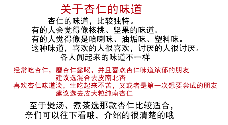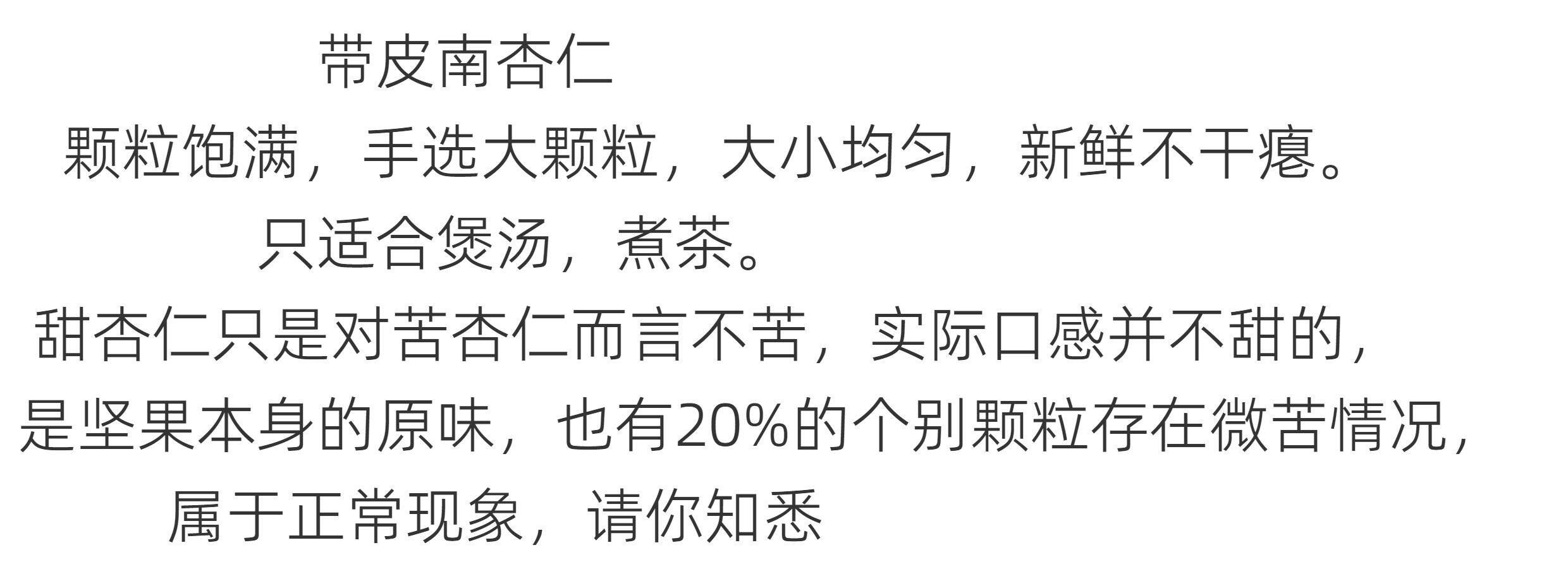 Food flavor Mixed peeled northern and southern almonds 100g,200g mixed peeled northern and southern almonds (for soup),Mixed peeled northern and southern almonds 500g (almond milk),150g large peeled southern almonds,250g large peeled southern almonds (cold and baked),150g of large peeled southern apricots 150g of peeled northern apricots,200g of southern apricots with skin + 50g of northern apricots with skin,250g almonds with skin,250g northern almonds with skin,250g peeled pure northern almonds,North and South Apricot Tiger Milk Mushroom Soup Packets--5 small packs
