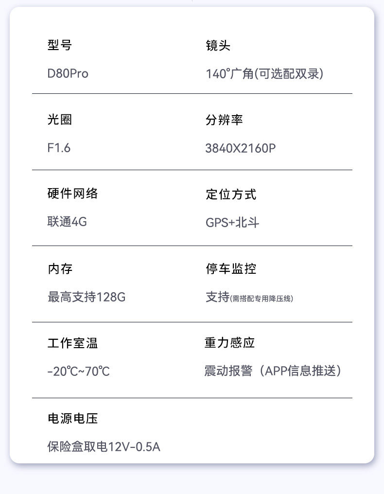 Color Classification D80Pro [Single Lens - Front View - Single Recording] 4K Quality - No Card Included - Free 3-Month Data Plan,D80Pro [Single Lens - Front View - Single Recording] 4K Quality - 64Gb Card Included - 3 Months Free Data,D80Pro [Single Lens - Front View - Single Recording] 4K Quality - 128Gb Card - Includes 3 Months of Free Data,D80Pro [Dual Lens - Front and Rear of the Car - Dual Recording] 4K Image Quality - No Card - Free 3 Months of Traffic,D80Pro [Dual Lens - Front and Rear of the Car - Dual Recording] 4K Image Quality - 64g Card - Free 3 Months of Traffic,D80Pro [Dual Lens - Front and Rear of the Car - Dual Recording] 4K Image Quality - 128g Card - Free 3 Months of Traffic,D80Pro [Dual Lens - Front and Inside the Car - Dual Recording] 4K Image Quality - No Card - Free 3 Months of Traffic,D80Pro [Dual Lens - Front and Inside the Car - Dual Recording] 4K Image Quality - 64g Card - Free 3 Months of Traffic,D80Pro [Dual Lens - Front and Inside the Car - Dual Recording] 4K Image Quality - 128g Card - Free 3 Months of Traffic