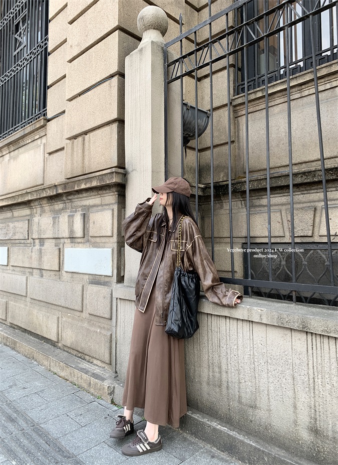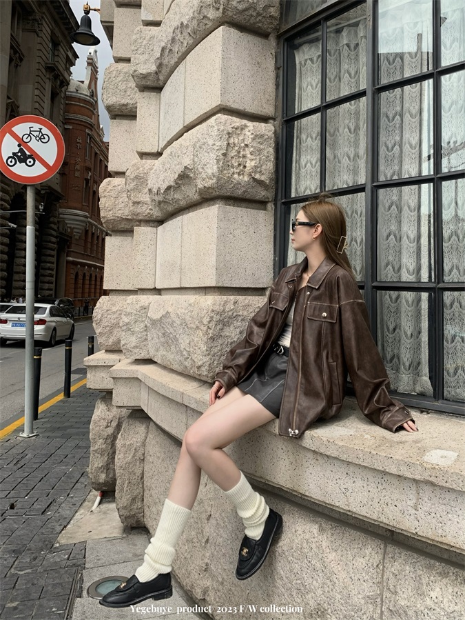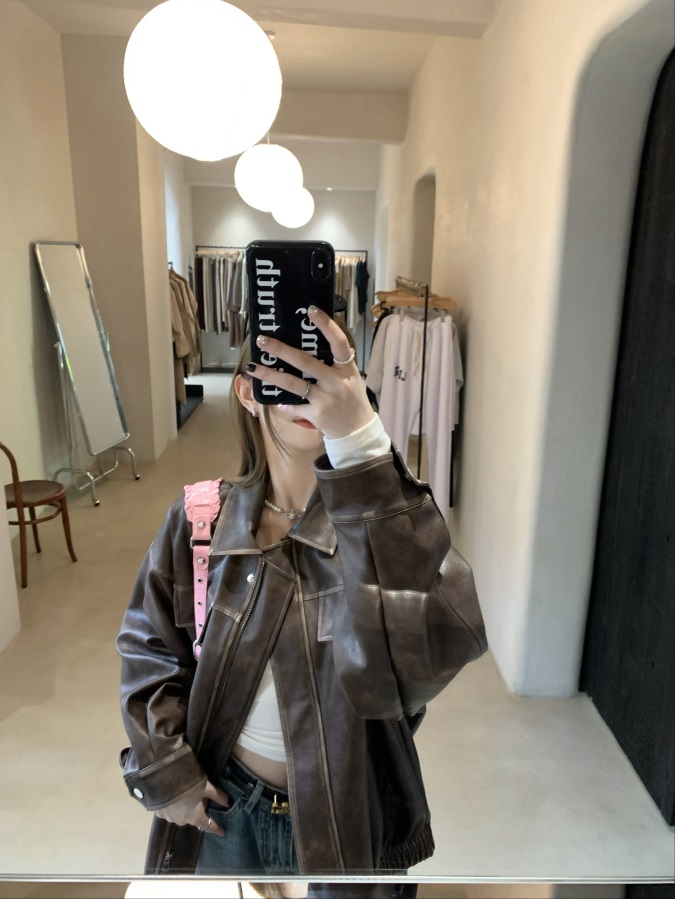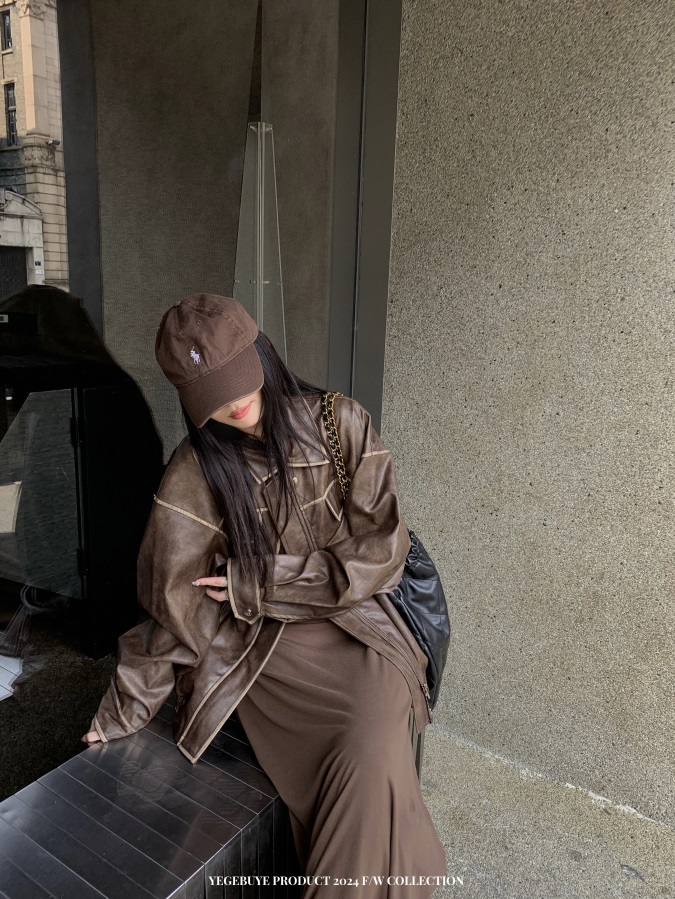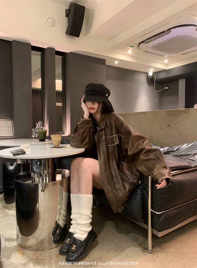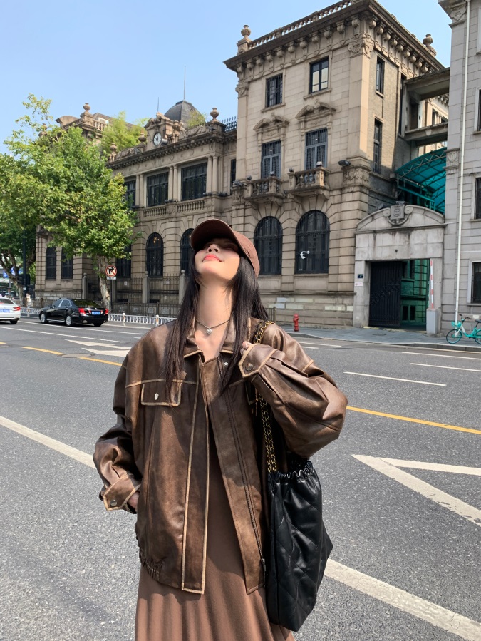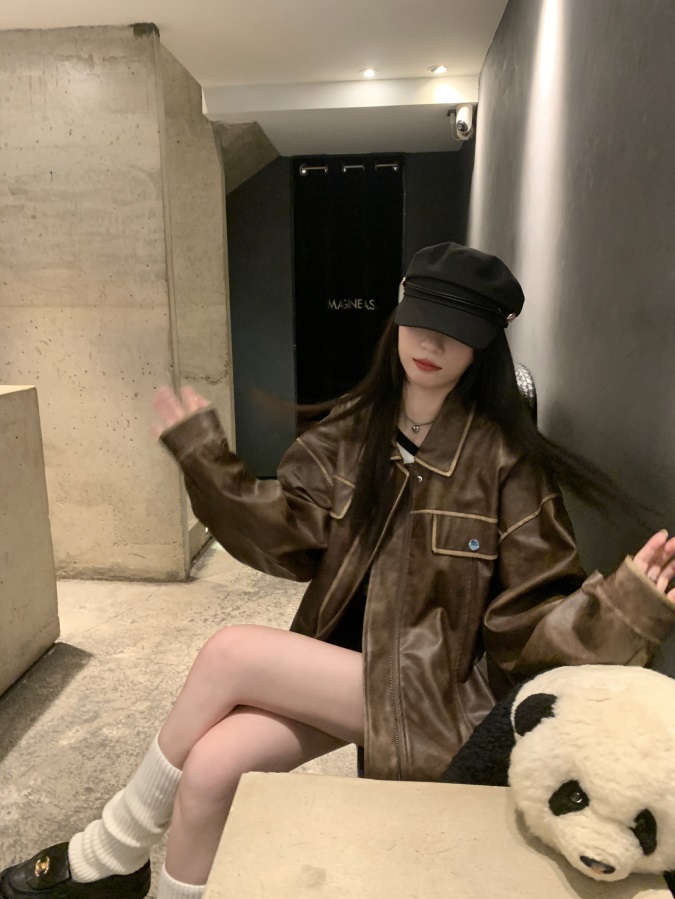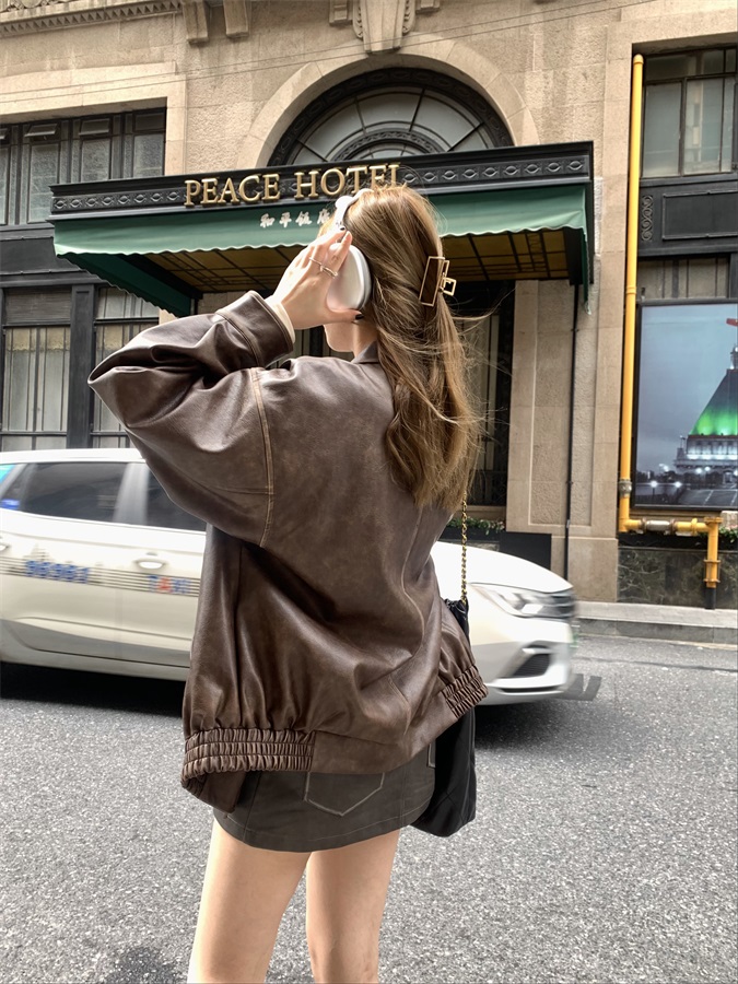 Yige Buye Brown Leather Jacket for Women, High-End Spring and Autumn Design, Vintage Loose Short Casual Jacket