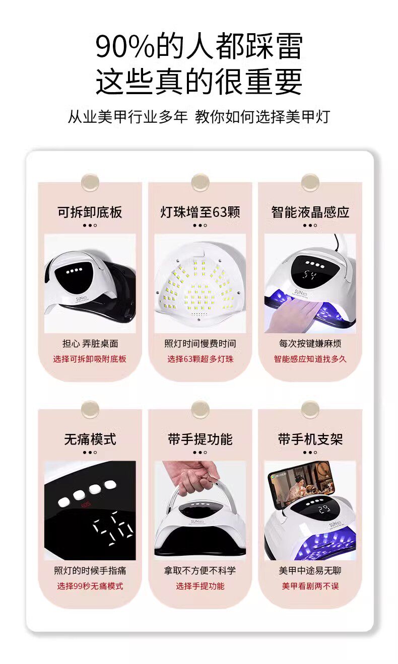 Sort by color Plug-in model Sunshine No. 1 (white) 48W30 lamp,Plug-in model Sunshine No. 1 (Pink) 48W30 lamp,USB interface Sunshine No. 1 (white) 48W30 lamp, no base plate,USB interface Sunshine No. 1 (Pink) 48W30 lamp, no bottom plate,USB interface (white) 45W15 lamp, can hold mobile phone, no base plate,USB digital display SUNXPLUS (white) 72W24 lamp, no bottom plate,Plug-in digital display SUNXPLUS (white) 120W36 lamp,Plug-in display model SUNXMAX (white) 180W45 lamp, LCD display,5 seconds quick drying 288W portable + mobile phone 63 lights,5 seconds quick drying 298W SUNC2 72 lights,5 seconds quick drying 298W SUNC3 72 lights,5 seconds quick drying 288W two-hand lamp 63 lamp,Battery storage model, one-word lamp, power 180mAh,Battery display model, one-line lamp, power 180mAh,Plug-in red light SUNXMAX (white) 180W45 light,Plug-in red light hand lamp, 5 seconds quick drying 288W63 lamp,USB interface Sunshine No. 1 (porcelain white),USB interface Sunshine No. 1 (Spring Peach Powder),USB interface Sunshine No. 1 (terraced green),USB interface Sunshine No. 1 (azure blue),USB interface Sunshine No. 1 (Zhu Shi Cheng),Plug-in model Sunshine No. 1 porcelain white with base plate,Plug-in model Sunshine No. 1 Spring Peach Pink with bottom plate,Plug-in model Sunshine No. 1 terrace green with base plate,Plug-in model Sunshine No. 1 Sky Blue with base plate,Plug-in model Sunshine No. 1 Zhu Shi Orange with base plate